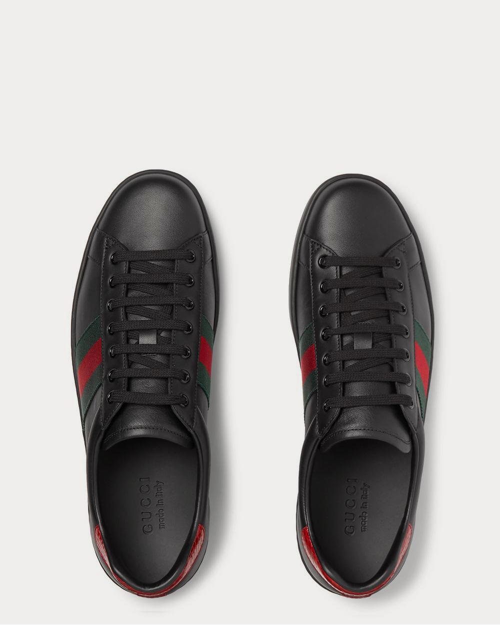 Les baskets « Ace » de Gucci ont été lancées en 2016 et ont été portées au fil des ans par des personnalités comme Justin Timberlake, Eddie Redmayne et A$AP Rocky. Fabriquées en Italie avec une tige en cuir noir et des languettes de talon dépareillées en serpent d’eau, elles sont ornées de la bande rayée emblématique de la marque et reposent sur des semelles en caoutchouc pour une meilleure adhérence.