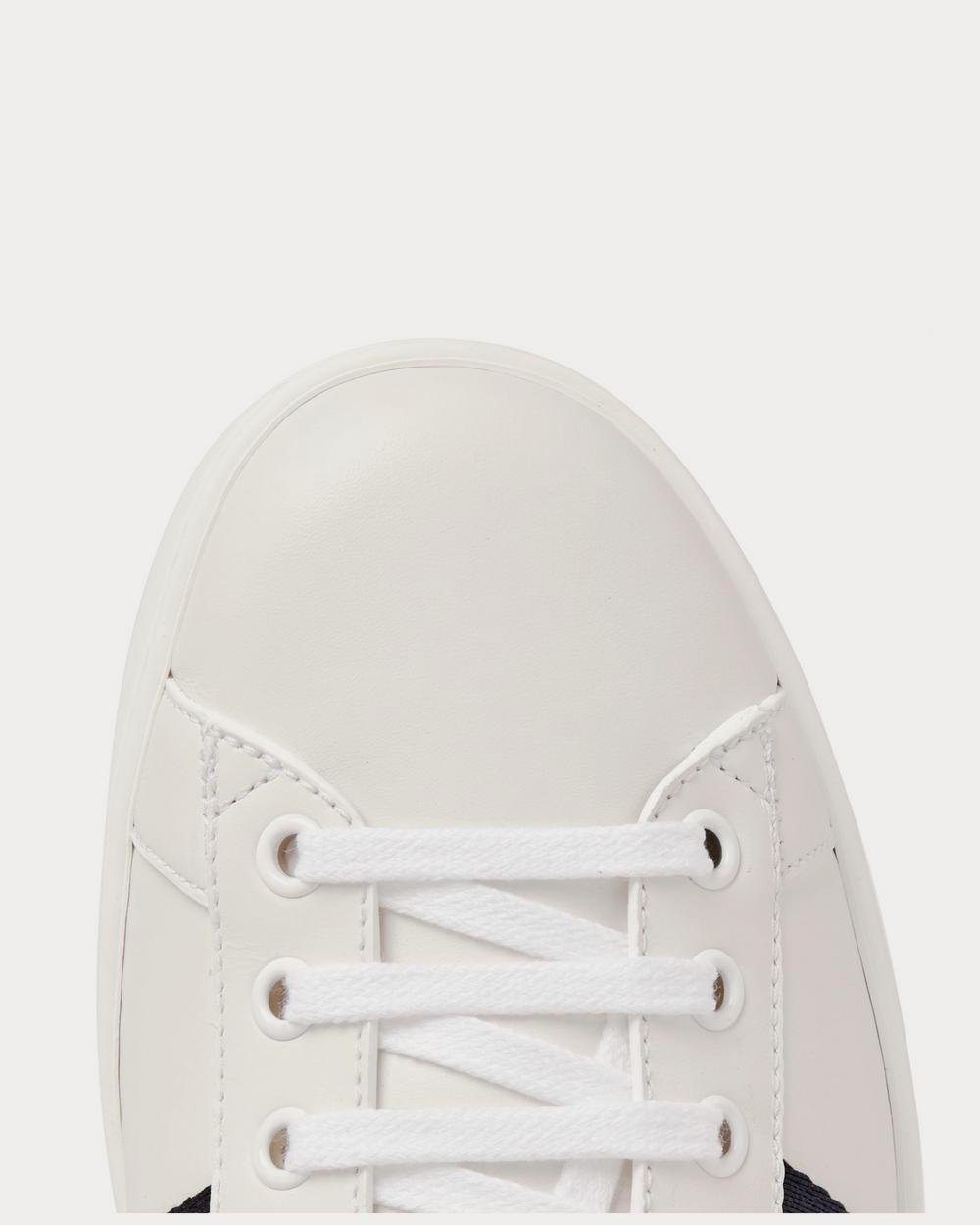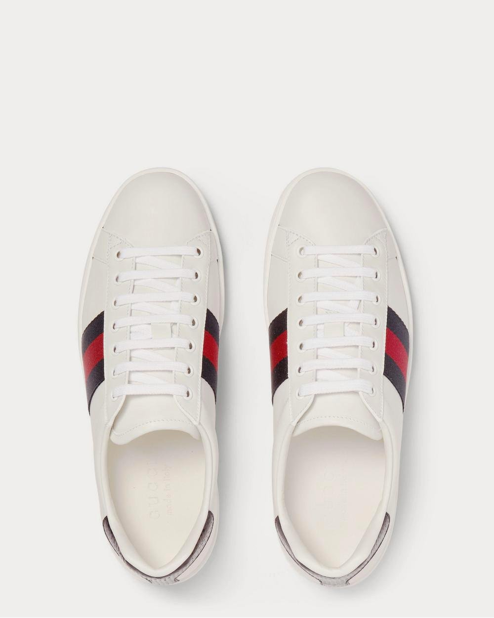 Revisitées en bleu marine et rouge sur ces baskets « Ace », les bandes rayées de Gucci existent depuis les années 50. Cette paire blanche inspirée du tennis est confectionnée en Italie en cuir lisse avec des languettes de talon en serpent d’eau et des semelles en caoutchouc souples. Leur silhouette minimaliste leur permet de s’associer aussi bien à un pantalon habillé qu’à un jean ou un jogging.