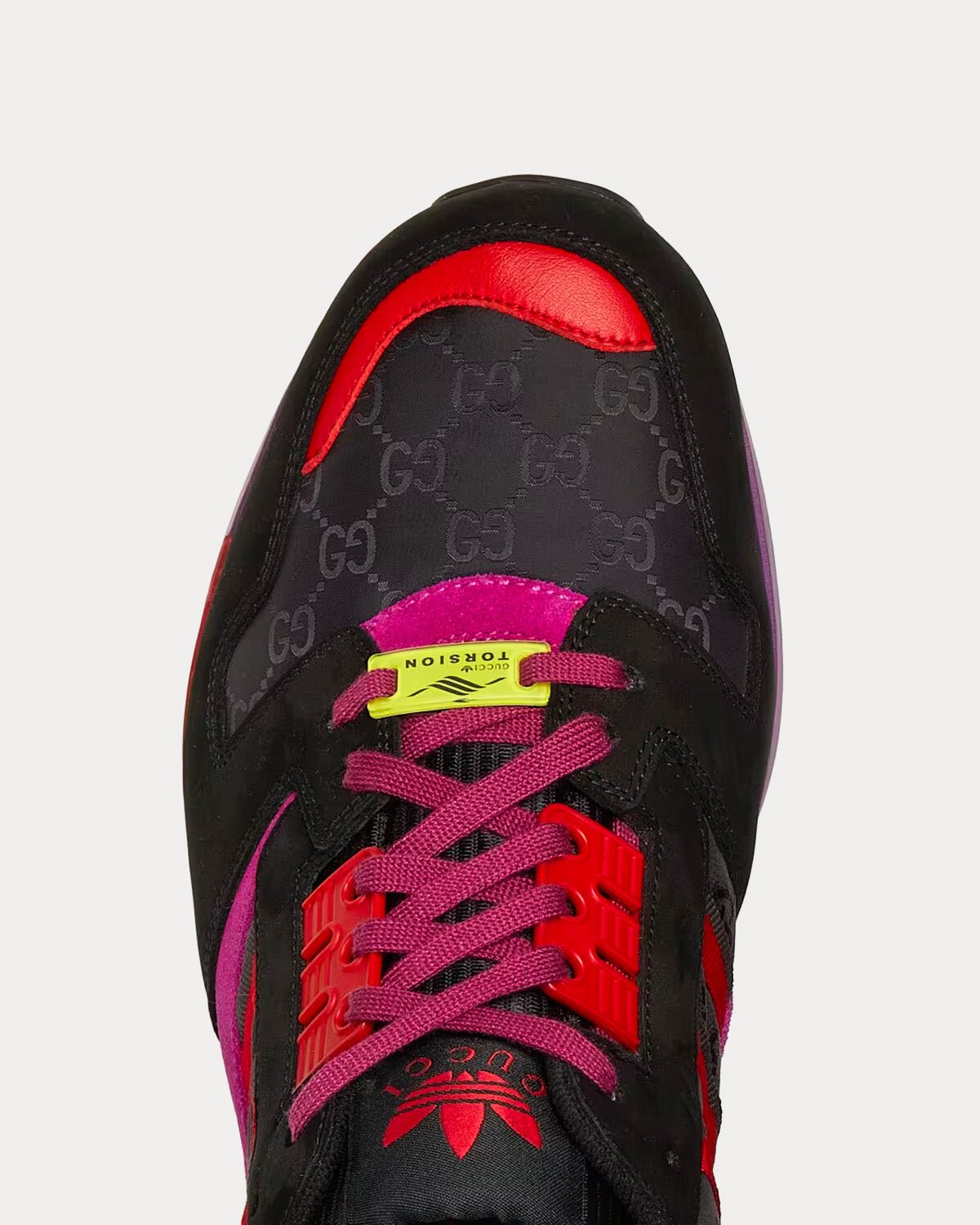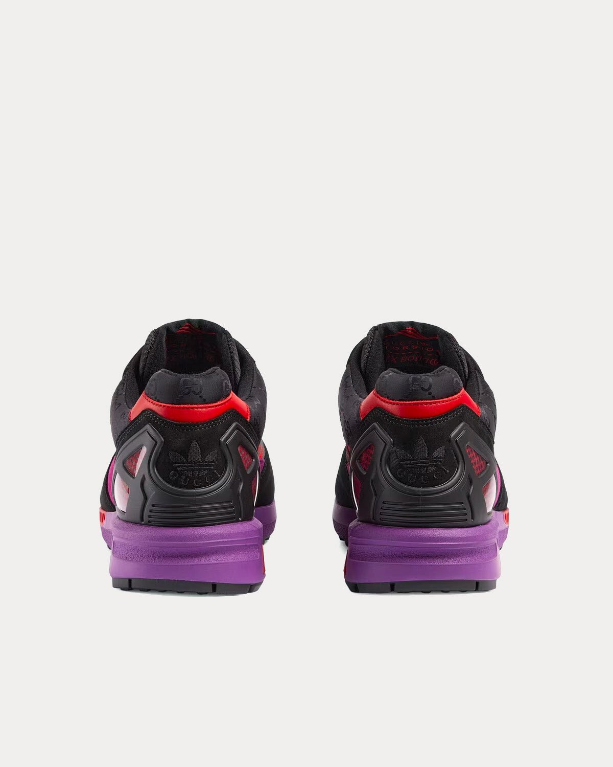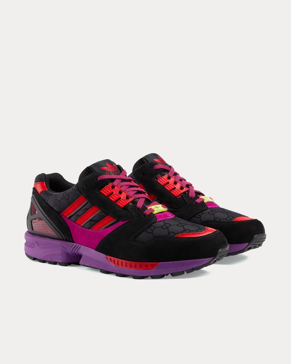 Les Adidas x Gucci ZX8000 pour homme en daim noir et violet et toile GG arborent les 3 bandes, l’étiquette Gucci Trèfle Torsion et la broderie Gucci Trèfle. Fabriquées en Italie.