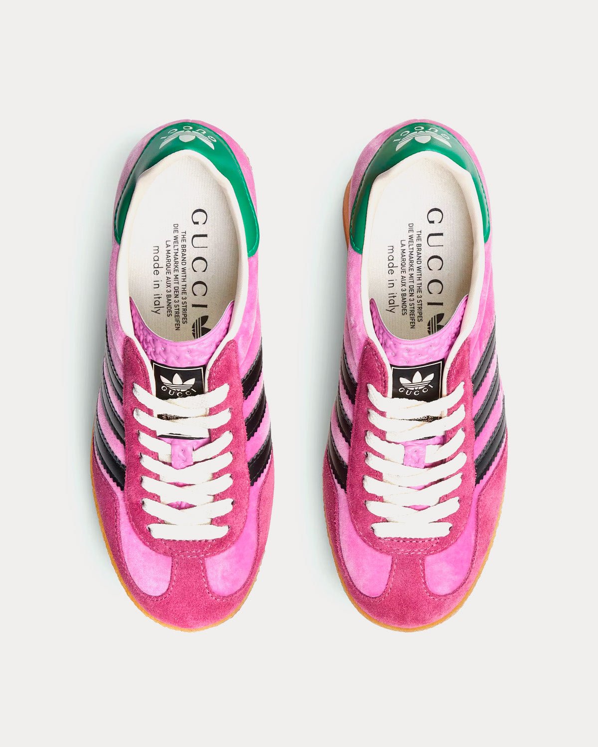 Adidas et Gucci s’aventurent dans une collection où la toile se juxtapose aux trois bandes blanches, et où le monogramme GG se combine au trèfle. S’inspirant des souvenirs des années 80 et 90 du directeur artistique, les motifs emblématiques de la Maison se mêlent à ceux de la marque de sportswear historique adidas, créant ainsi une série de looks hybrides. Cette sneaker Gazelle est ornée du Trèfle Gucci.