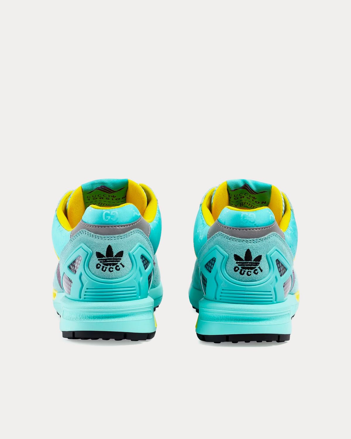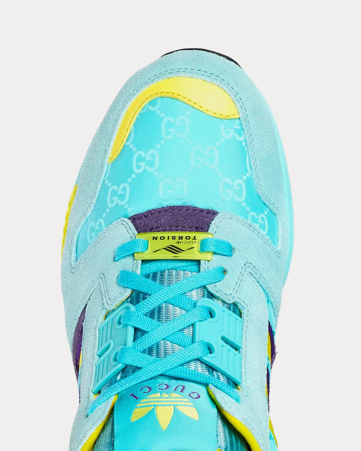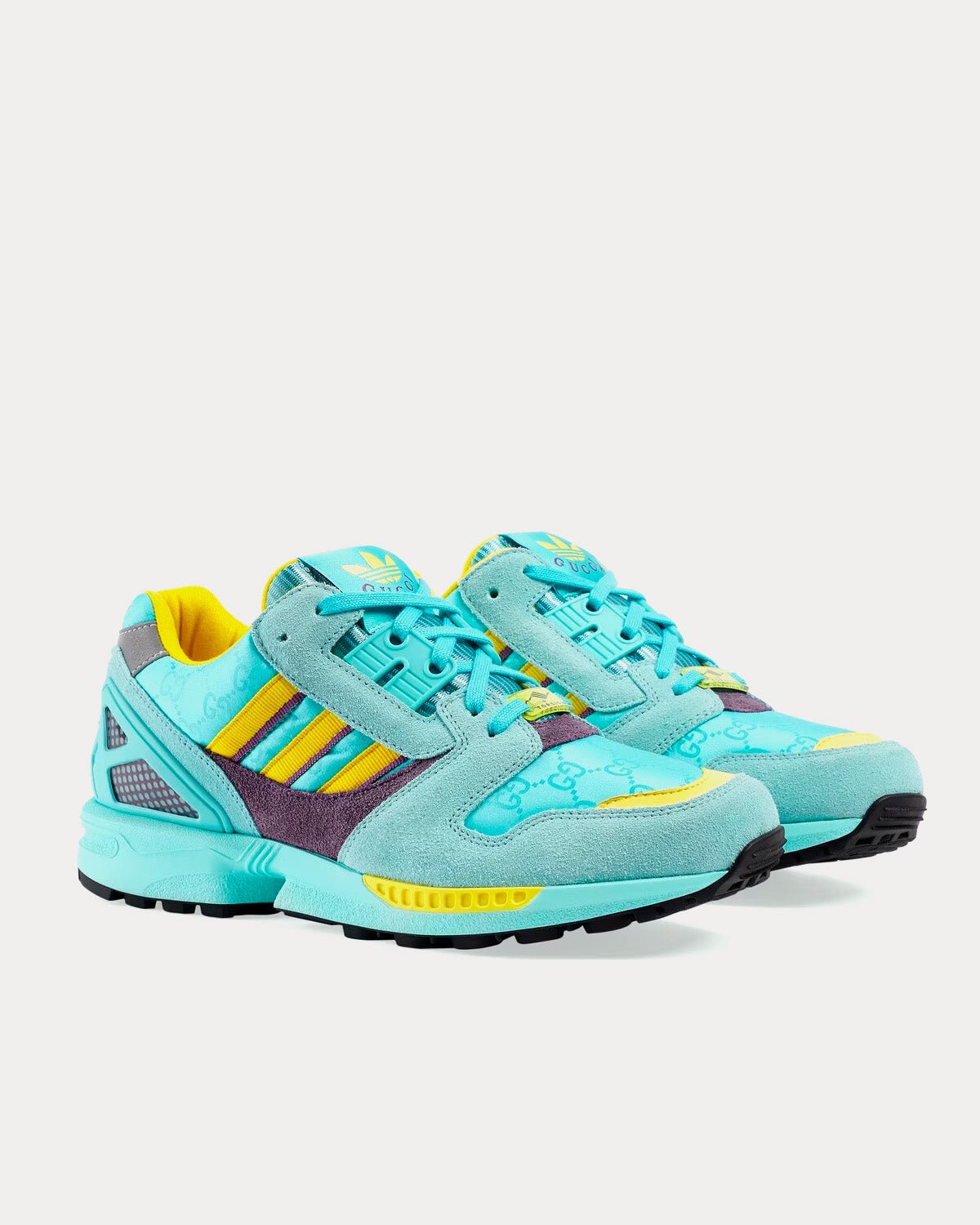 Les Adidas x Gucci ZX8000 pour femme en daim aigue-marine et toile GG arborent les 3 bandes, l’étiquette Gucci Trefoil Torsion et la broderie Gucci Trefoil. Fabriquées en Italie.