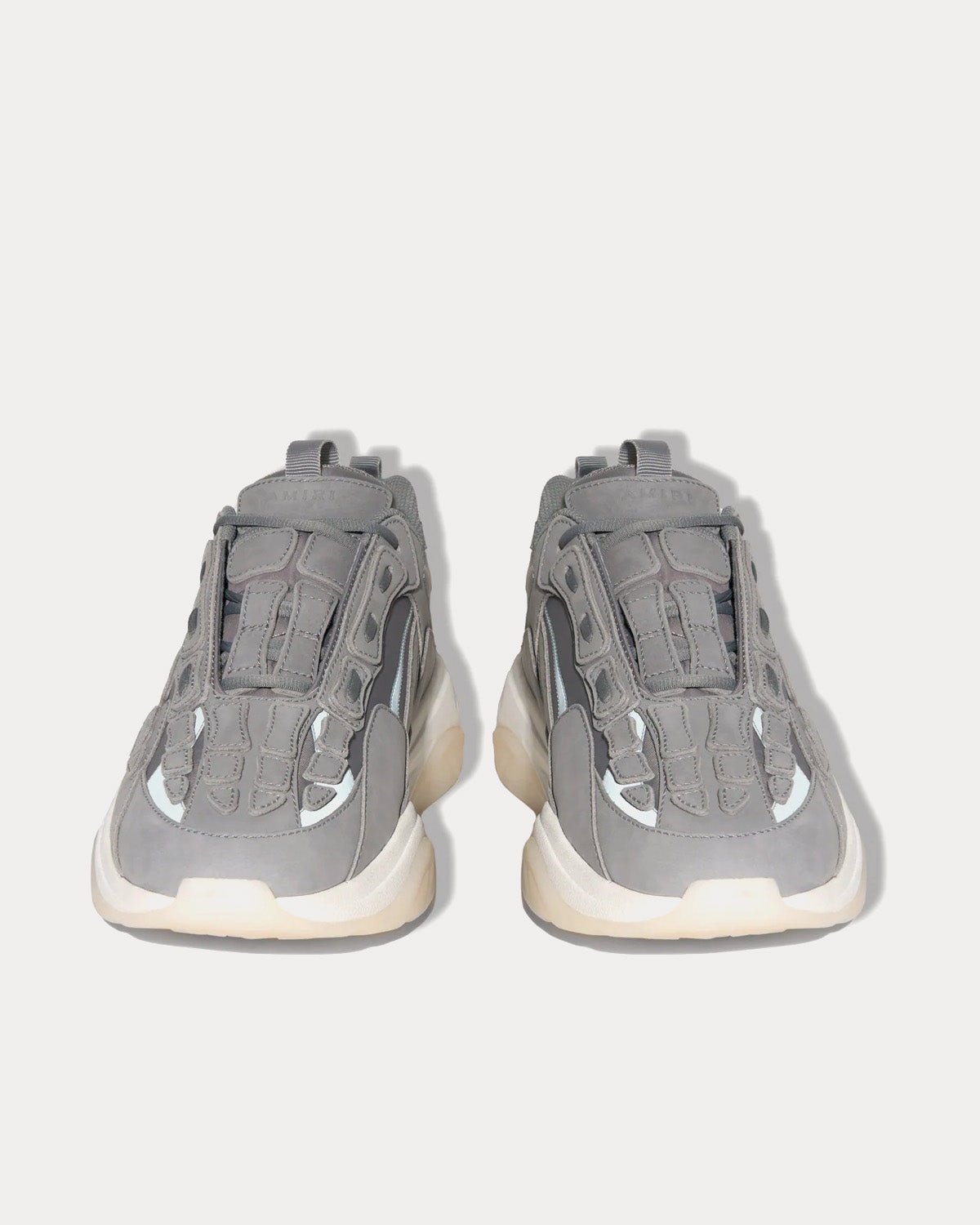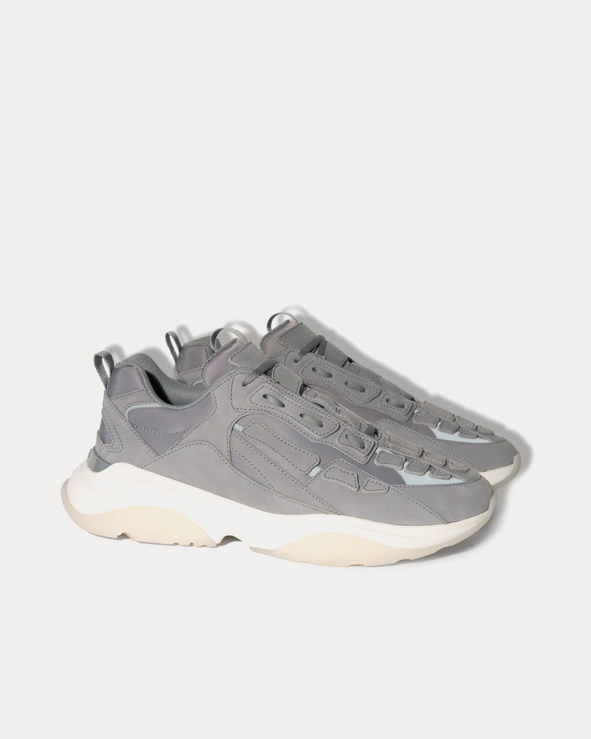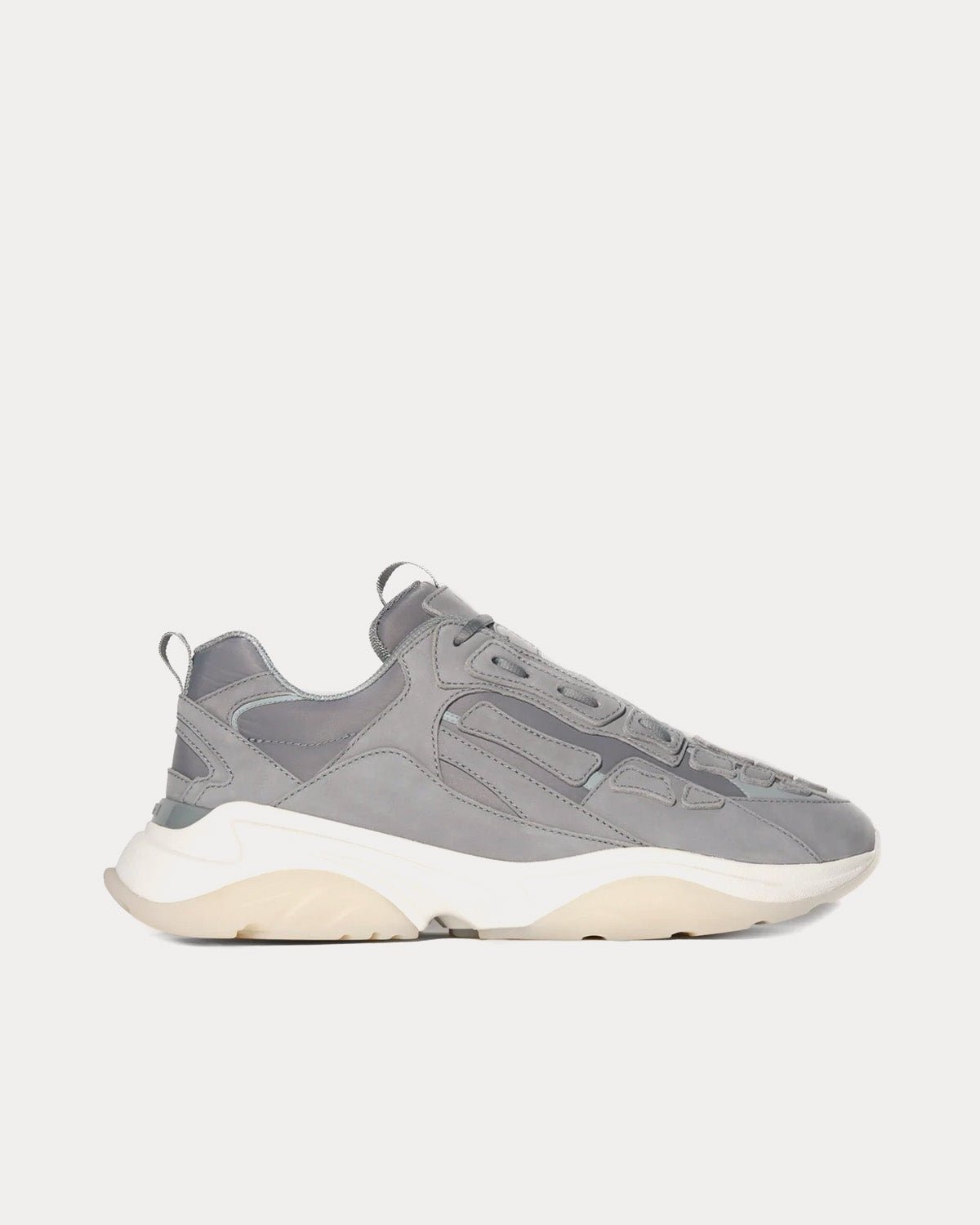 Les baskets basses Amiri Bone Runner Grey sont inspirées des baskets de sport rétro, avec un logo estampé métallique sur la languette avant, une applique en cuir squelette classique découpée et cousue à la main et une tige en daim Vesuvio.