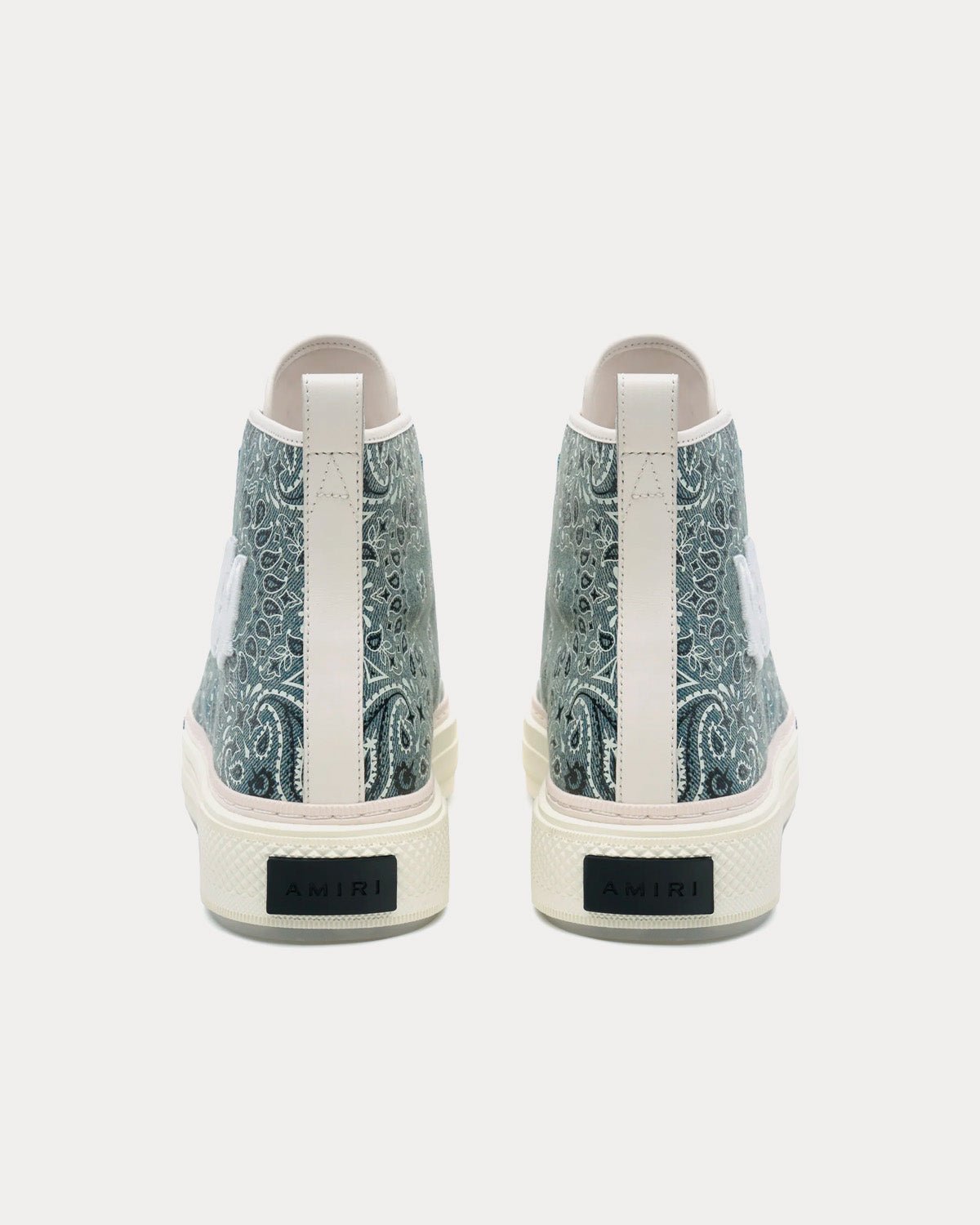 Les baskets montantes pour hommes AmiriCourt dans un coloris indigo argile de la collection PF23 sont fabriquées en toile et présentent un style denim sur la tige, avec le logo Amiri sur le côté des semelles en caoutchouc. Fabriquées en Chine.