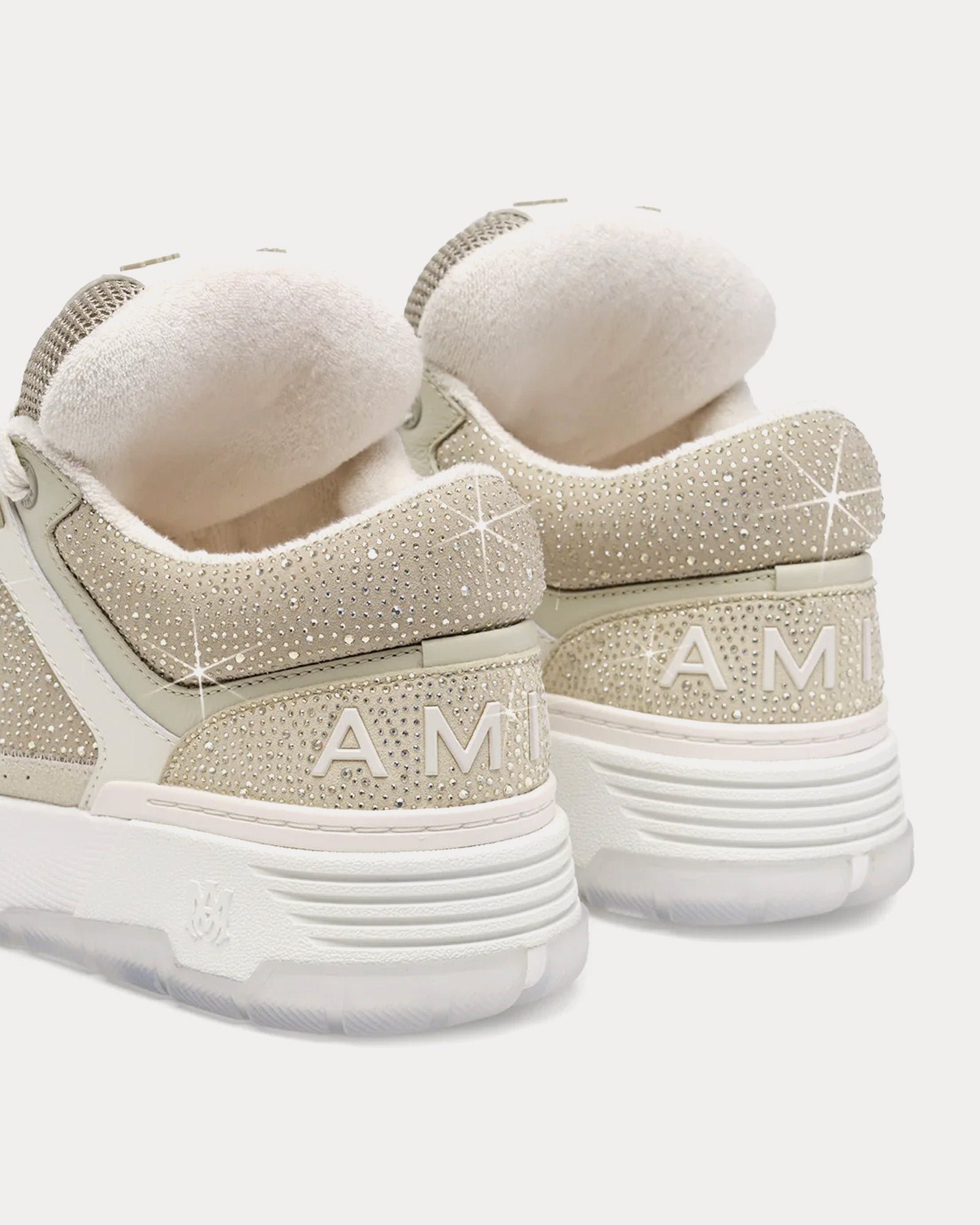 Les baskets basses pour hommes AmiriCrystal MA-1 en albâtre présentent une tige en nubuck, en mesh et en cuir, le logo Amiri sur le côté, des semelles en caoutchouc et des cristaux embellis à la main sur la tige.