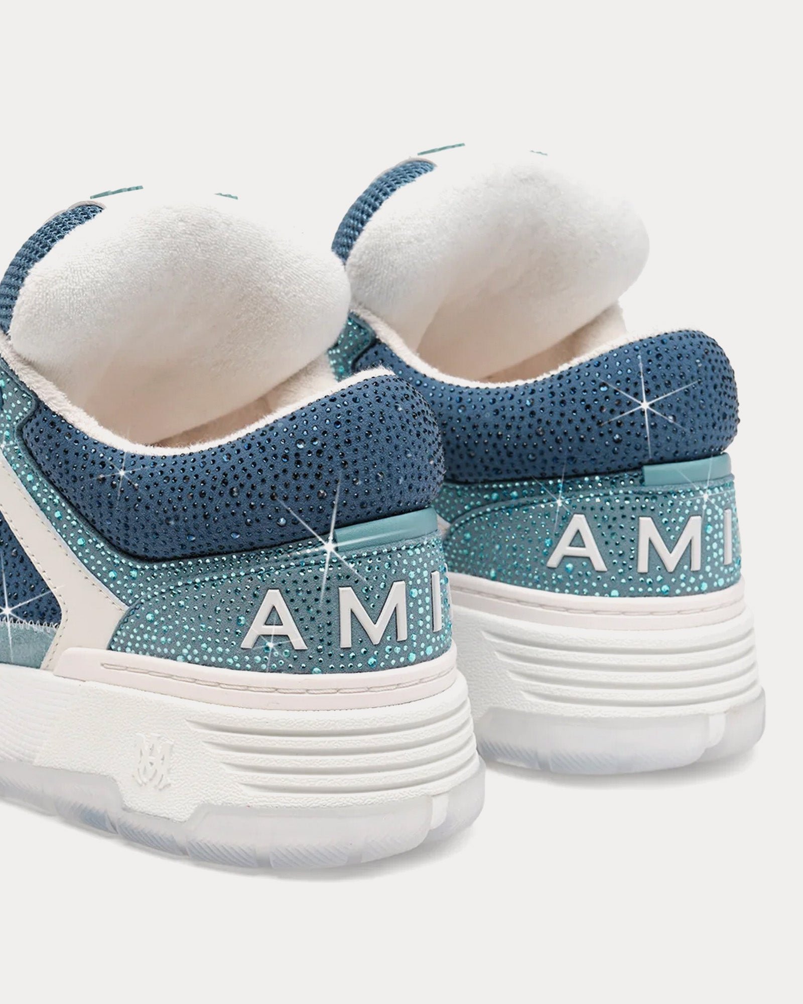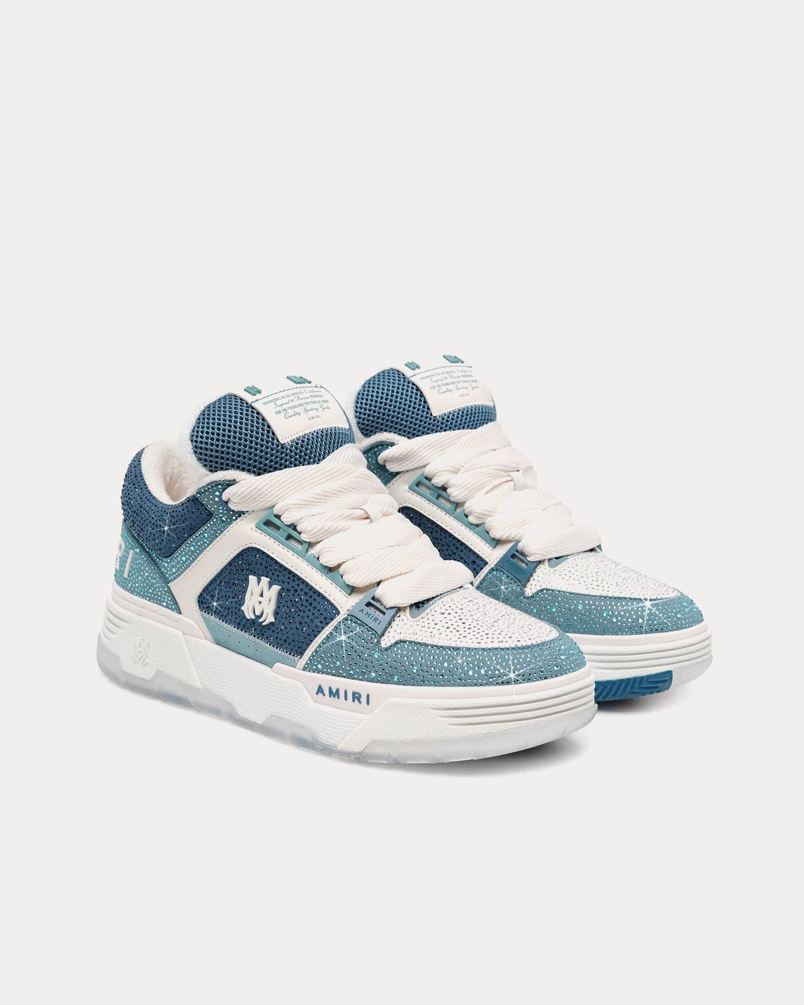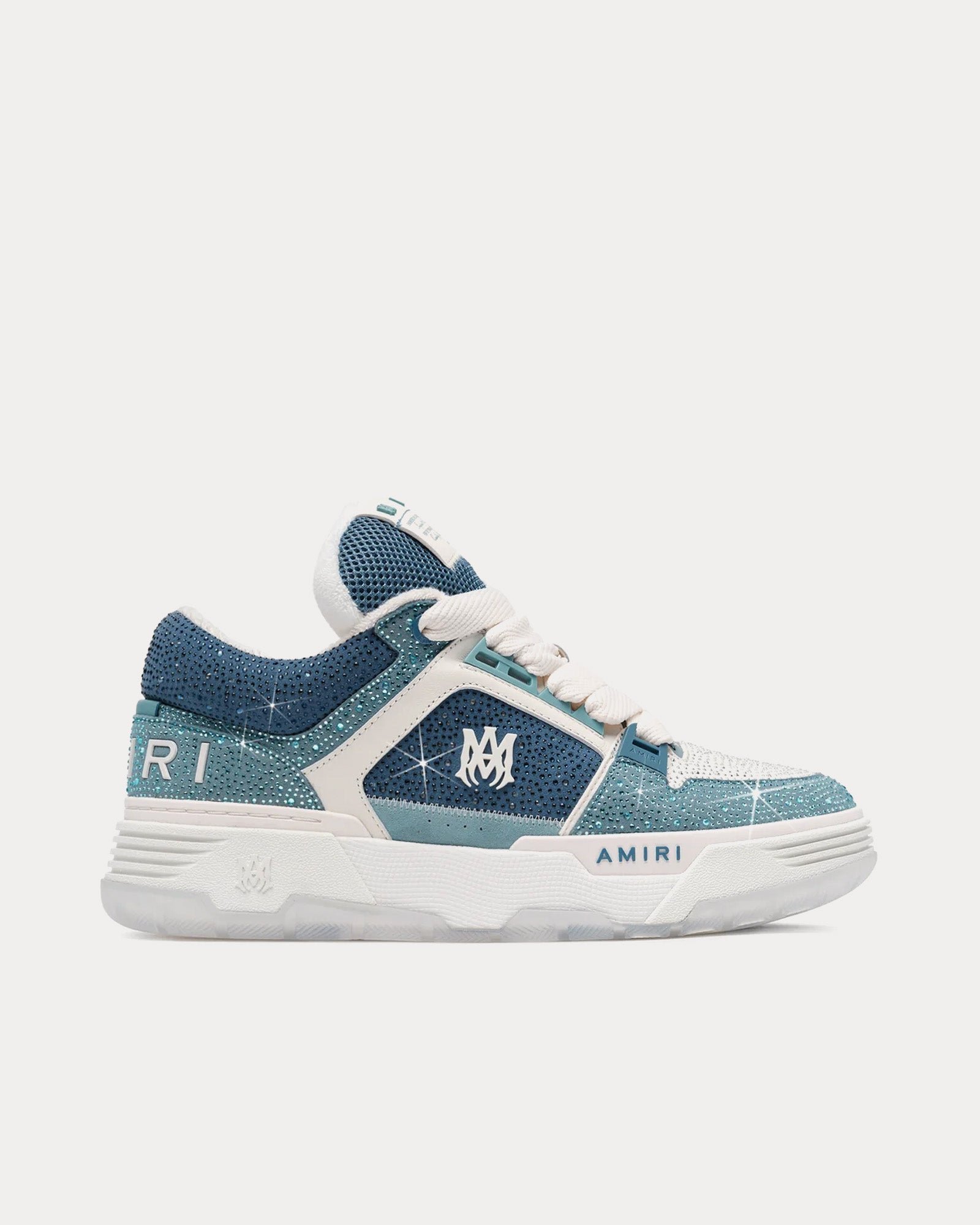 Les baskets basses pour hommes Amiri Crystal MA-1 en bleu poussiéreux présentent une tige en nubuck, en mesh et en cuir, le logo Amiri sur le côté, des semelles en caoutchouc et des cristaux embellis à la main sur la tige.