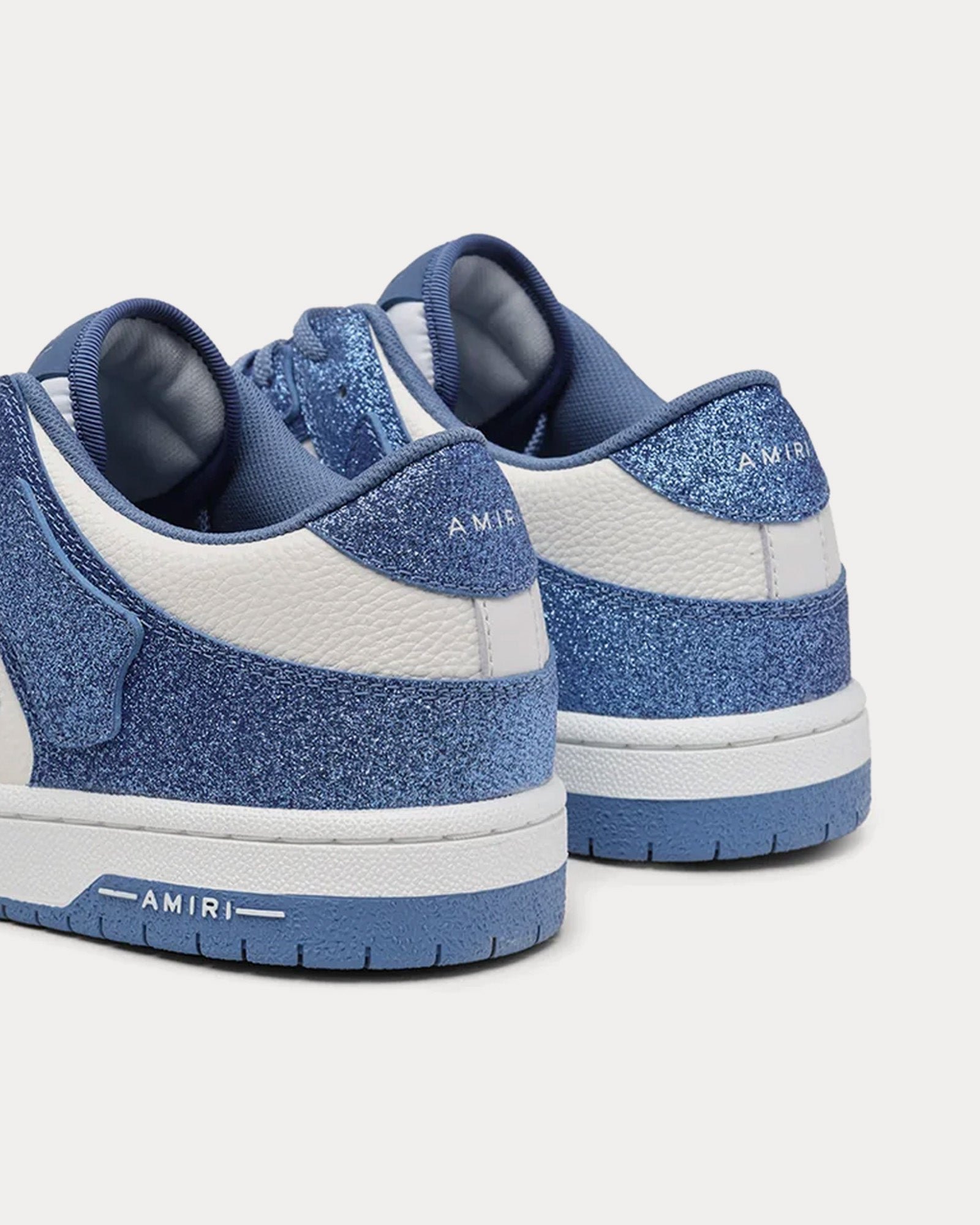 Les baskets basses AmiriShimmer Skel-Top pour hommes, de couleur bleue et blanche, sont fabriquées en cuir et présentent un effet pailleté sur la tige, avec le logo Amiri sur le dessous des semelles en caoutchouc.
