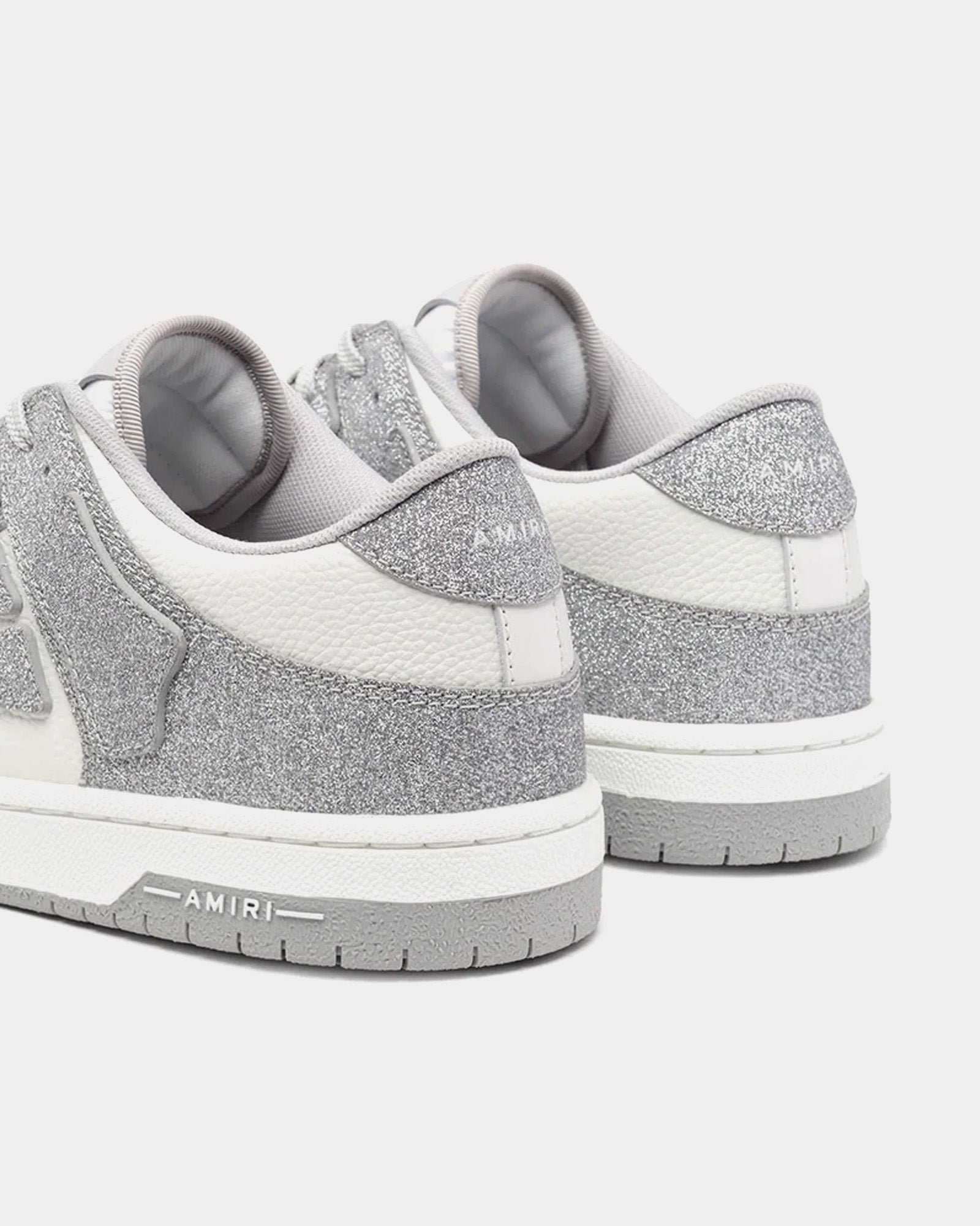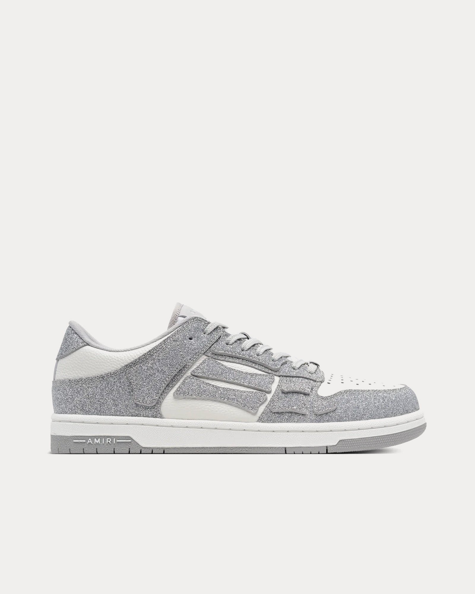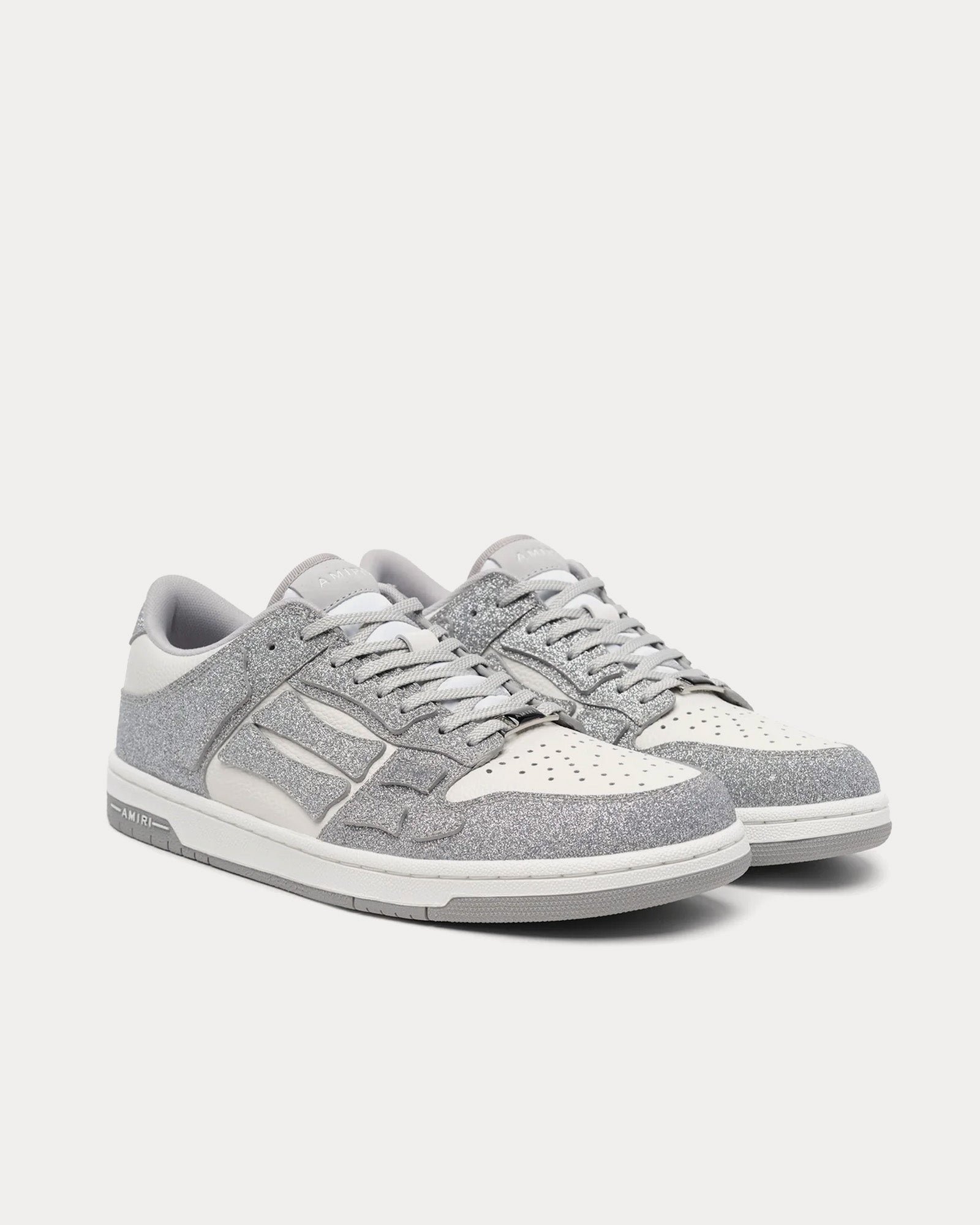 Les baskets basses pour hommes AmiriShimmer Skel-Top de couleur argentée et blanche sont fabriquées en cuir et présentent un effet pailleté sur la tige, avec le logo Amiri sur le dessous des semelles en caoutchouc.