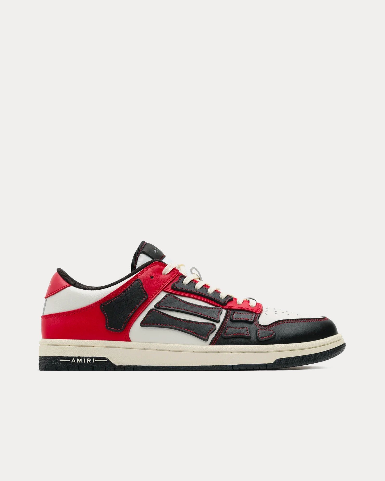 Les baskets basses pour hommes Amiri Skel-Top en noir et rouge sont fabriquées en cuir et présentent des empiècements en cuir, des applications en cuir squelette découpées et cousues à la main, une silhouette sportswear classique, des semelles en caoutchouc et des graphismes signature Amiri.