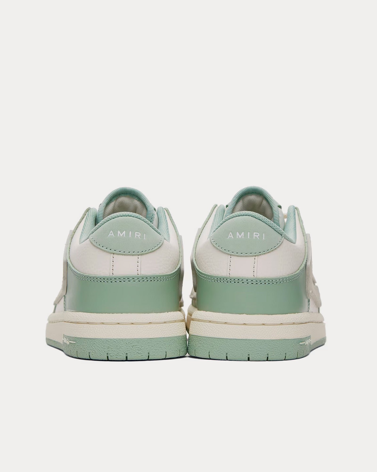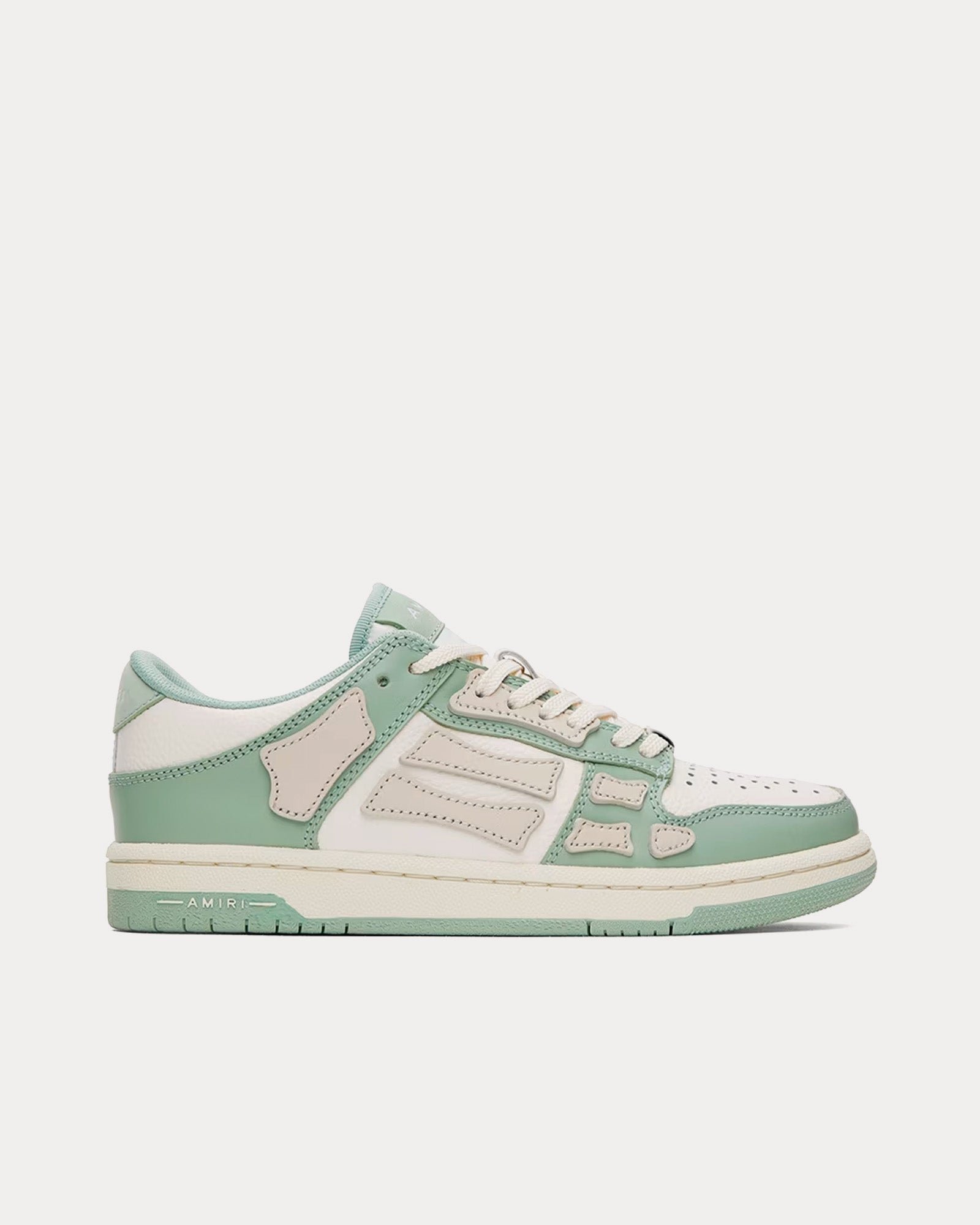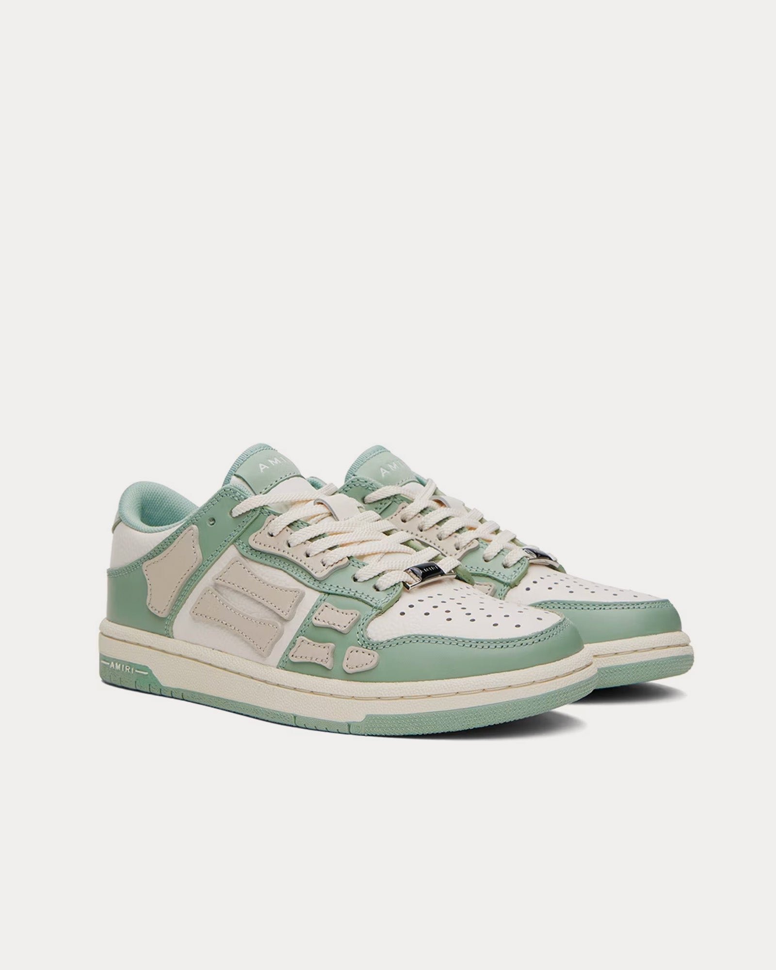 Les baskets basses pour hommes AmiriSkel-Top en vert menthe et blanc sont fabriquées en cuir et présentent des empiècements en cuir, des applications en cuir squelette découpées et cousues à la main, une silhouette sportswear classique, des semelles en caoutchouc et des graphismes signature Amiri. Disponibles exclusivement chez Ssense.