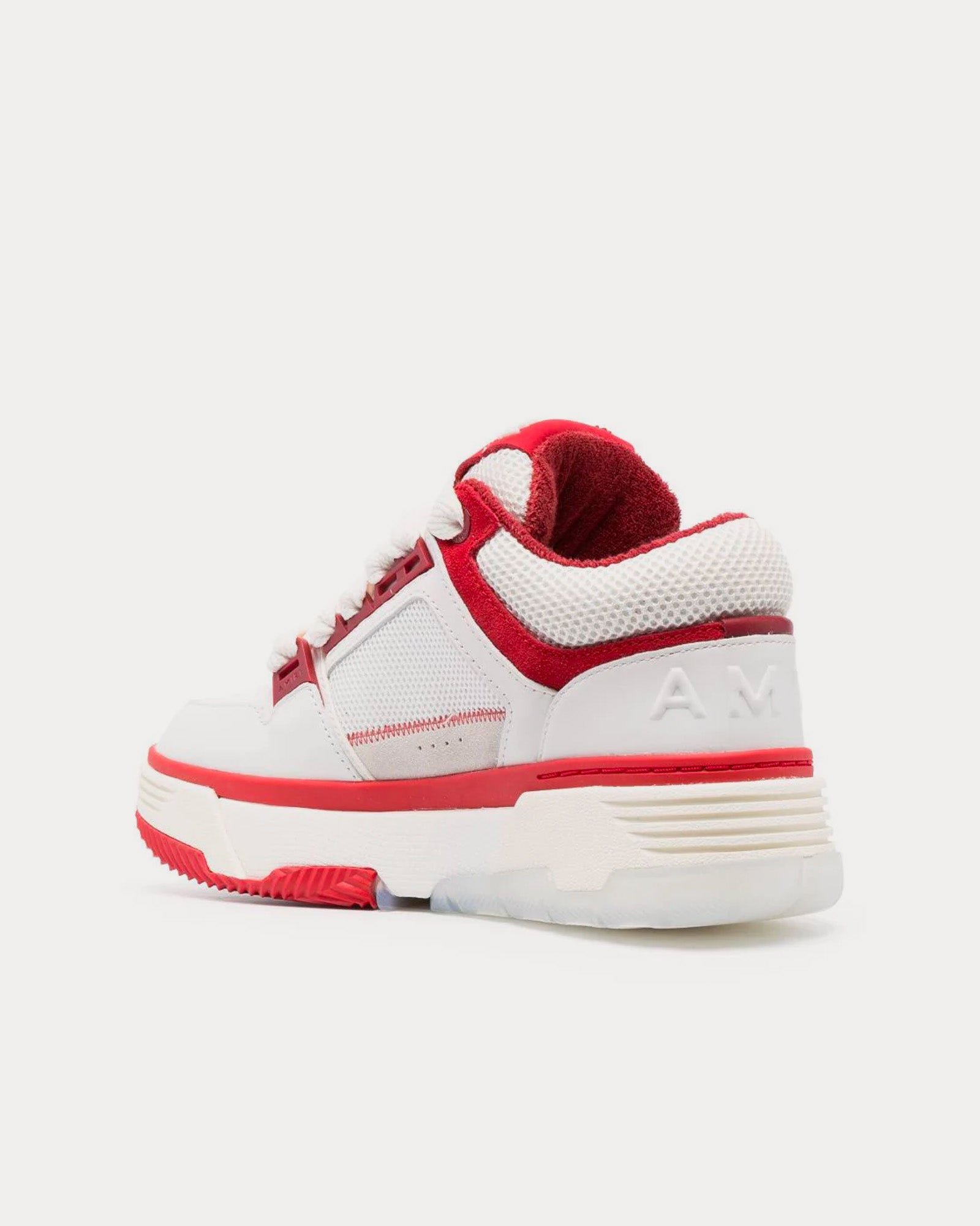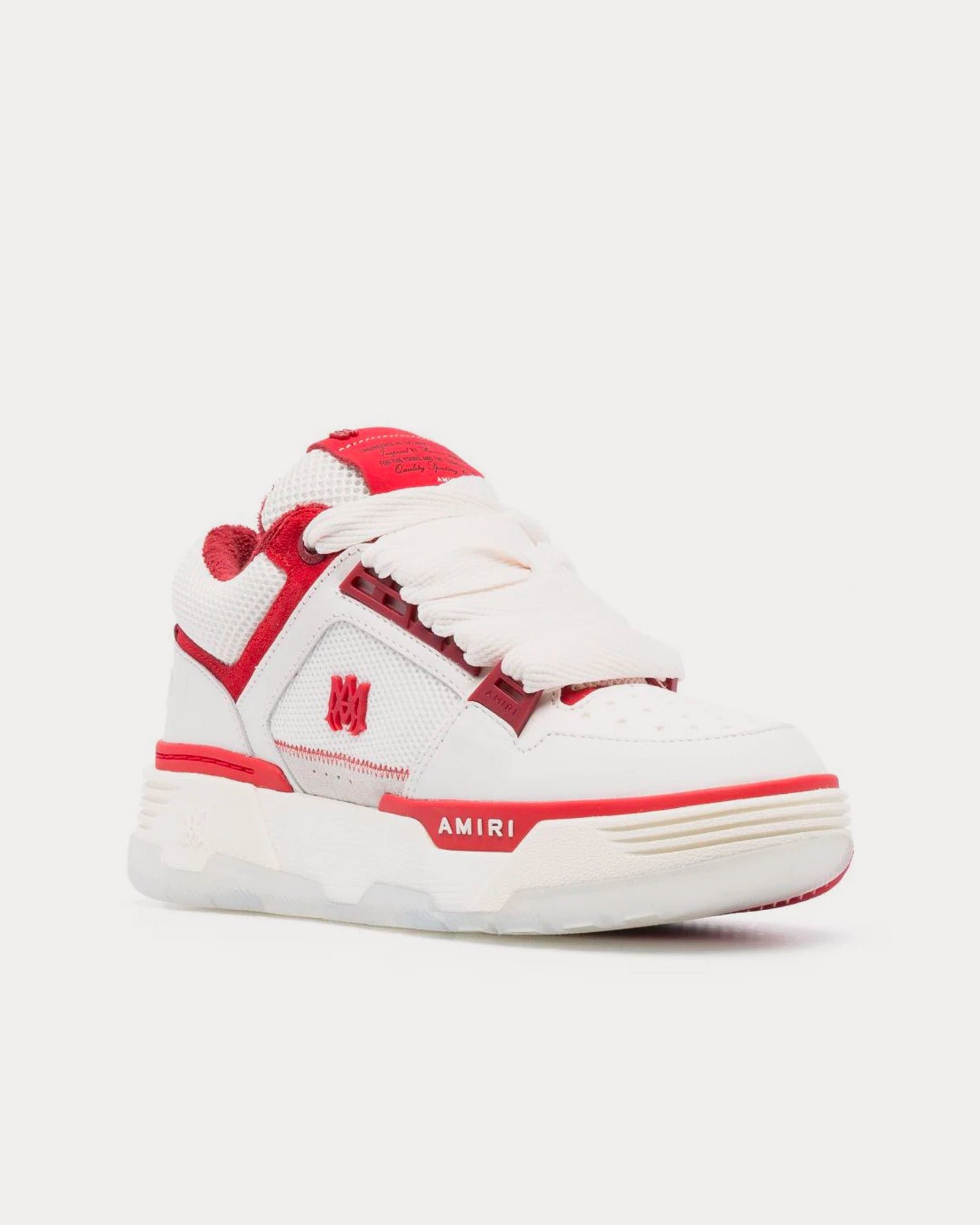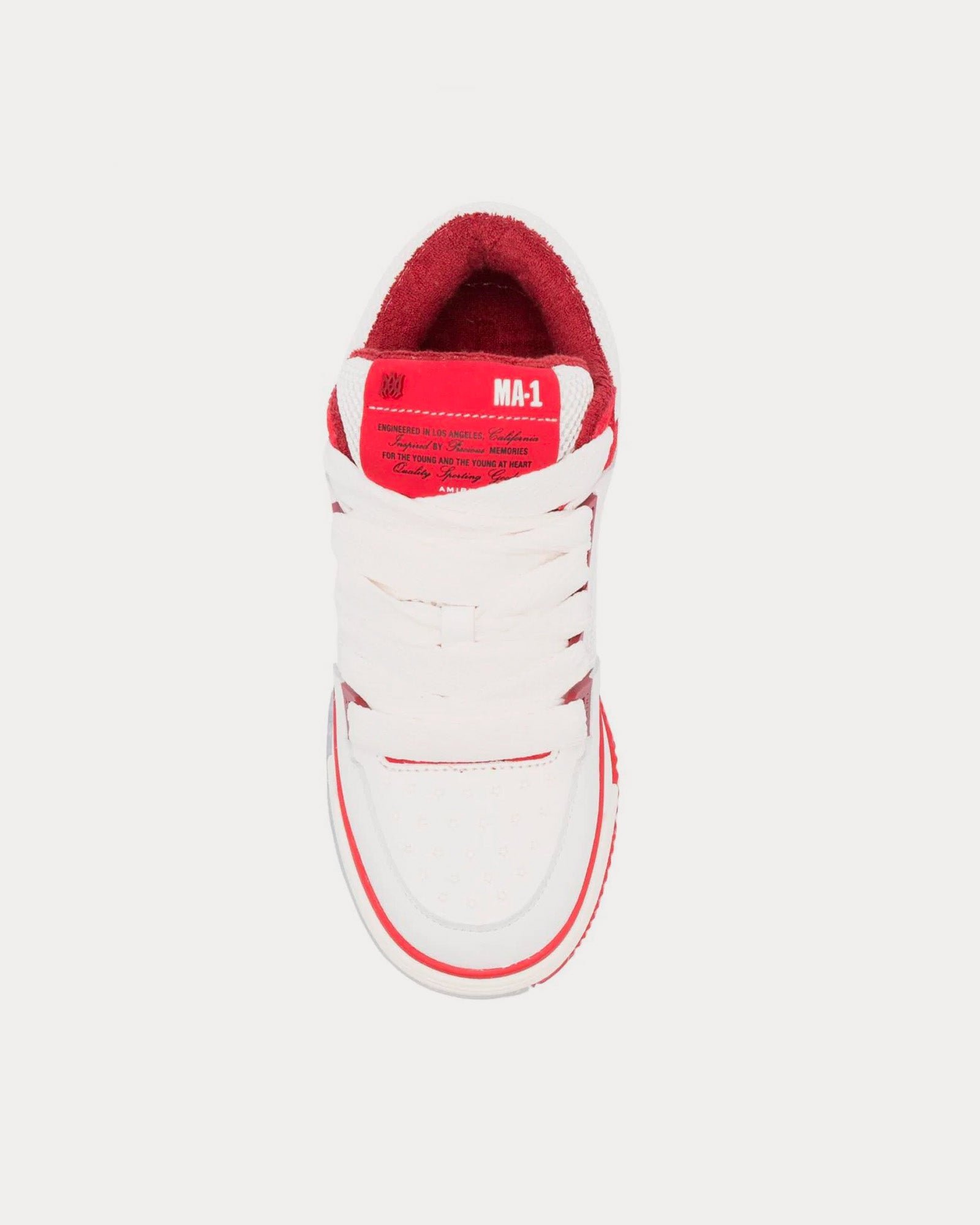 Les baskets basses pour femmes AmiriMA-1 en blanc et rouge présentent une tige en nubuck, en mesh et en cuir, le logo Amiri sur le côté et des semelles en caoutchouc. Fabriquées en Chine.