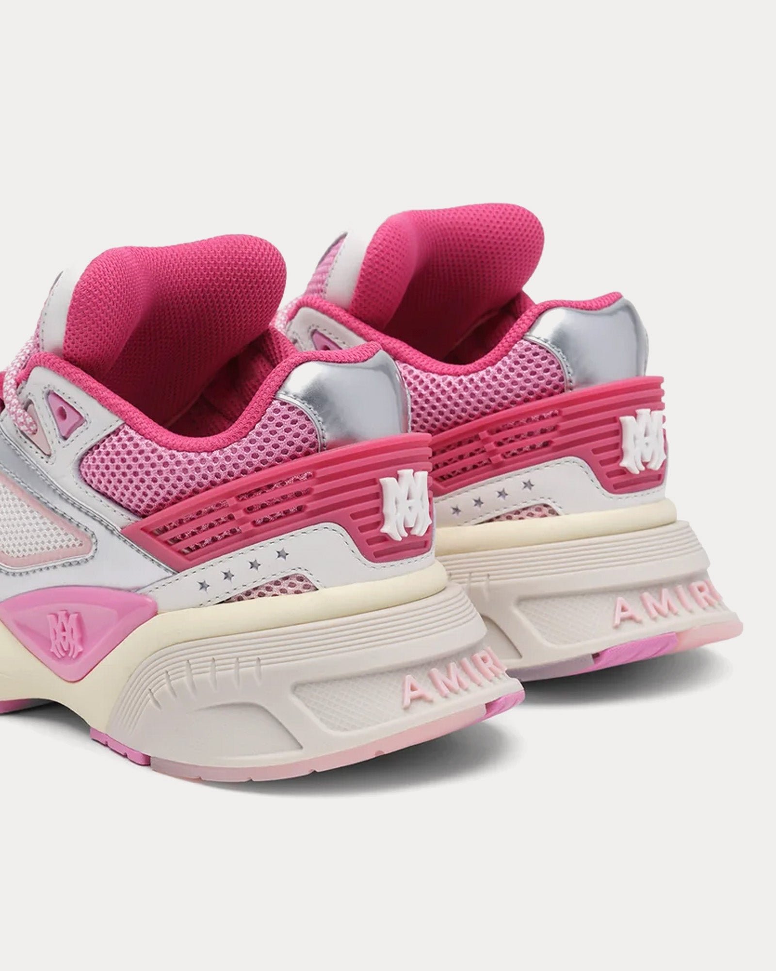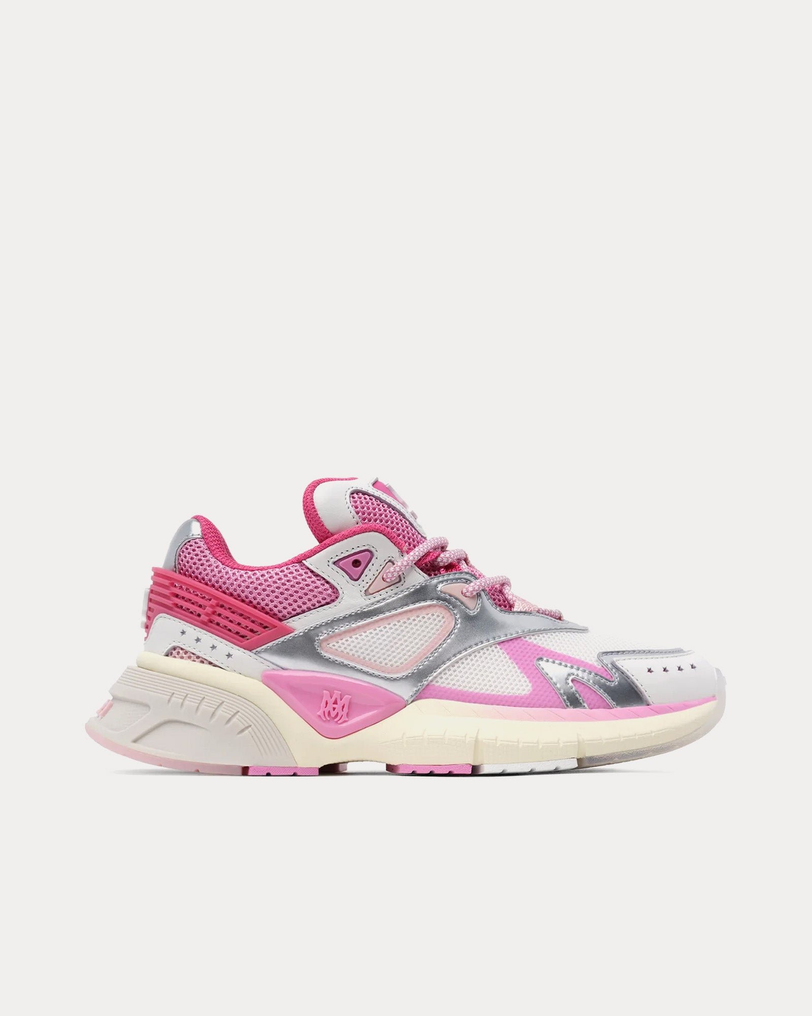 Les baskets basses pour femmes AmiriMA Runner en rose fuchsia, blanc et argent sont fabriquées en cuir et polyester et présentent un design classique inspiré des années 90, une tige en mesh respirant, des empiècements métalliques et des semelles en caoutchouc sculptées.
