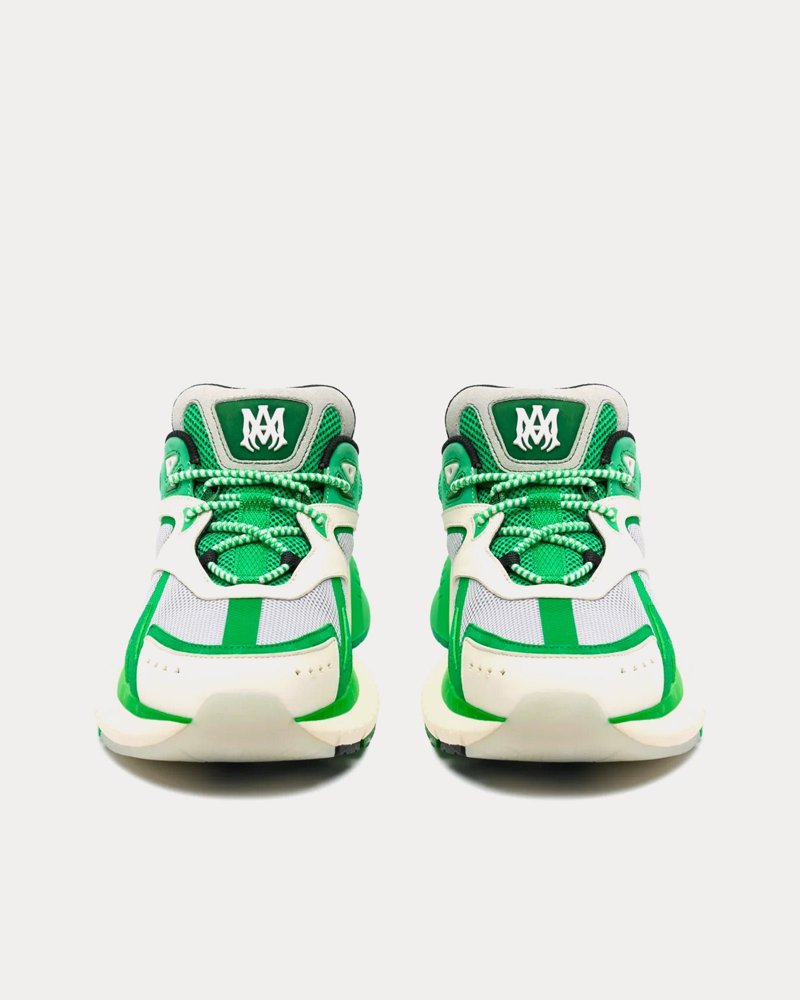 Les baskets basses pour femmes AmiriMA Runner en vert sont fabriquées en cuir et polyester et présentent un design classique inspiré des années 90, des tiges en mesh respirant, des détails en cuir et en daim et des semelles en caoutchouc sculptées. Une partie de la collection Amiri pré-printemps 2024.