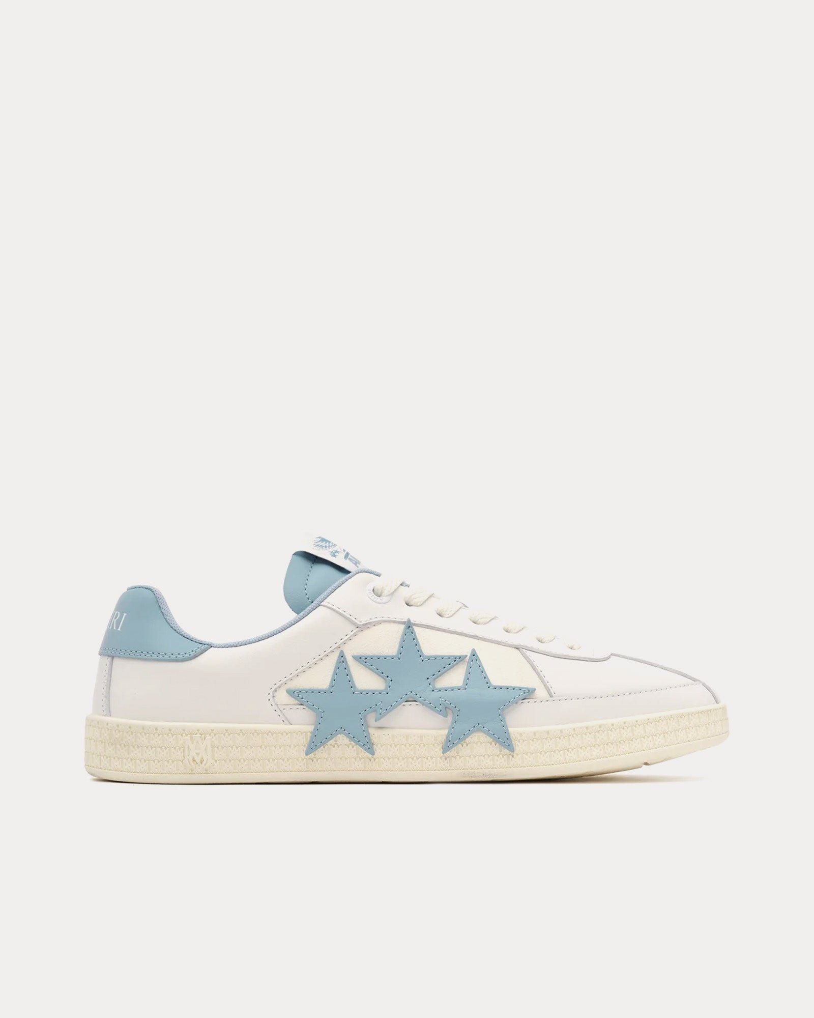 Les baskets basses pour femmes Amiri Pacific en blanc et ciel océan s’inspirent des baskets de course classiques et présentent une tige en cuir, des empiècements en cuir étoilé sur les côtés et des semelles en caoutchouc à motif emblématique MA. Fabriquées en Italie.