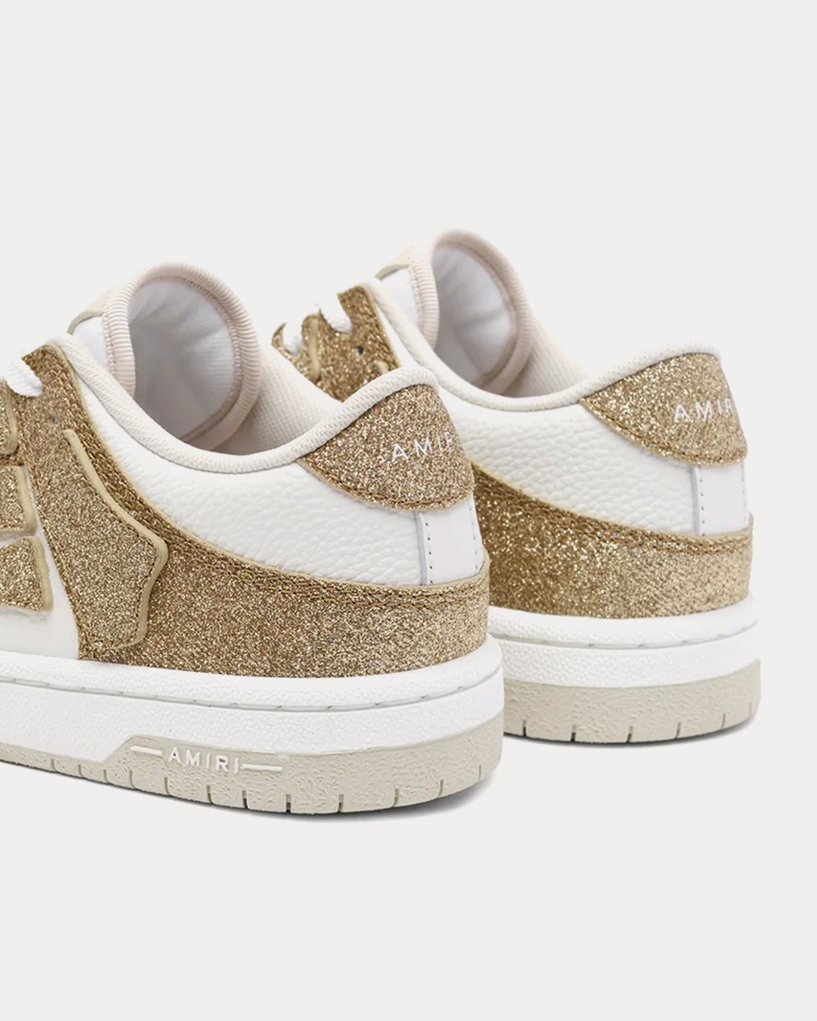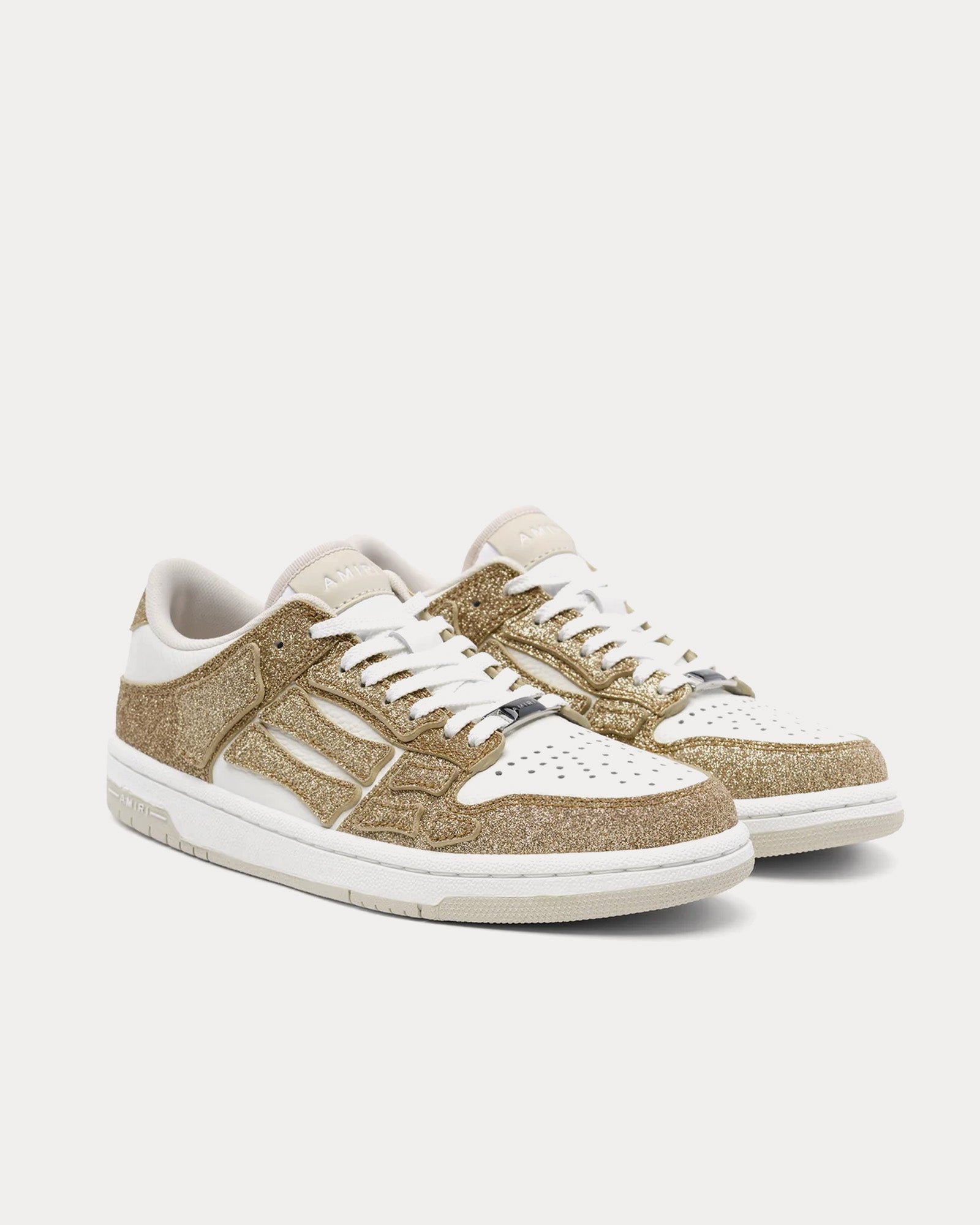 Les baskets basses pour femmes AmiriShimmer Skel-Top de couleur or et blanc sont fabriquées en cuir et présentent un effet pailleté sur la tige, avec le logo Amiri sur le dessous des semelles en caoutchouc.