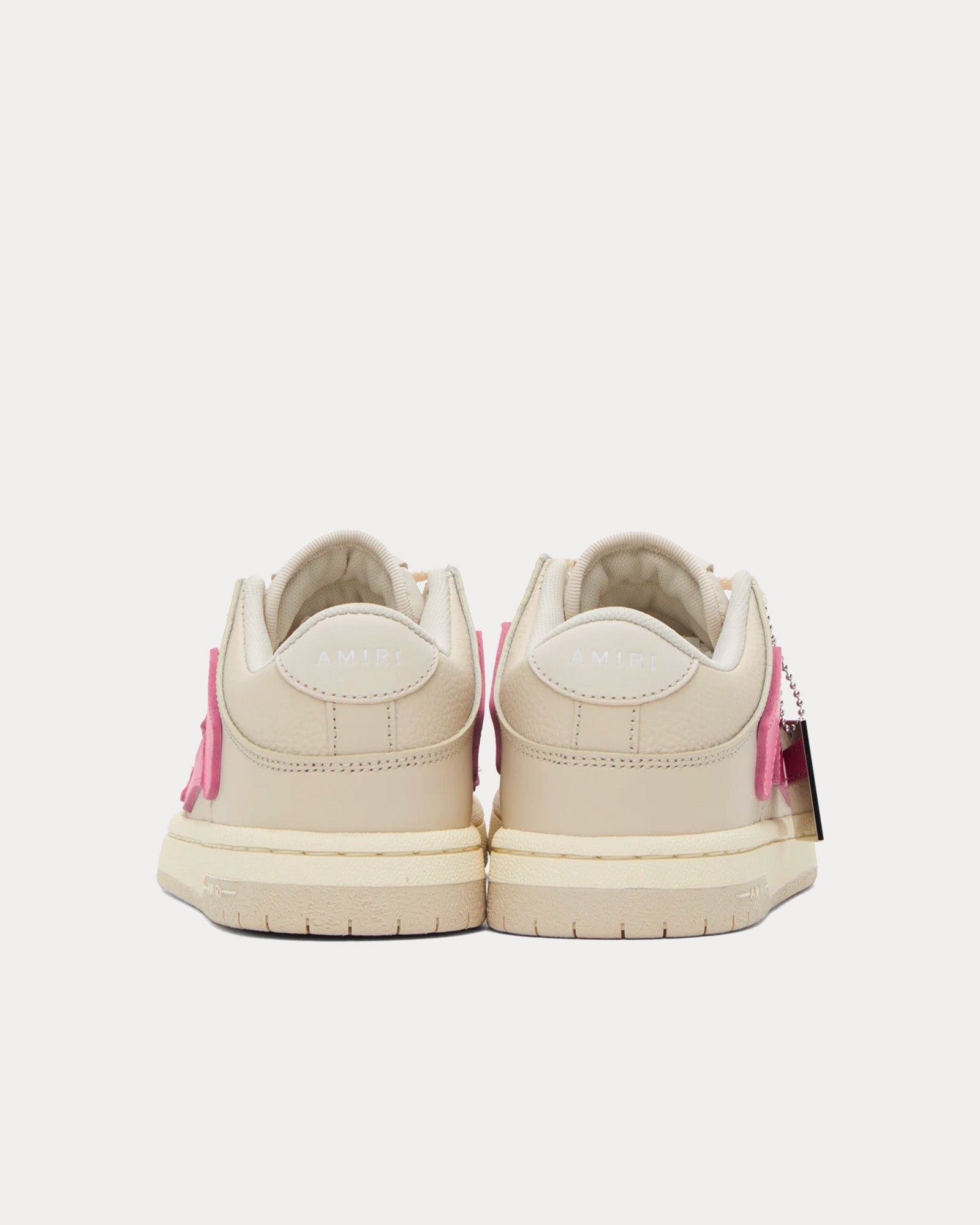 Les baskets basses pour femmes AmiriSkel-Top de couleur beige et rose sont fabriquées en cuir et présentent des tiges en cuir à motif squelette, avec le logo Amiri sur le dessous des semelles en caoutchouc. Fabriquées en Chine.