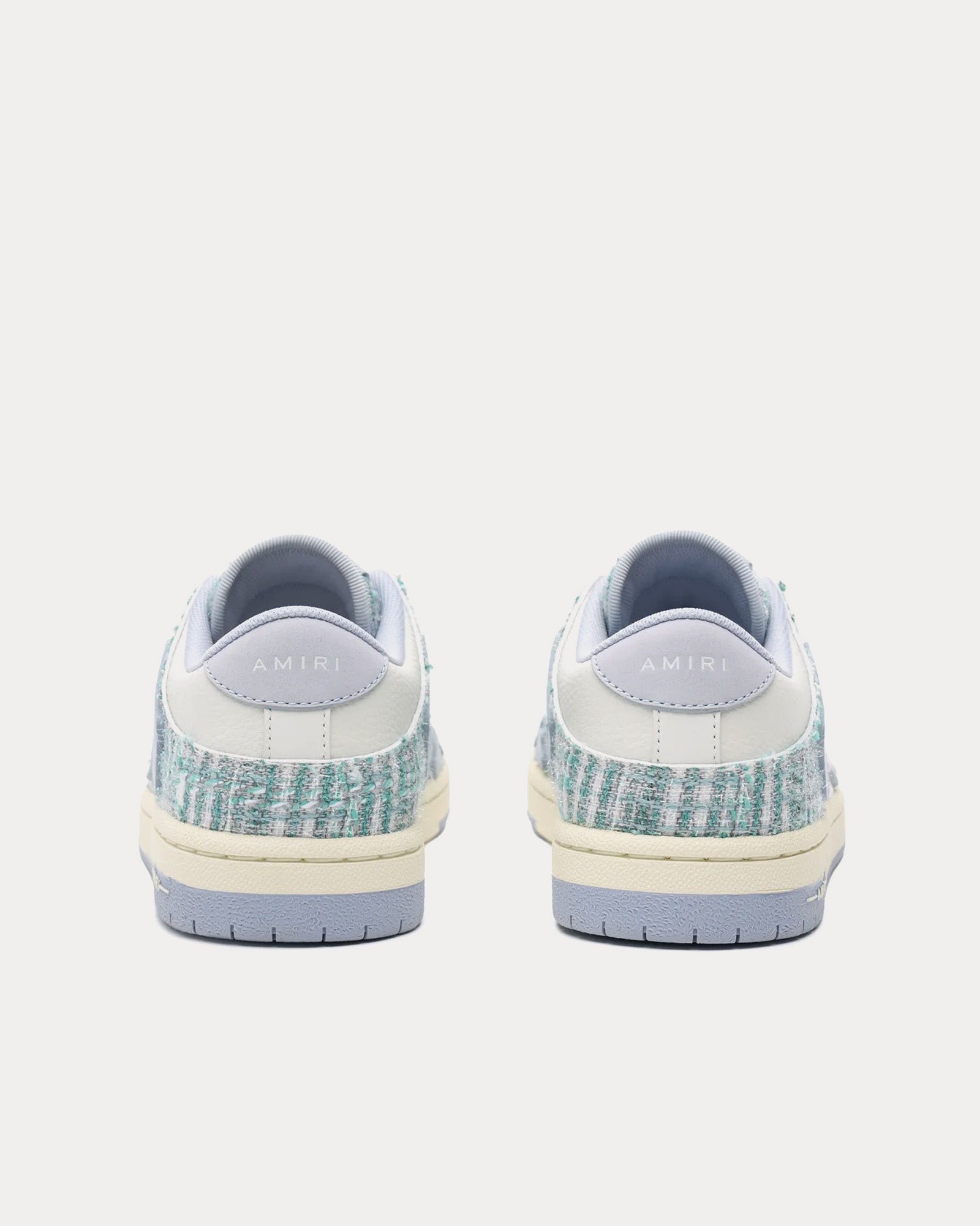 Les baskets basses pour femmes AmiriSkel-Top Boucle en gris et bleu sont fabriquées en cuir et boucle et présentent des tiges en boucle, des applications en cuir squelette coupées et cousues à la main, une silhouette sportswear classique, des semelles en caoutchouc et des graphismes signature Amiri.