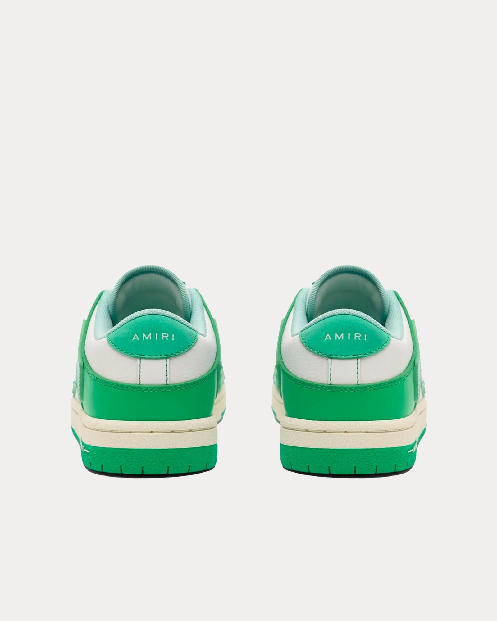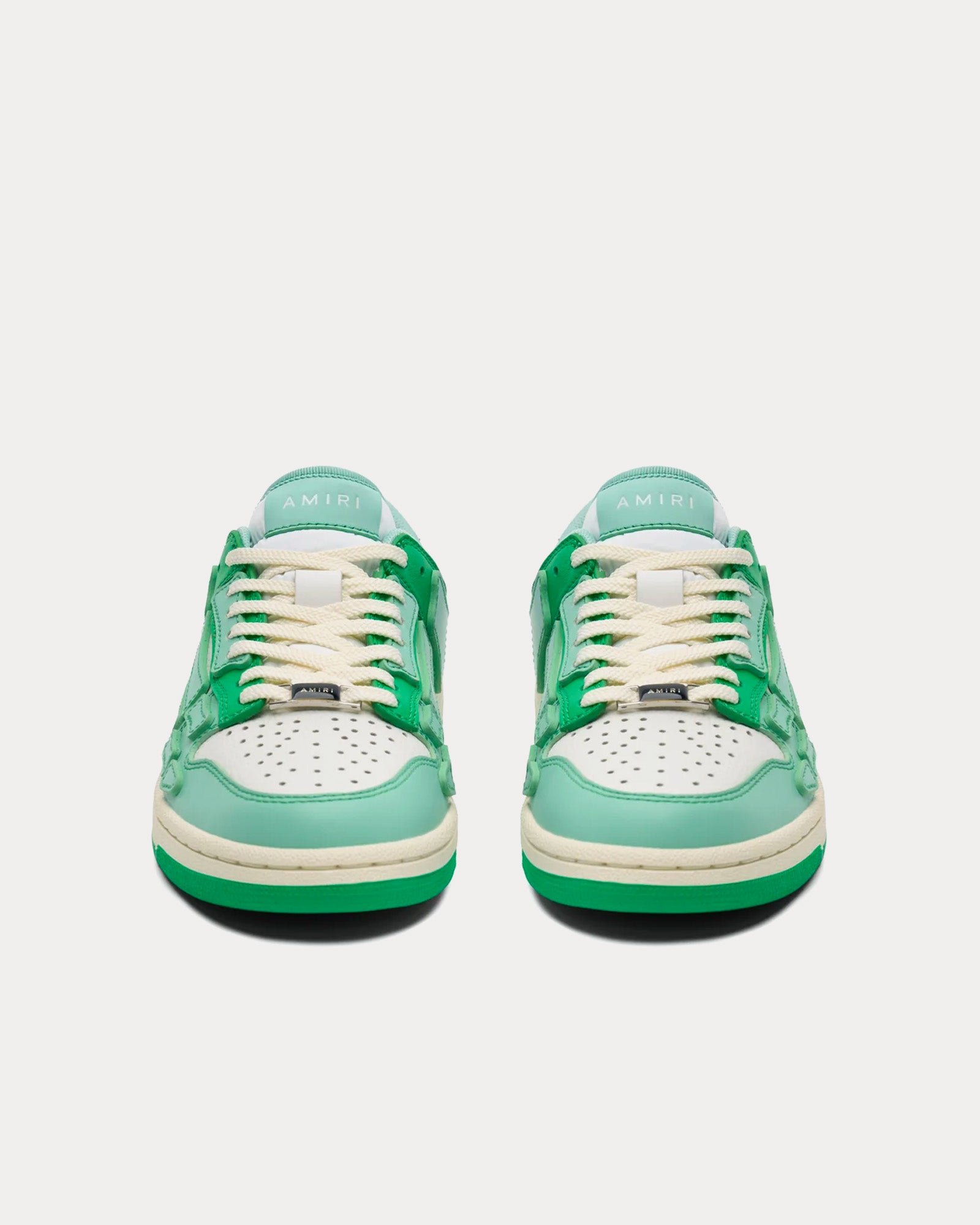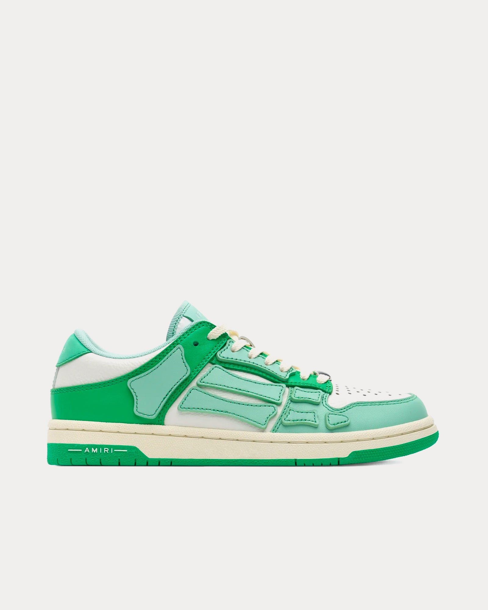 Les baskets basses pour femmes AmiriSkel-Top en vert sont fabriquées en cuir et présentent des empiècements en cuir, des applications en cuir squelette découpées et cousues à la main, une silhouette sportswear classique, des semelles en caoutchouc et des graphismes signature Amiri.