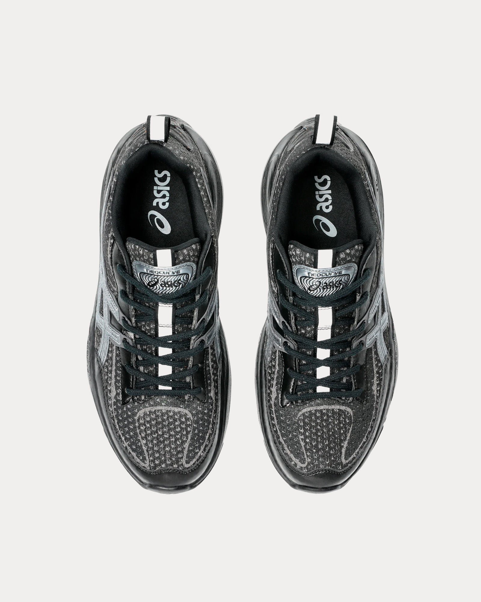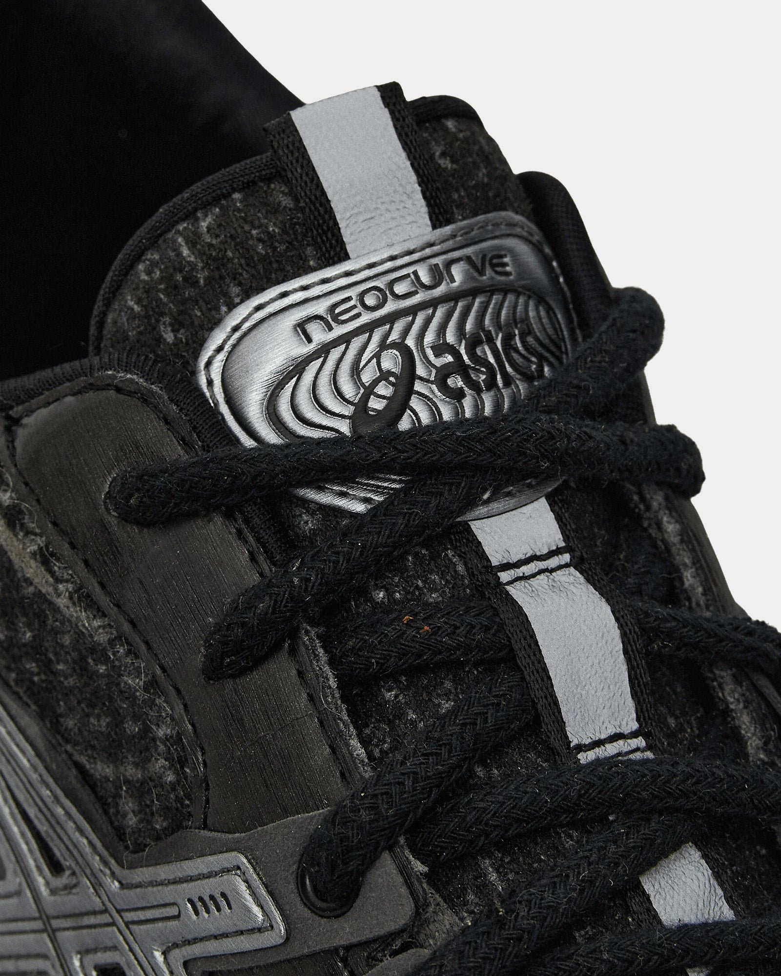 The unisex Asics Circularity Neocurve low top sneakers in black and pure silver are crafted from a blend of grinded-up footwear, deadstock, & defective shoe, and feature uppers with synthetic overlays, silver-tone details, heel pull tabs, GEL™ Technology Cushioning, and NEOCURVE™ Rubber Outsoles.