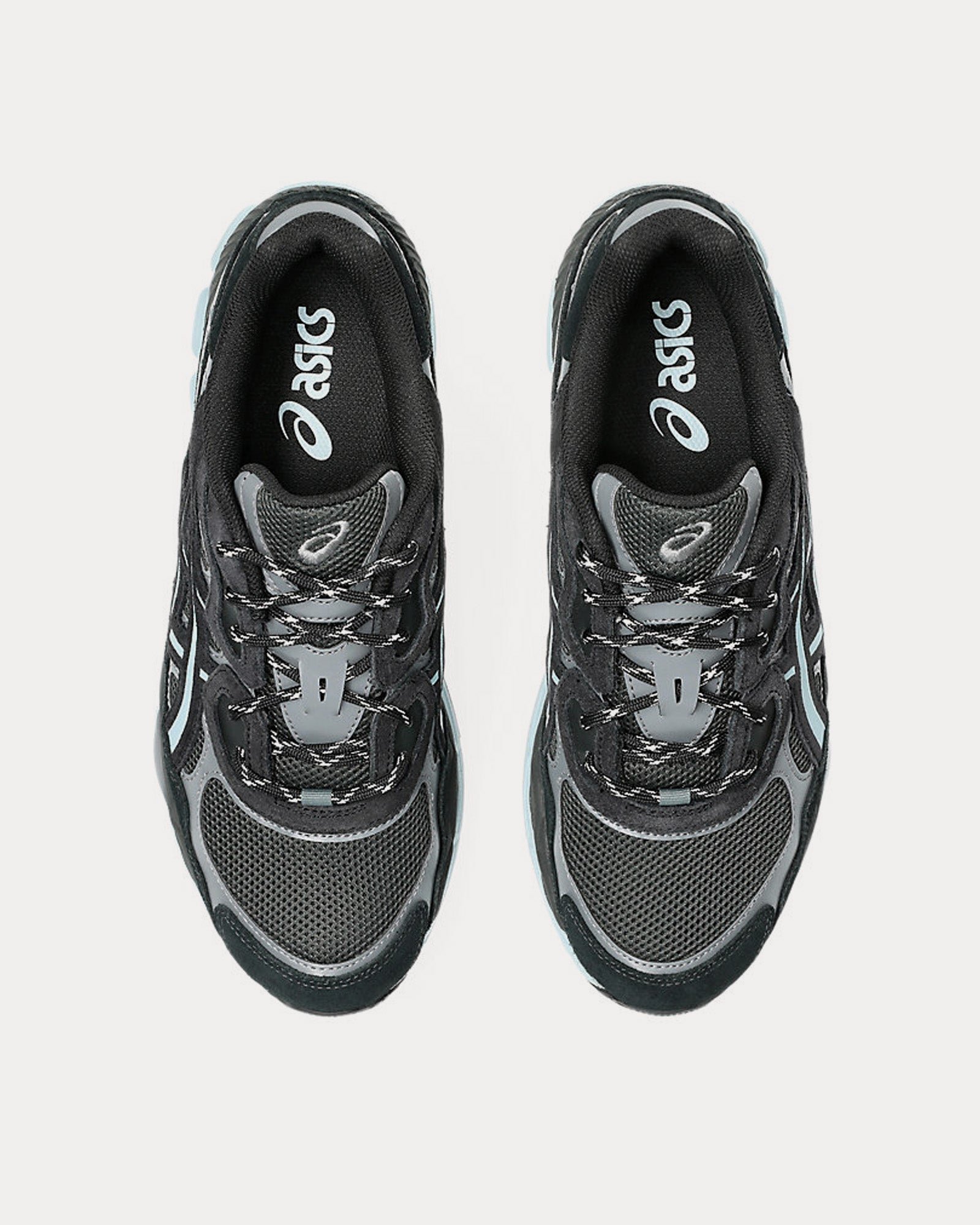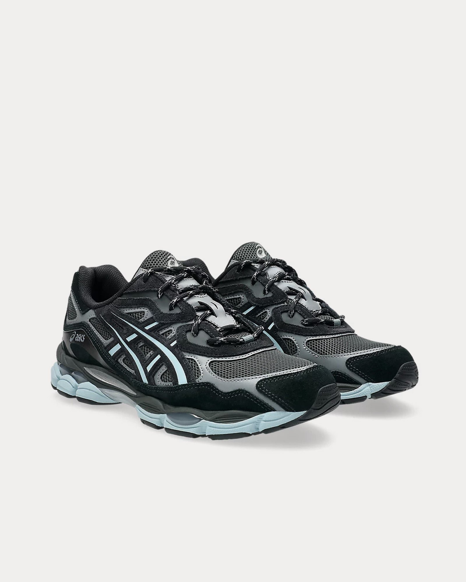 The unisex AsicsGel-NYC low top sneakers in black and starlight blue are inspired by heritage and modern performance running styles with an upper is inspired by the GEL-NIMBUS 3 and MC-PLUS V shoes and rearfoot and forefoot GEL™ technology for comfort in everyday scenarios.