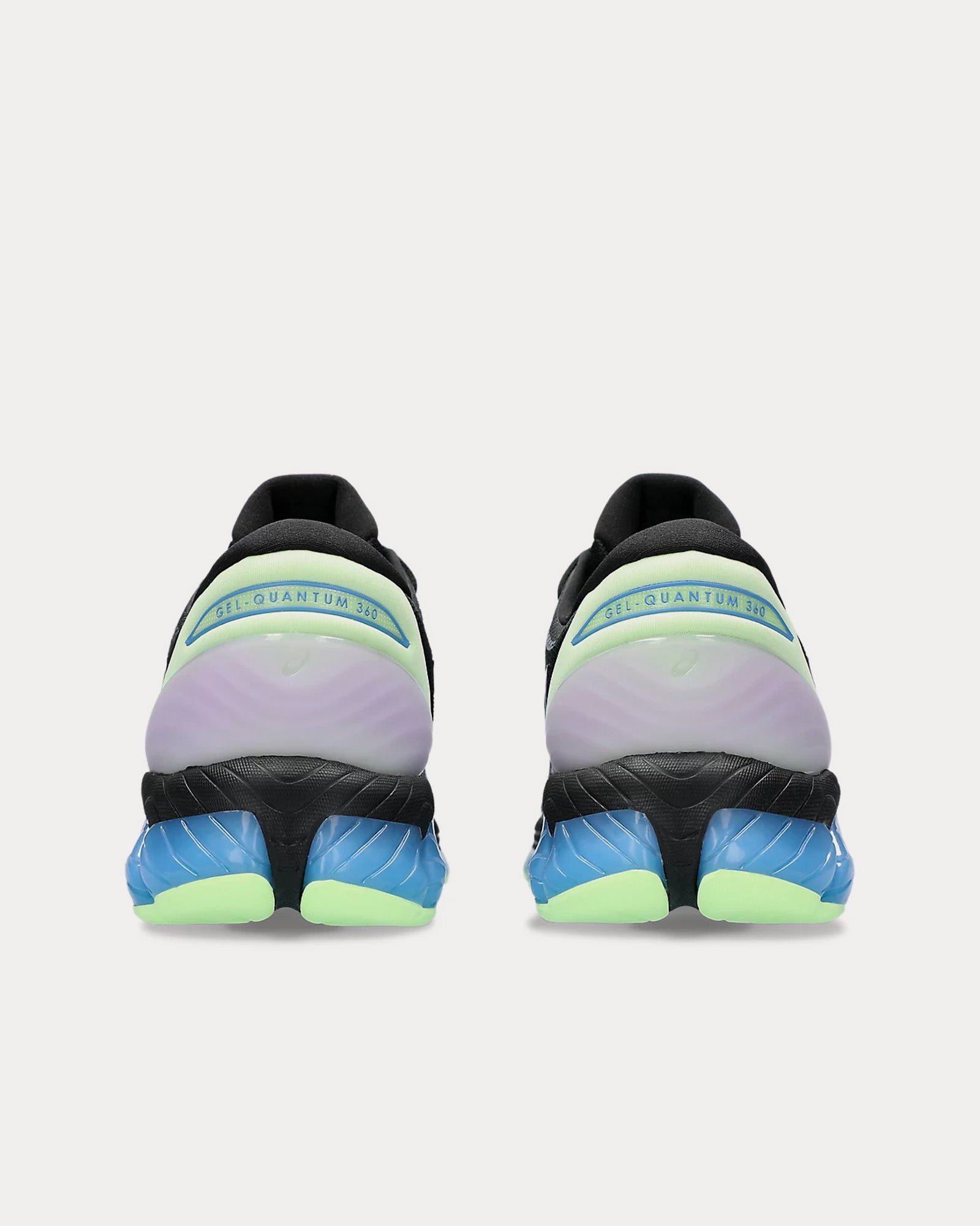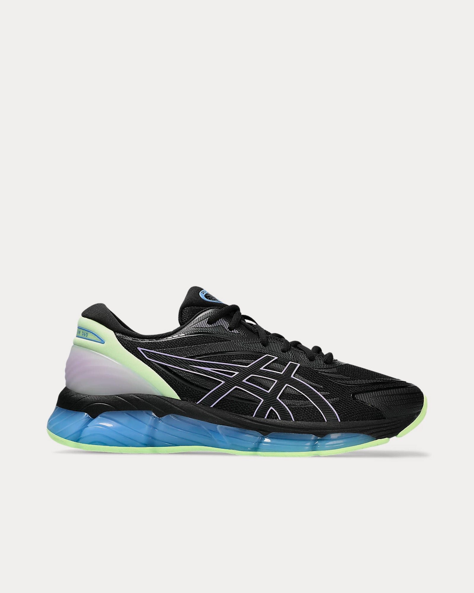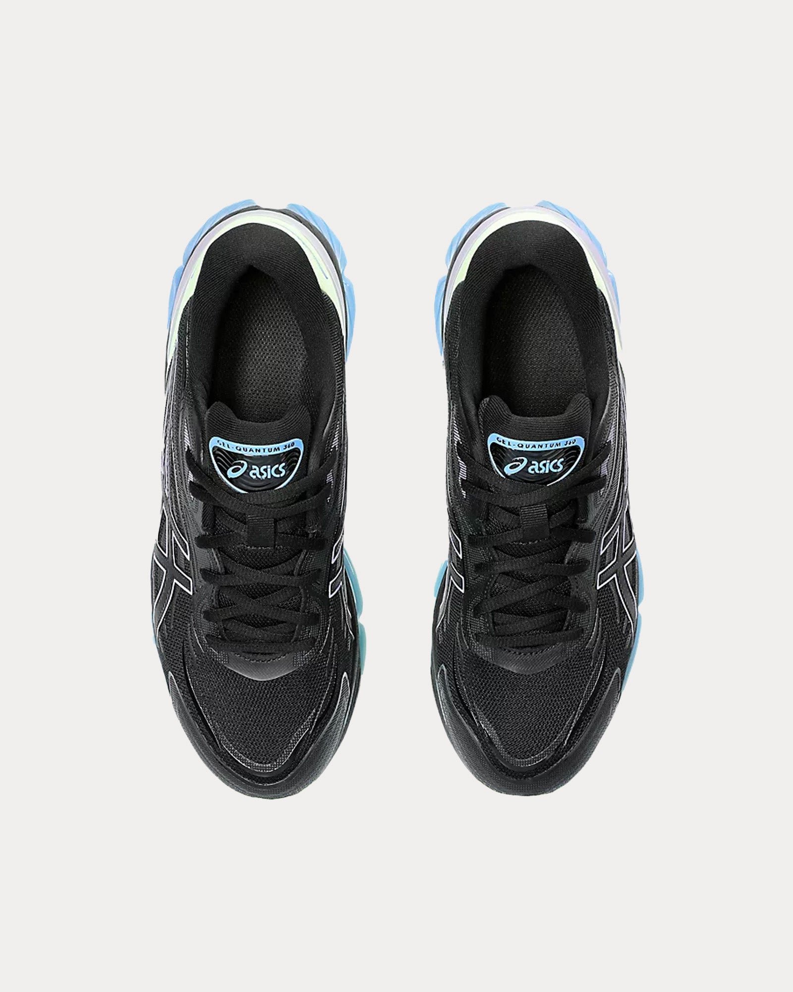 The unisex AsicsGel-Quantum 360 VIII low top sneakers in black and blue project feature GEL® technology for shock absorption, FLYTEFOAM® BLAST cushioning in the heel, and a scutoid shape for natural movement.