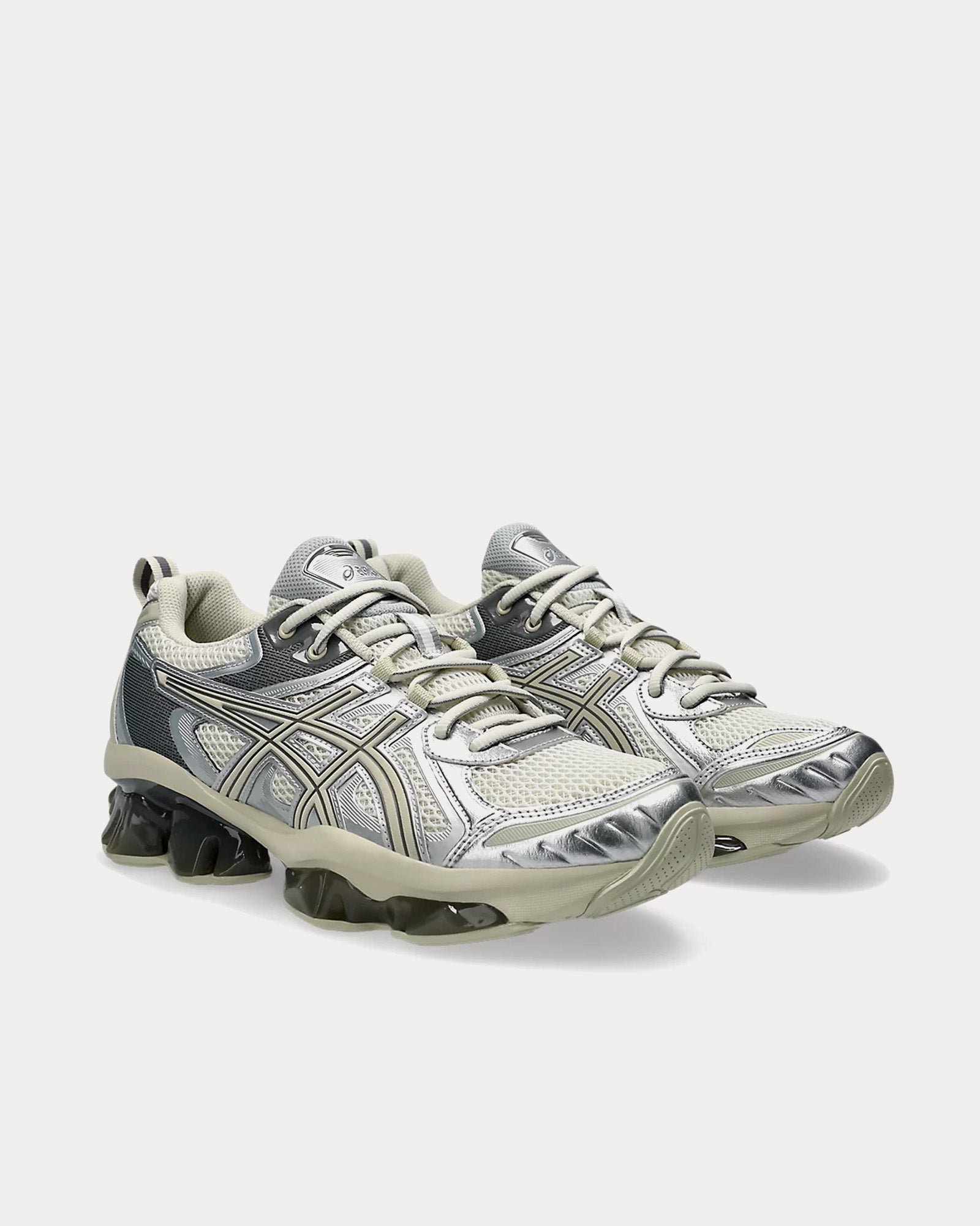 The unisex AsicsGel-Quantum Kinetic low top sneakers in white and light dust feature synthetic leathers and various mesh panels layered throughout the uppers, Scutoid GEL technology that has a closely packed 3D geometry and an off-axis structure, cushioning from the Asics running collection that has been re-tuned for everyday purposes, and an improved overall fit by providing a better foothold.