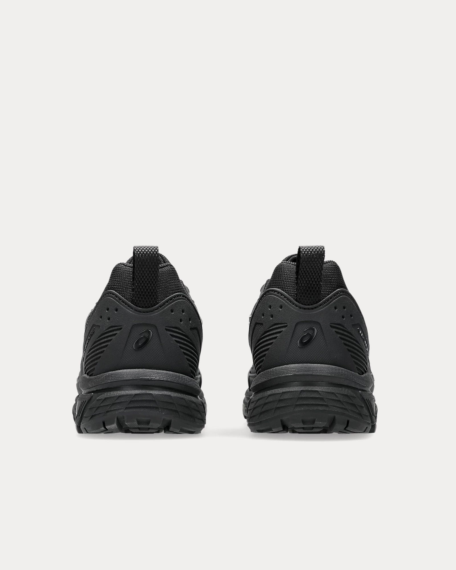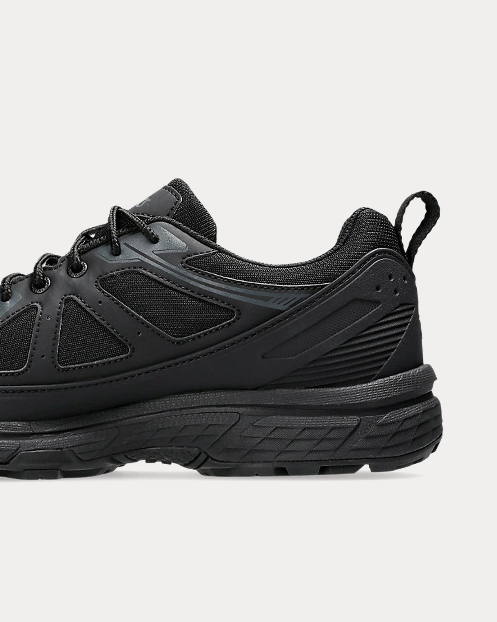 The unisex Asics Gel-Venture 6 Shield low top sneakers in black and black are based on trail-running sportstyle designs and feature synthetic leather uppers, panels with targeted support, rearfoot GEL™ technology, and a trail-specific traction pattern.