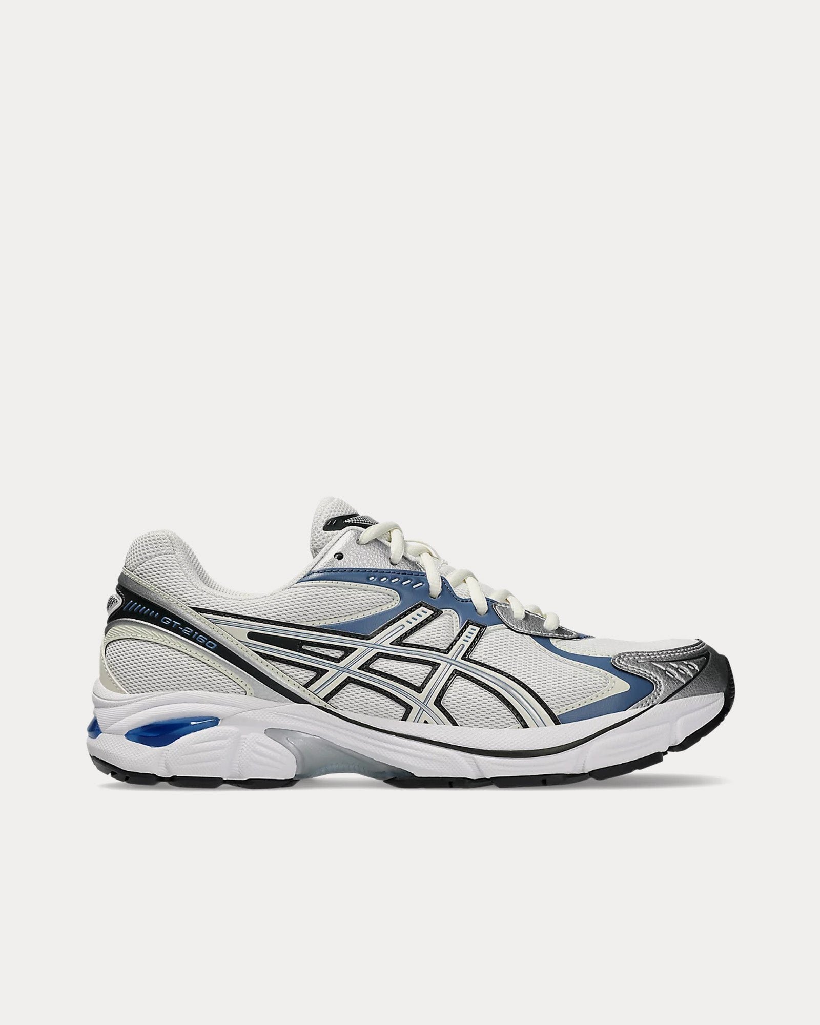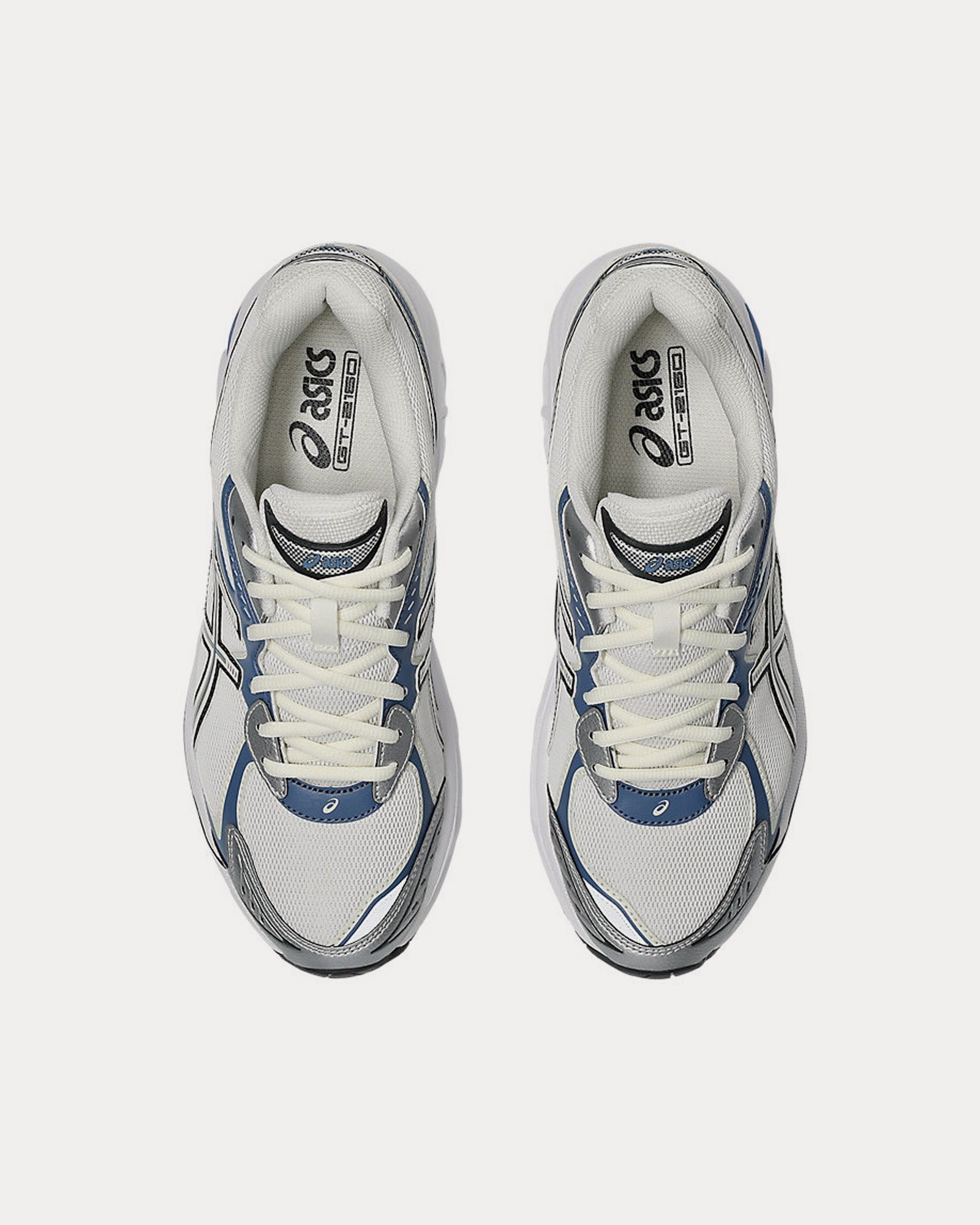 The unisex AsicsGT-2160 low top sneakers in cream and denim blue feature layered synthetic leather upper, sleek aesthetic, and wavy forefoot sculpting.