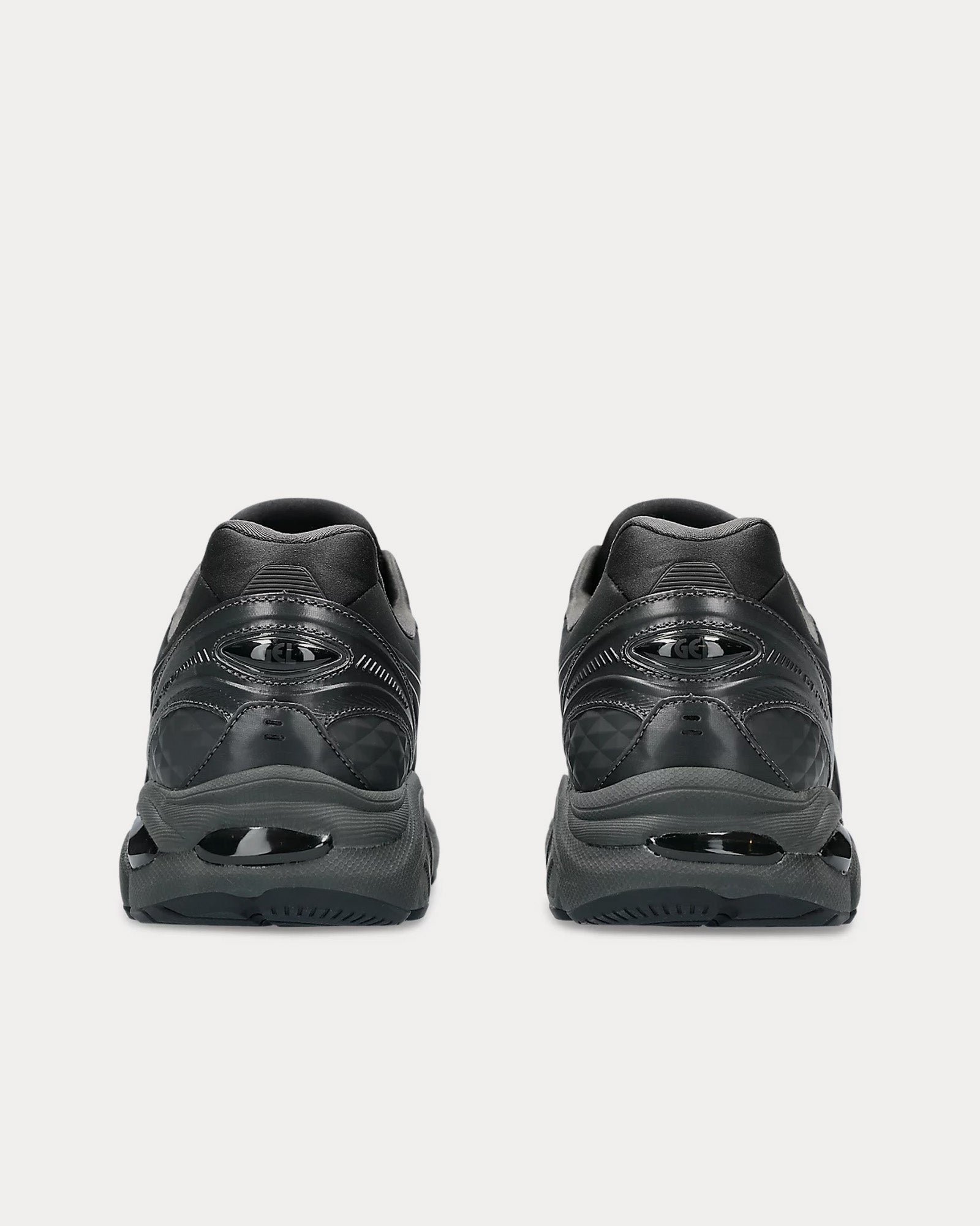 The unisex AsicsGT-2160Earthenware low top sneakers in black and graphite grey feature layered synthetic leather upper, sleek aesthetic, and wavy forefoot sculpting.