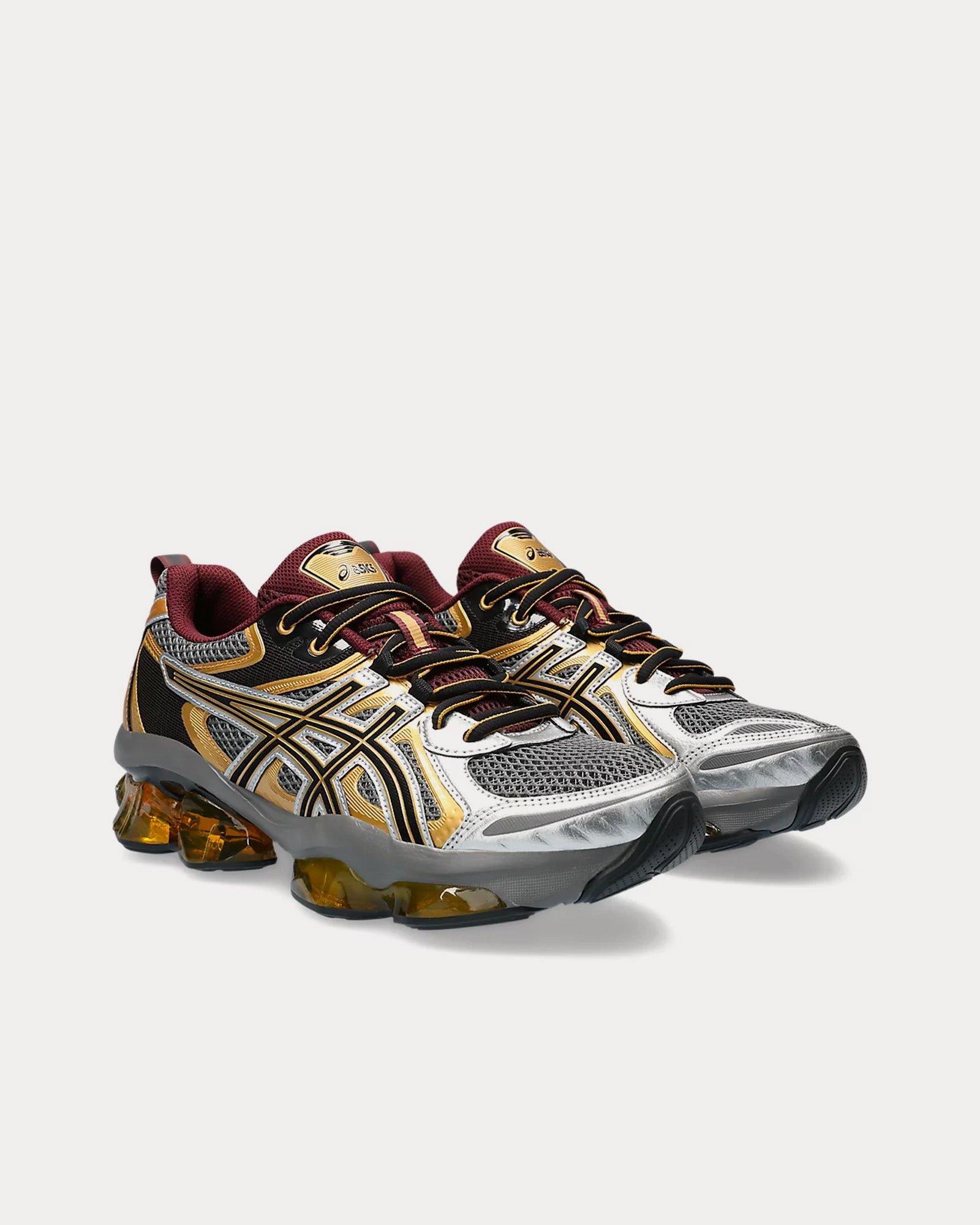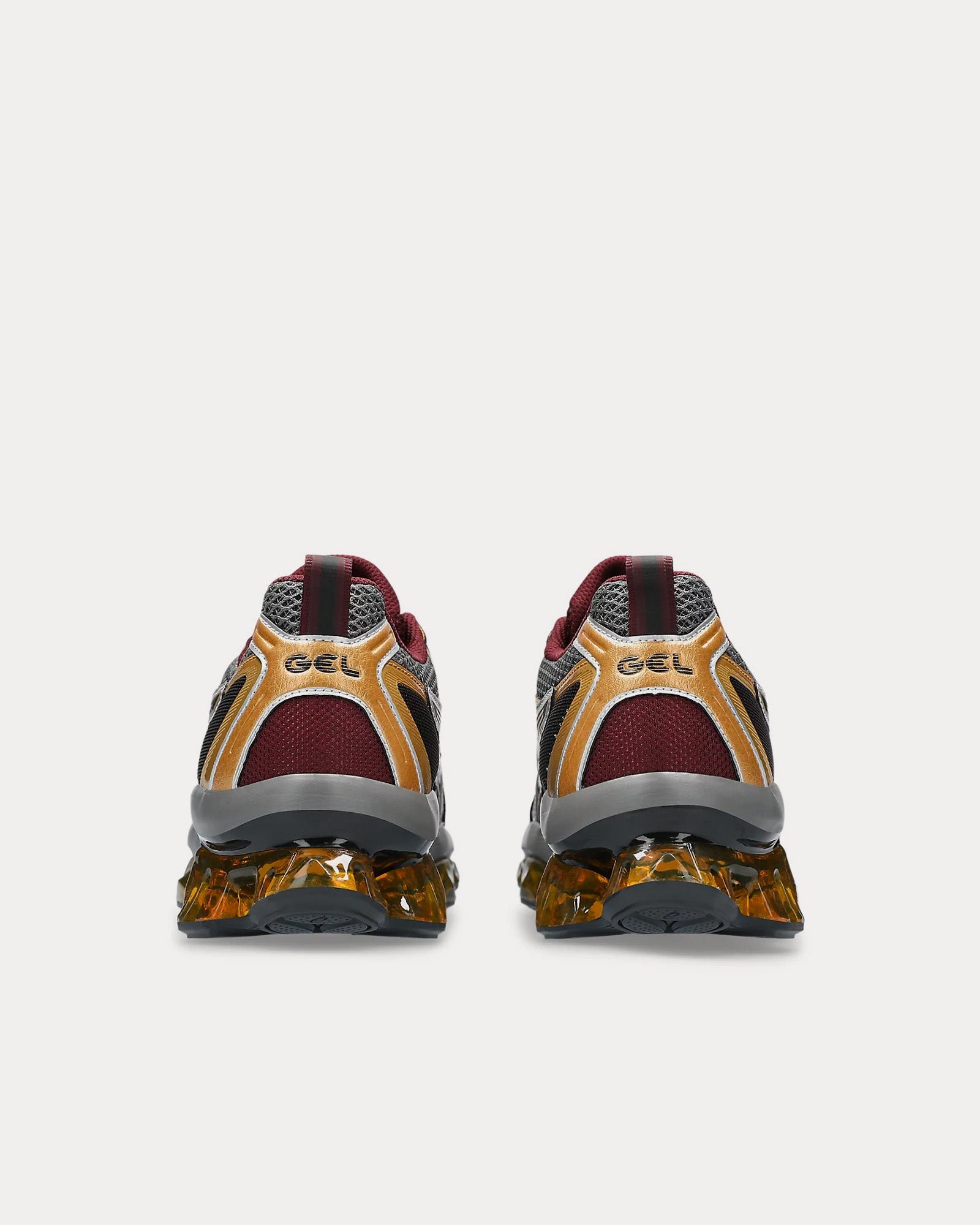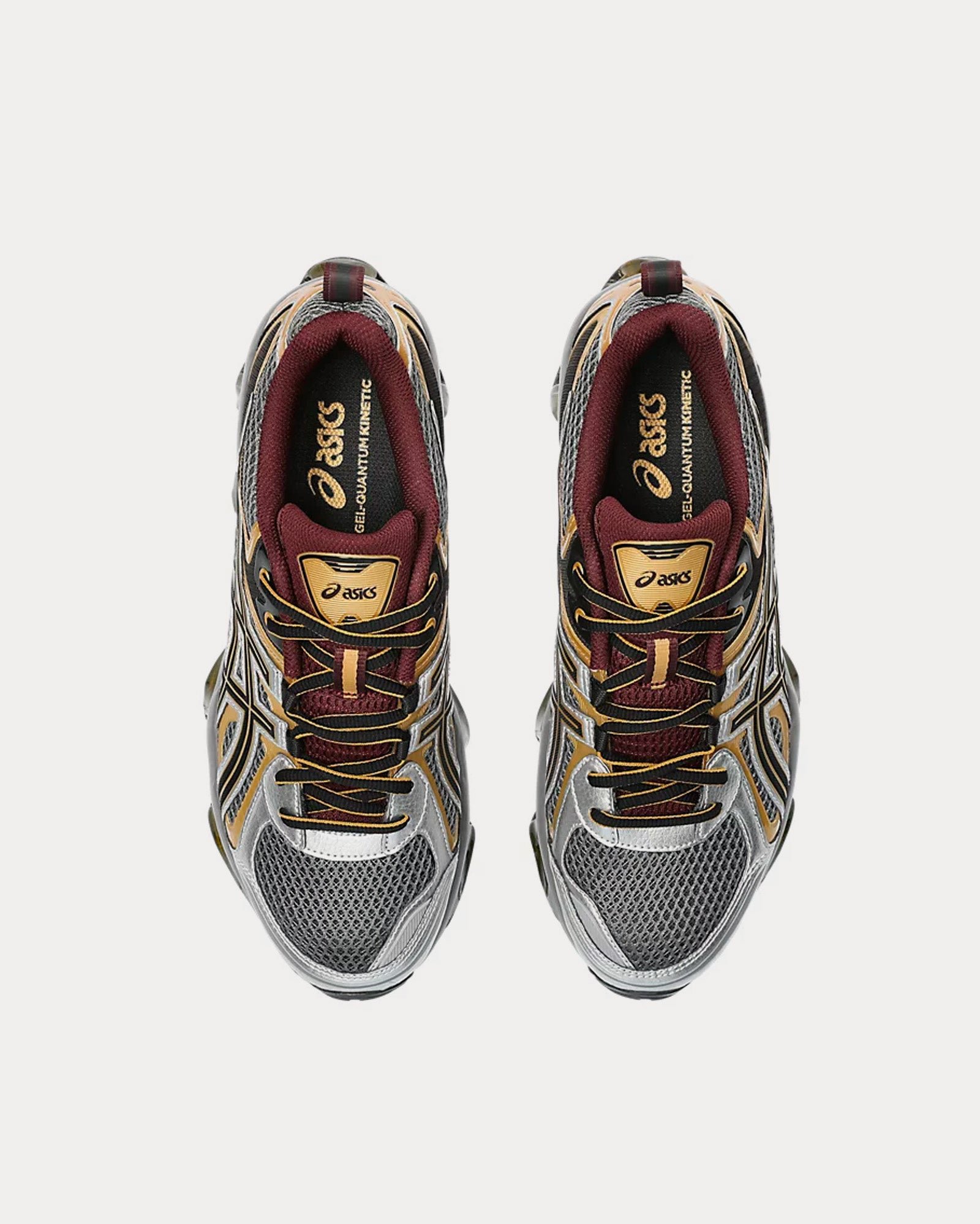 The men’s AsicsGel-Quantum Kinetic low top sneakers in Carbon and Pure Gold feature synthetic leathers and various mesh panels layered throughout the uppers, Scutoid GEL technology that has a closely packed 3D geometry and an off-axis structure, cushioning from the Asics running collection that has been re-tuned for everyday purposes, and an improved overall fit by providing a better foothold.