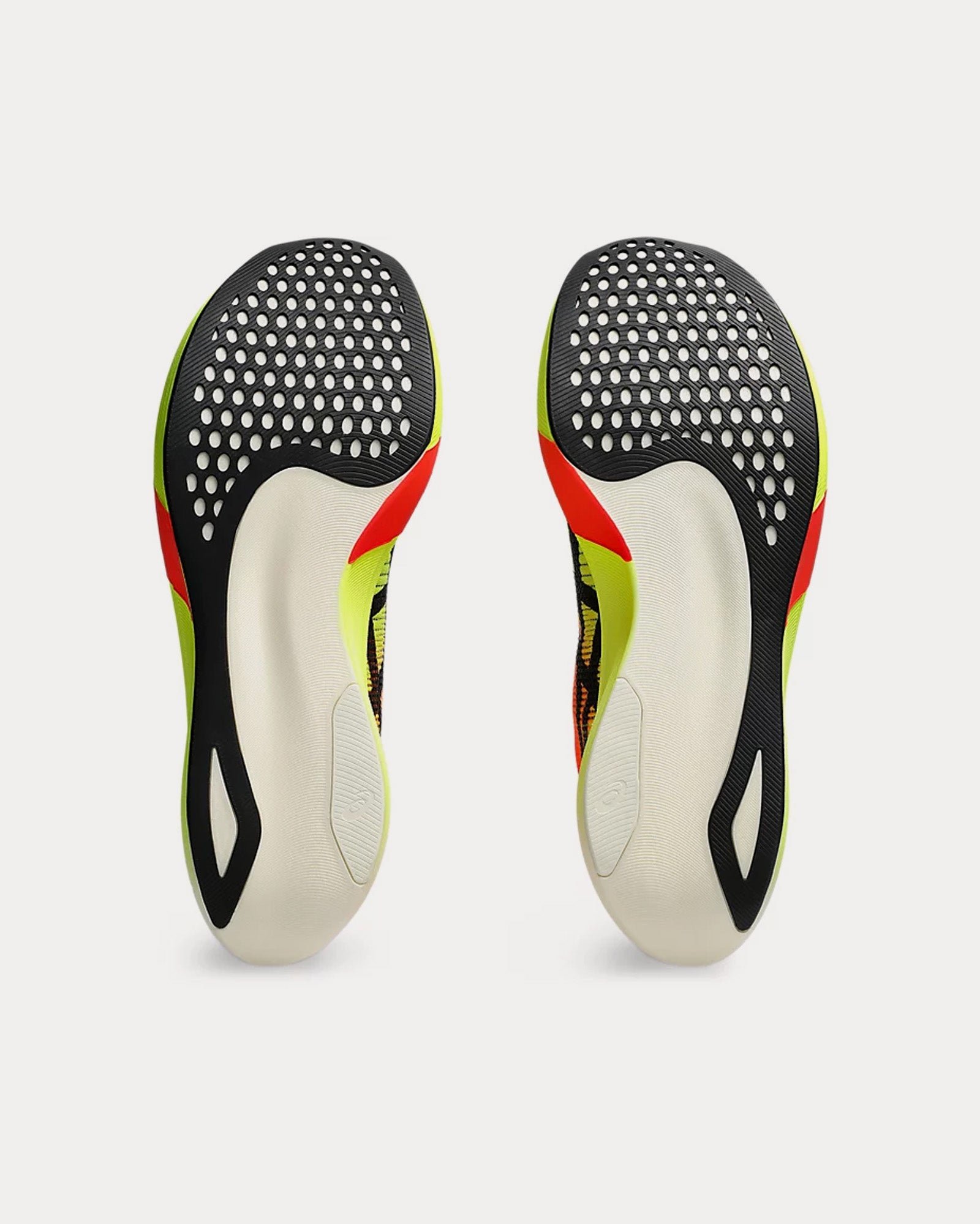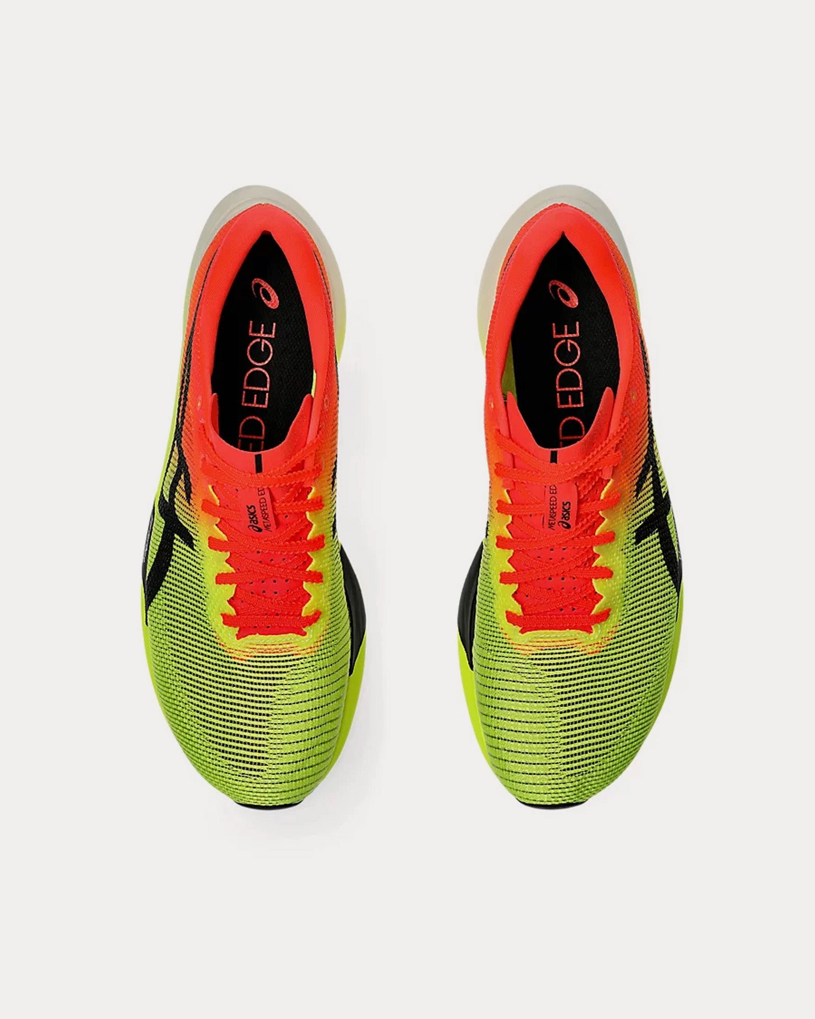 The unisex Asics Metaspeed Edge Paris running shoes in safety yellow and black are designed for cadence-style runners who are looking to start fast and finish faster and feature MOTION WRAP 2.0 uppers designed to improve breathability and comfort, FF TURBO PLUS cushioning to improve compression and help provide more energy savings, a curved sole design helping runners conserve more energy in each step, and carbon plates to guide your foot throughout your step and propels your foot forward.