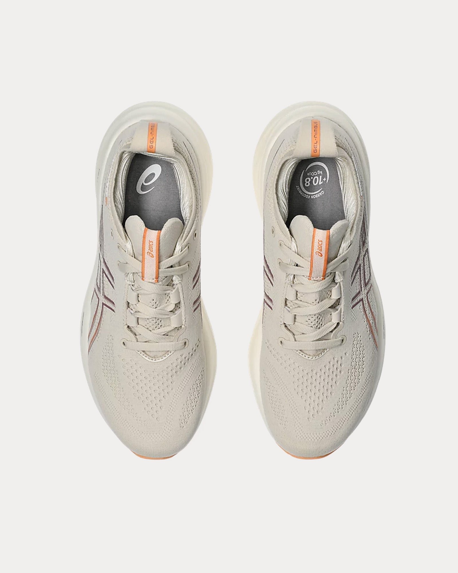 The women’s AsicsGel-Nimbus 26 running shoes in oatmeal and faded orange feature engineered knit uppers with a sockliner that is produced with the solution dyeing process that reduces water usage and carbon emissions, PureGEL™ and FF BLAST™ PLUS ECO technology, and ASICSGRIP™ rubber outsoles.