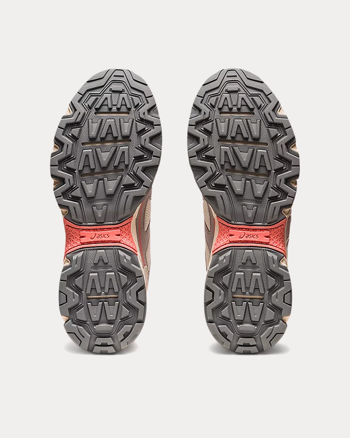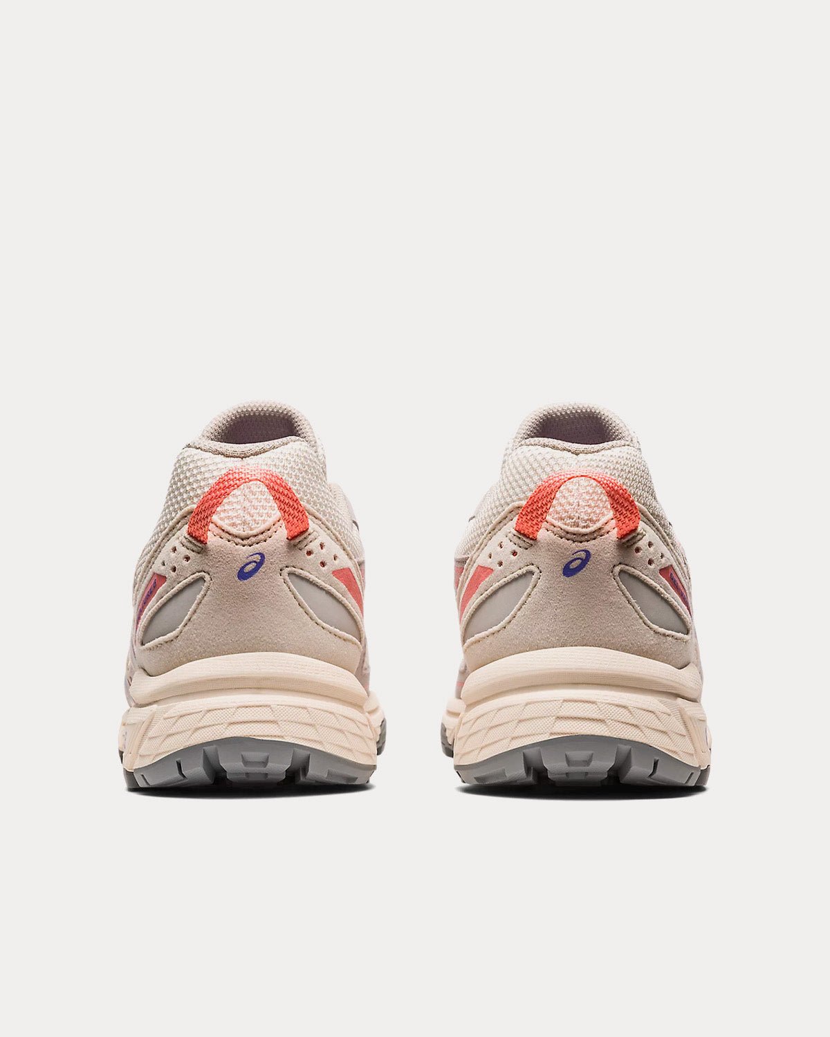 The women’s AsicsGel-Venture 6 low top sneakers in cream and oyster grey are based on trail-running sportstyle designs and feature synthetic leather uppers, panels with targeted support, rearfoot GEL™ technology, and a trail-specific traction pattern.