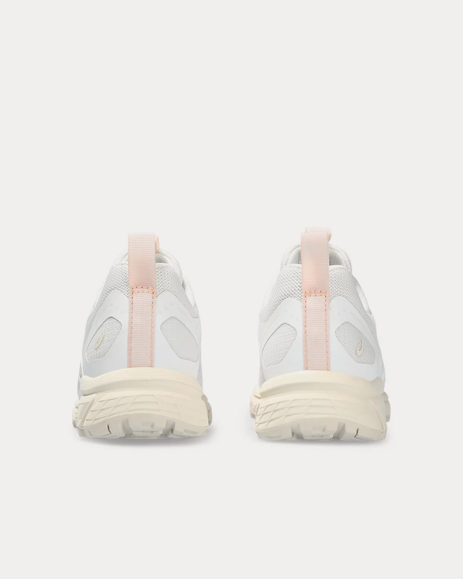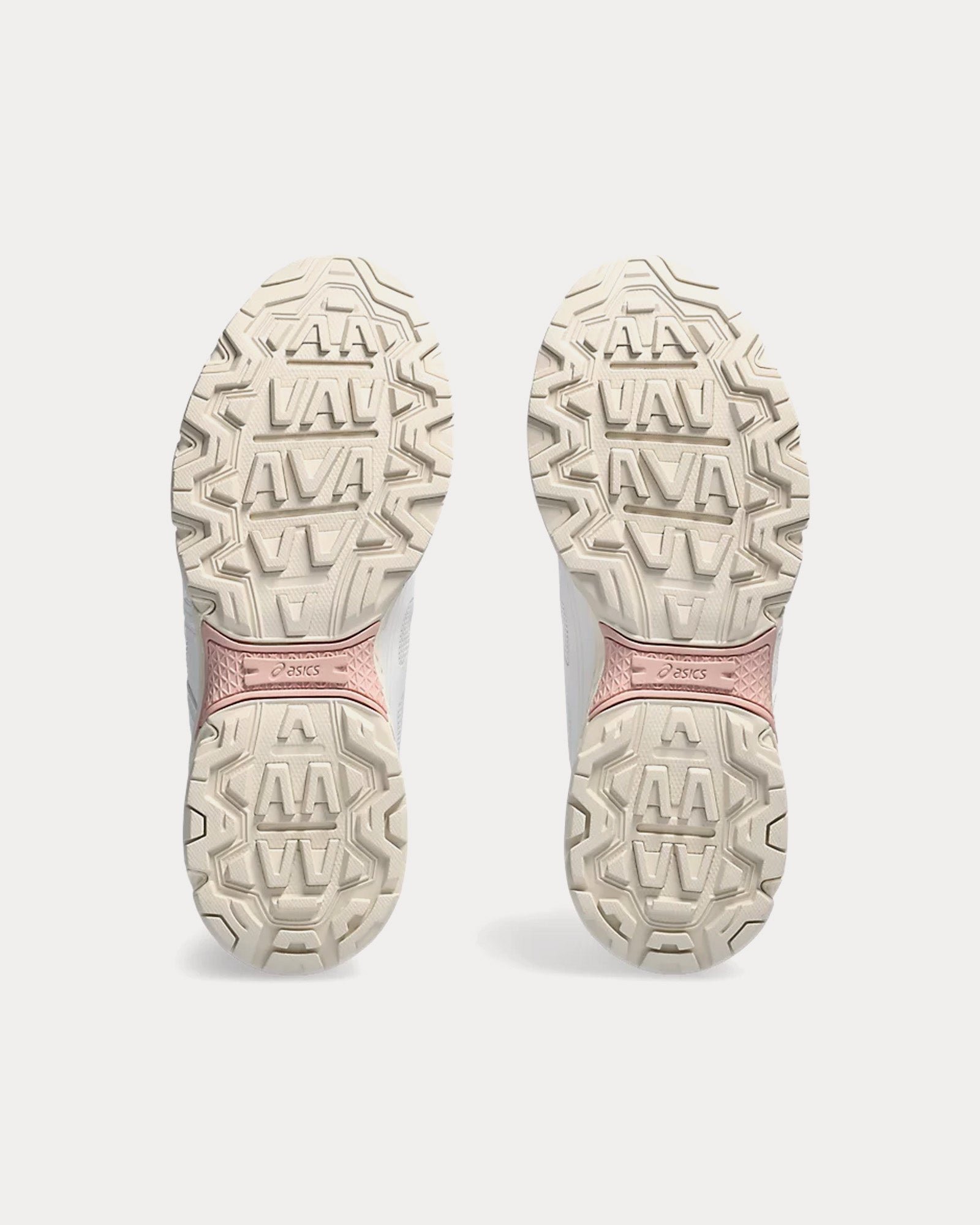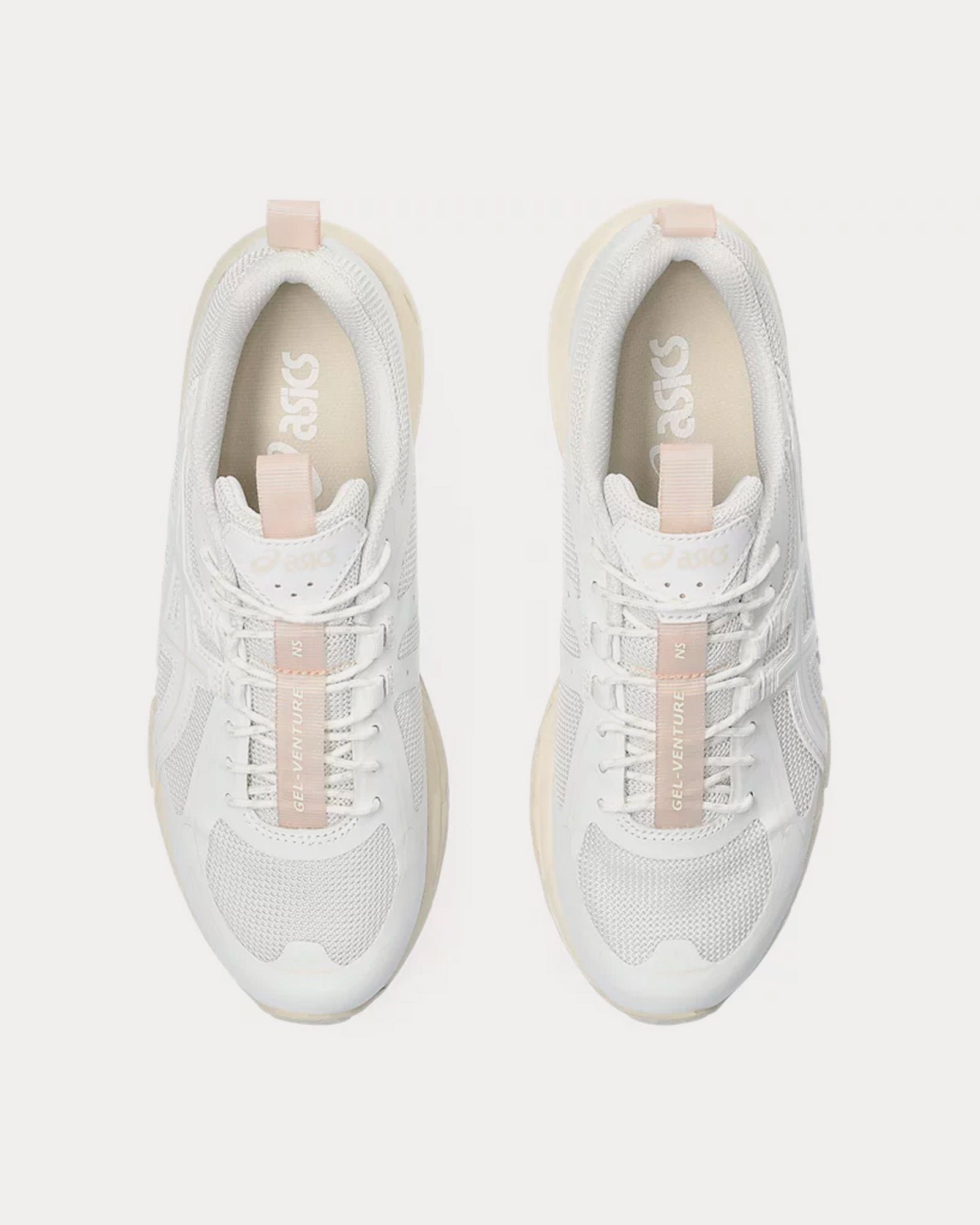 The women’s AsicsGel-Venture 6 NS low top sneakers in White and White are based on trail-running sportstyle designs and feature synthetic leather uppers, panels with targeted support, rearfoot GEL™ technology, and a trail-specific traction pattern.