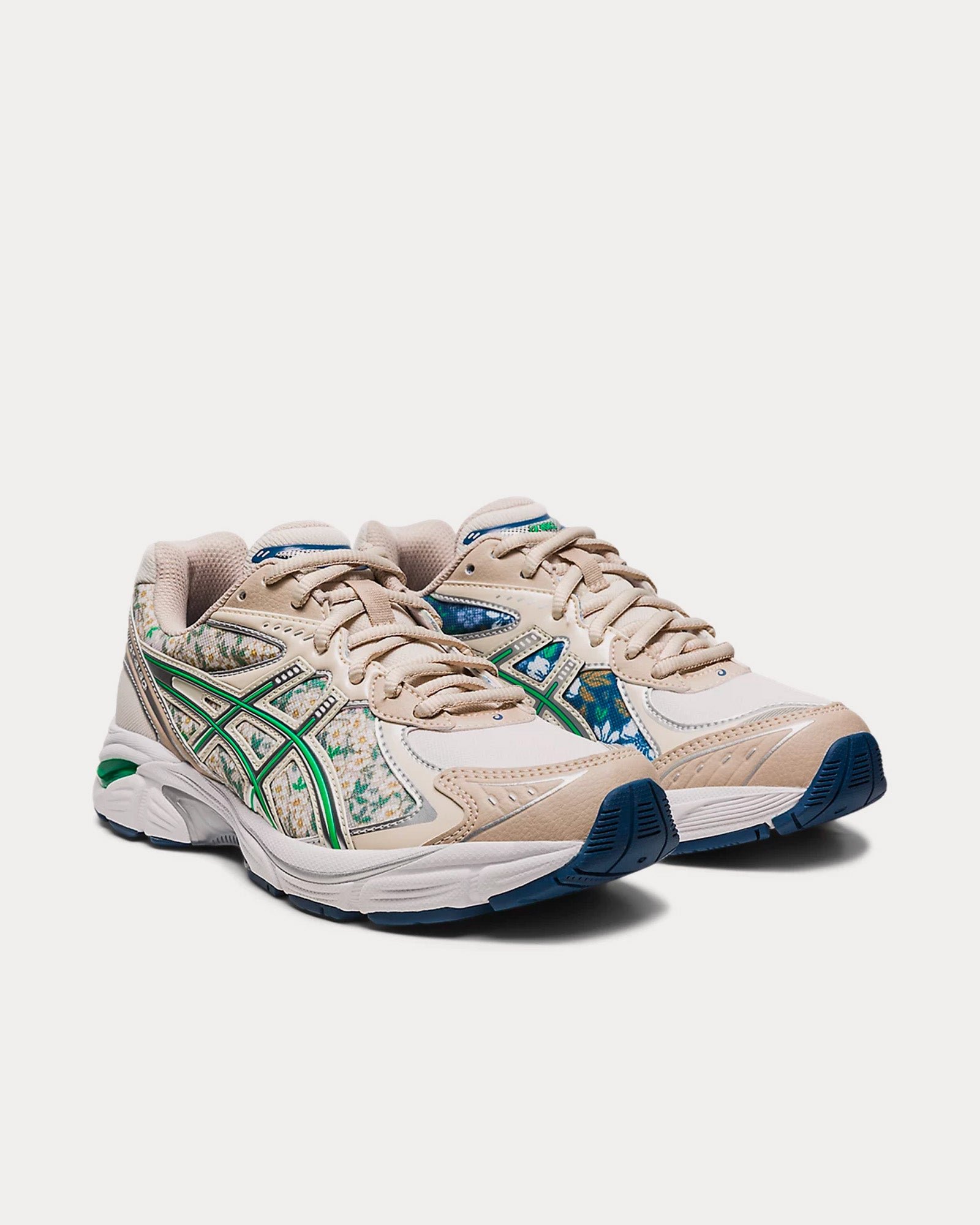 The women’s AsicsGT-2160 low top sneakers in oatmeal and simply taupe feature layered synthetic leather upper, sleek aesthetic, and wavy forefoot sculpting.