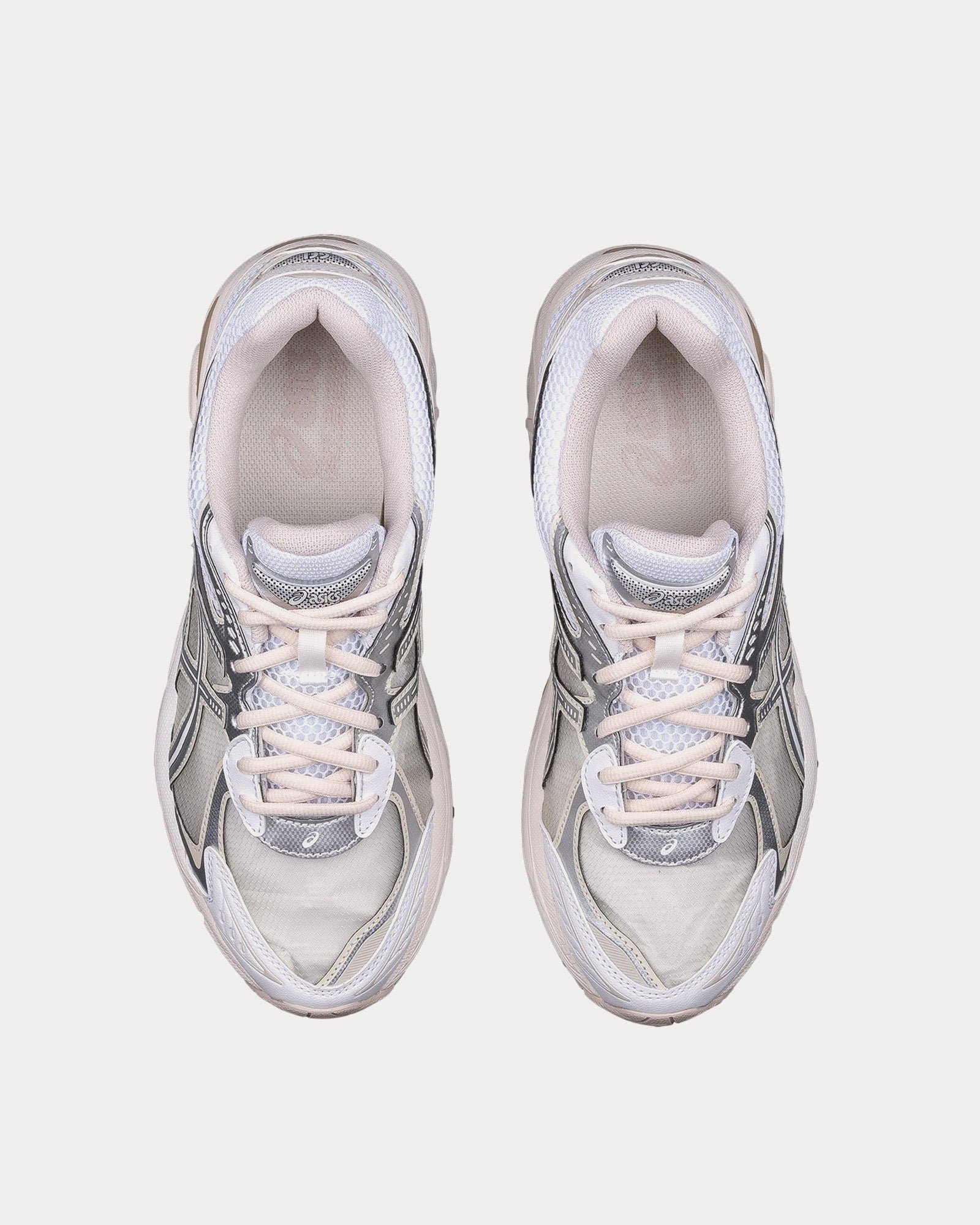 The unisex Asics x Above the Clouds GT-2160 low top sneakers in white and pure silver feature layered synthetic leather uppers, sleek aesthetic, and wavy forefoot sculpting.