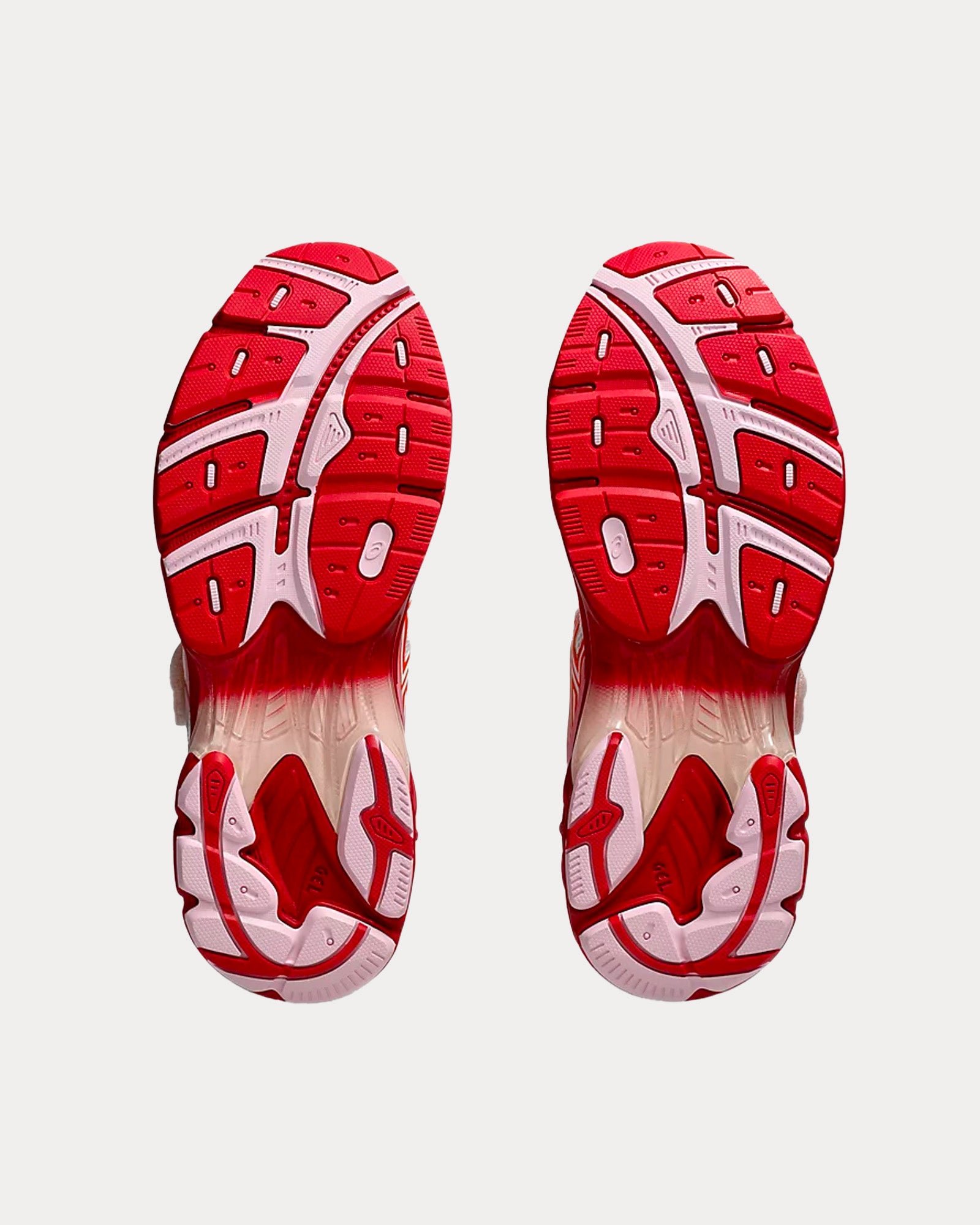 The unisex Asics x Cecilie BahnsenGT-2160 low top sneakers in white and habanero feature intricate couture detailing and technical function, 2000’s era upper design with recognizable lines, and silver overlays upon an innovative mesh base, and ASICS’ GEL technology enhances the midsole for an optimal wearing experience.