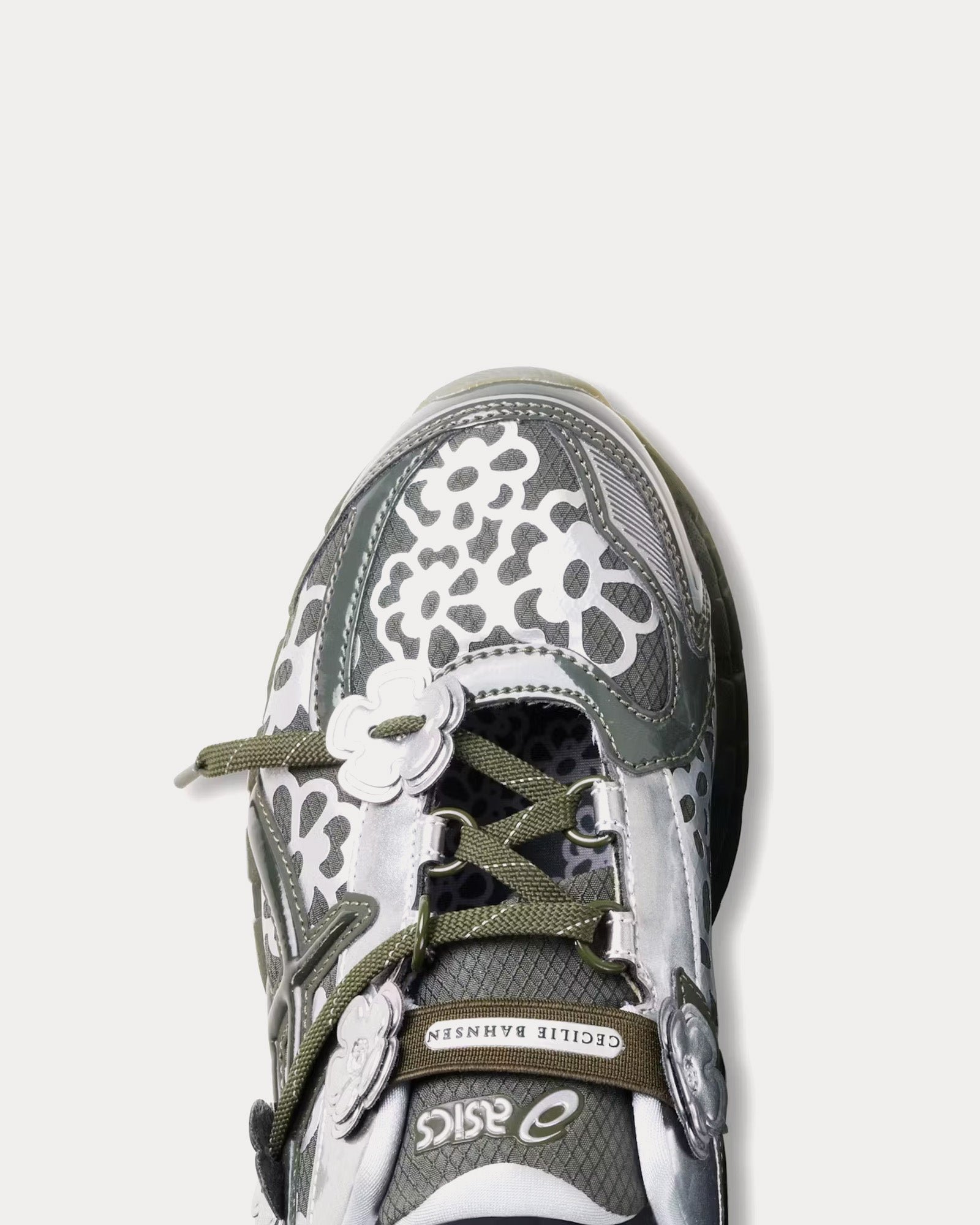 The women’s Asics x Cecilie Bahnsen Gel-Kayano 20 low top sneakers in Olive merge high-fashion femininity with technical performance in a poetic reimagining of ASICS heritage. Continuing Bahnsen’s reinterpretation of the Mary Jane silhouette, this design introduces sculptural detailing with a half-tongue construction and a delicate 3D floral ‘cage’ formed from her signature flower motif.