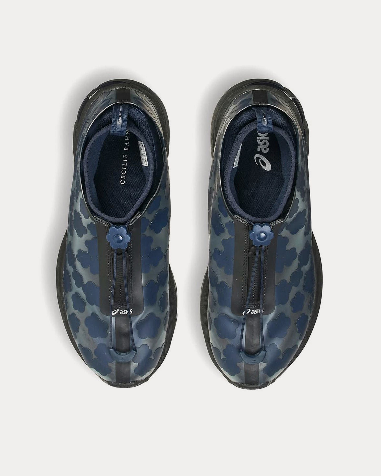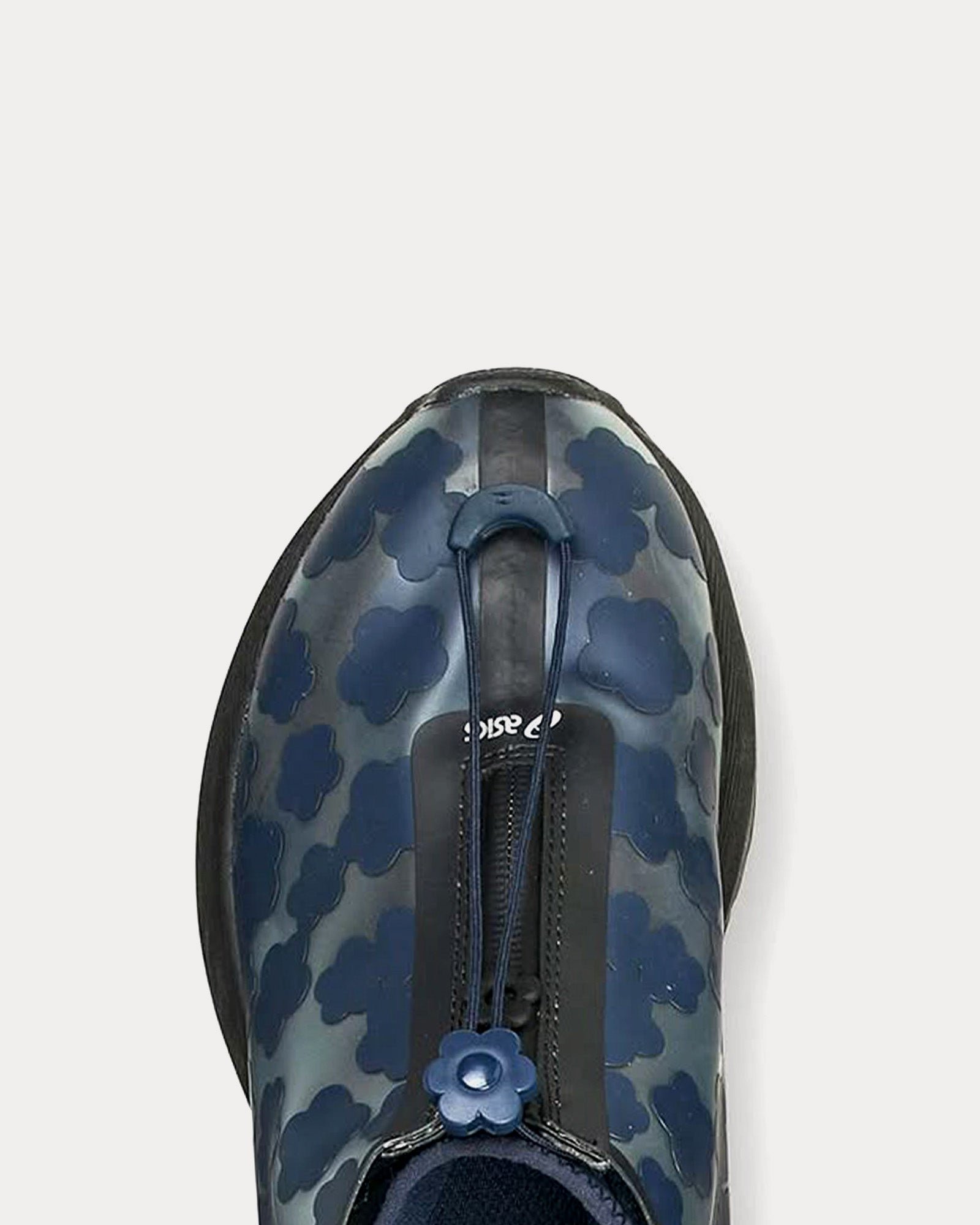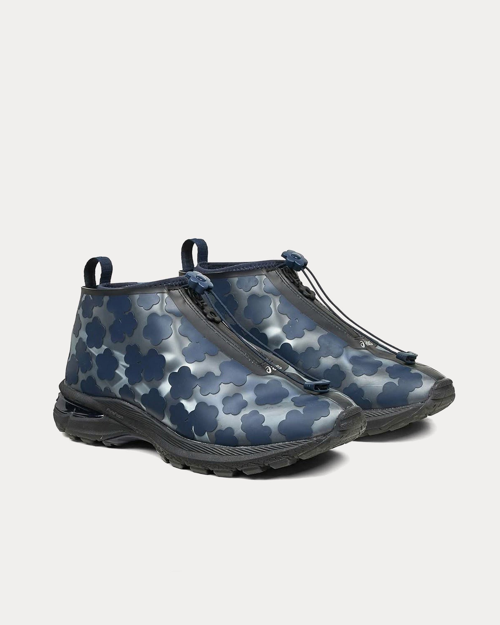 The upper features a shiny, quilted design with delicate floral embroidery that peeks through a semi-transparent TPU rain cover, allowing subtle silver Asics stripes to shine through. A neoprene sock construction enhances comfort, while a concealed blind zipper at the front hides a traditionally laced upper, adding a refined, seamless look.