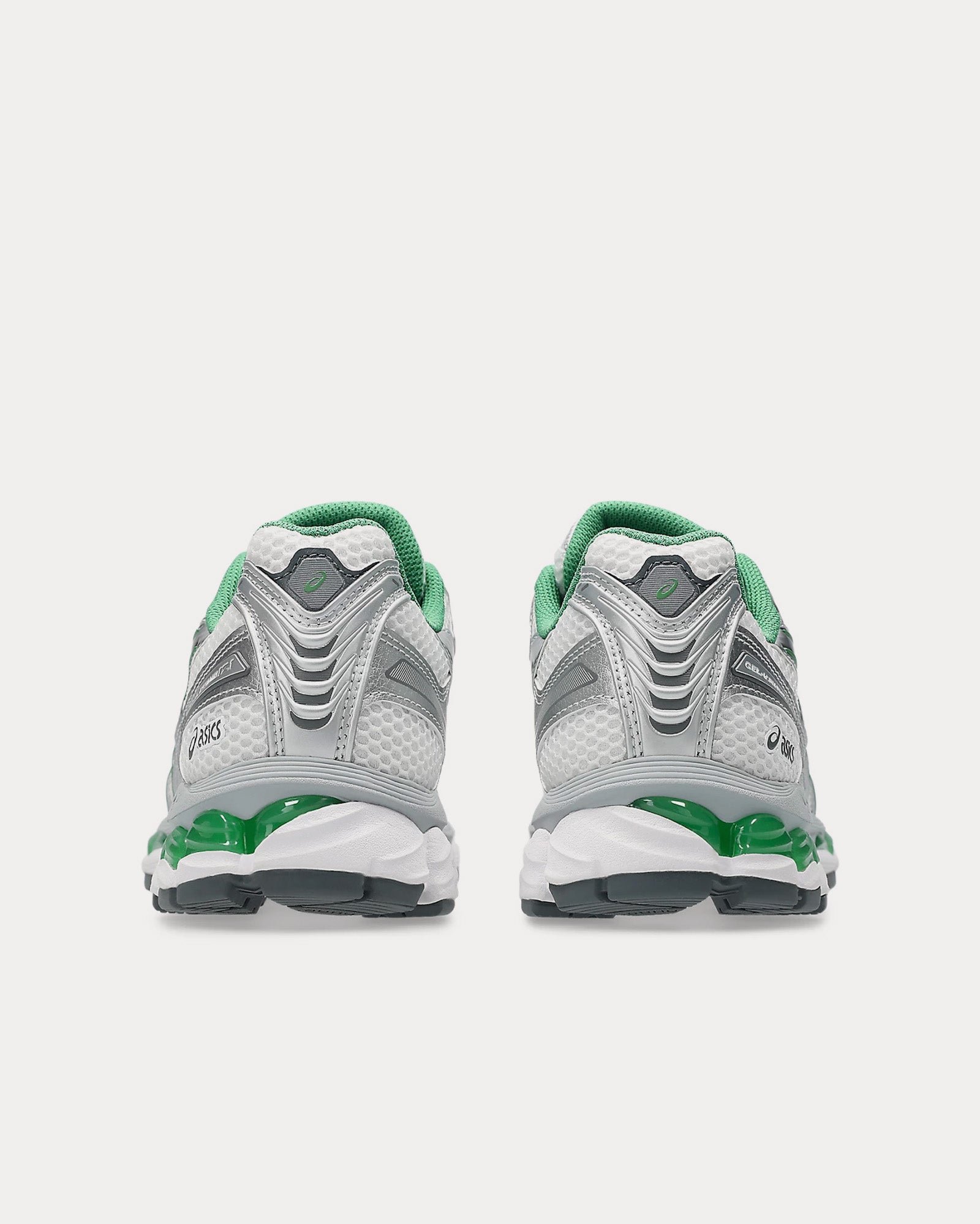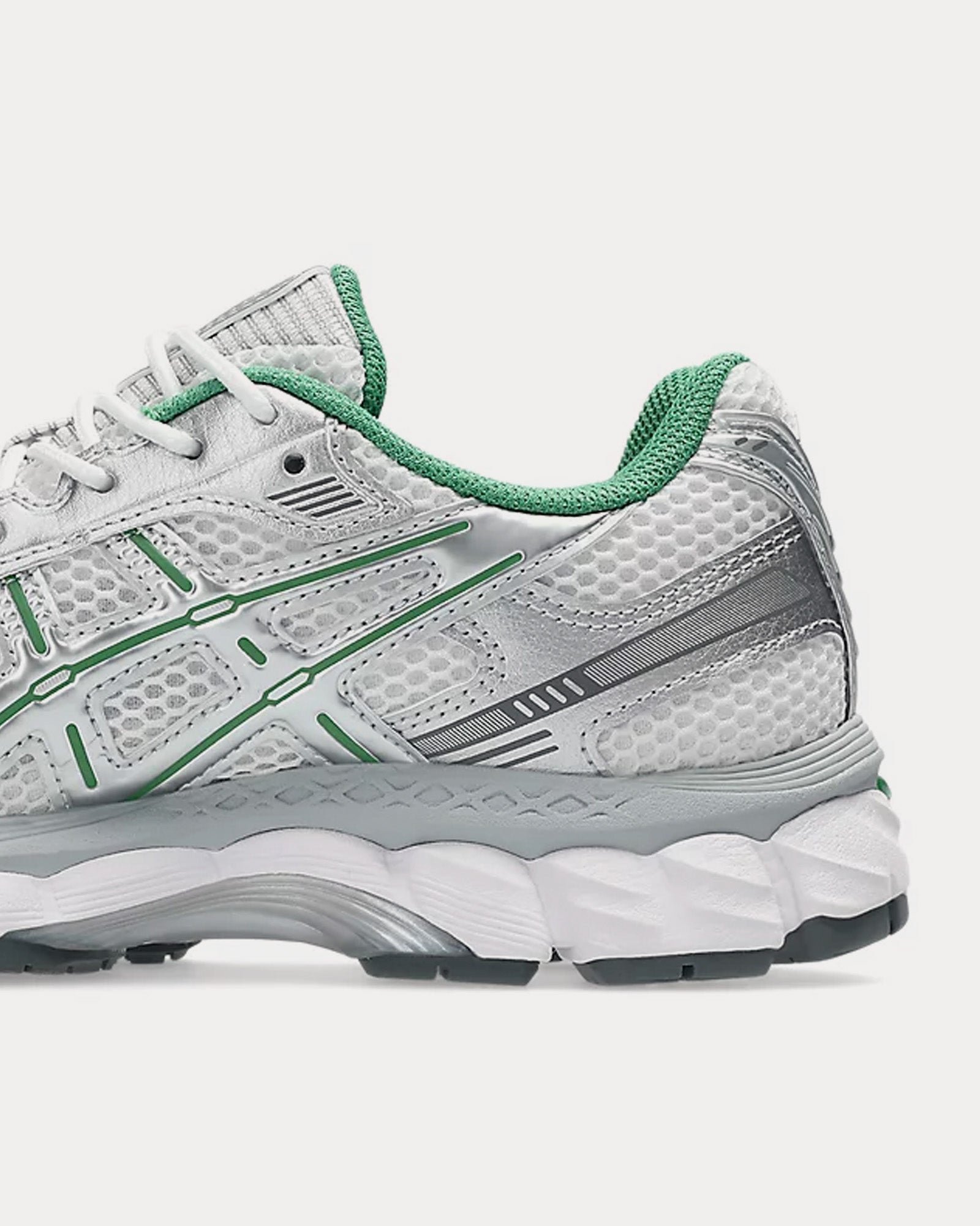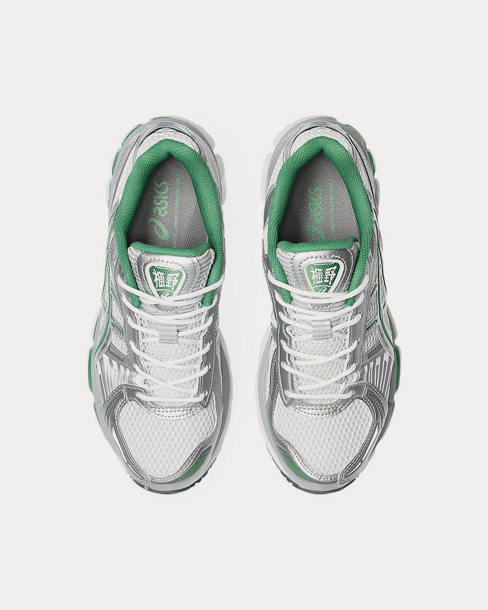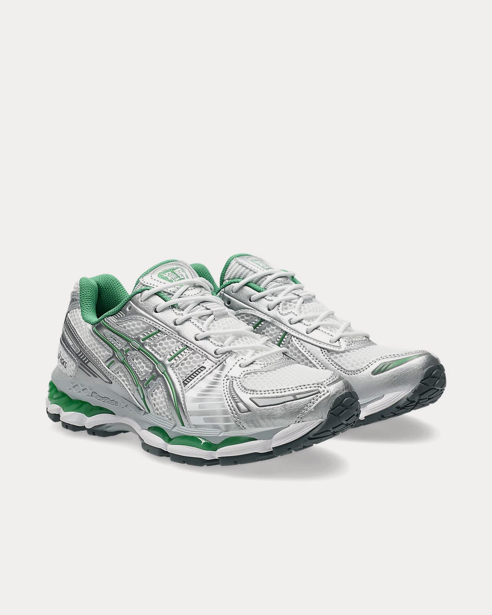 The unisex Asics Gel-Kayano 12.1 sneakers in Cream, Pure Silver, and Green represent a refined collaboration with KITH, blending nostalgic design cues from the iconic 2006 Gel-Kayano with modern tooling innovations. The upper draws inspiration from European gothic armor, featuring metallic structural elements combined with open mesh underlays that enhance airflow and keep feet cool during wear.