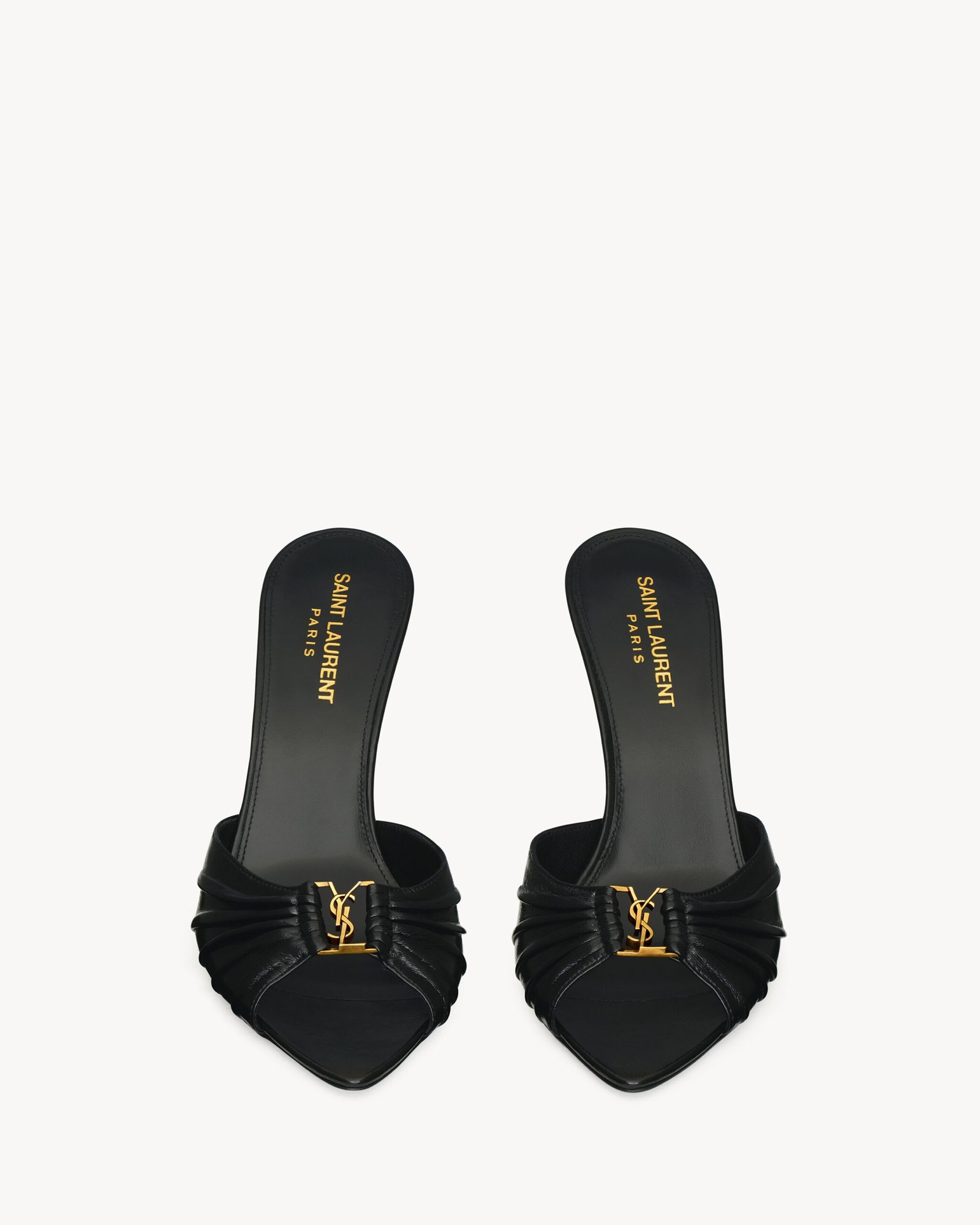 Mules à talon aiguille, munies d’un bout pointu ouvert, et d’une bride froncée ornée du CASSANDRE.