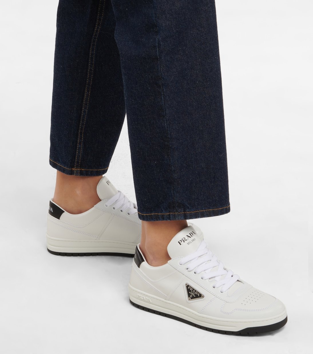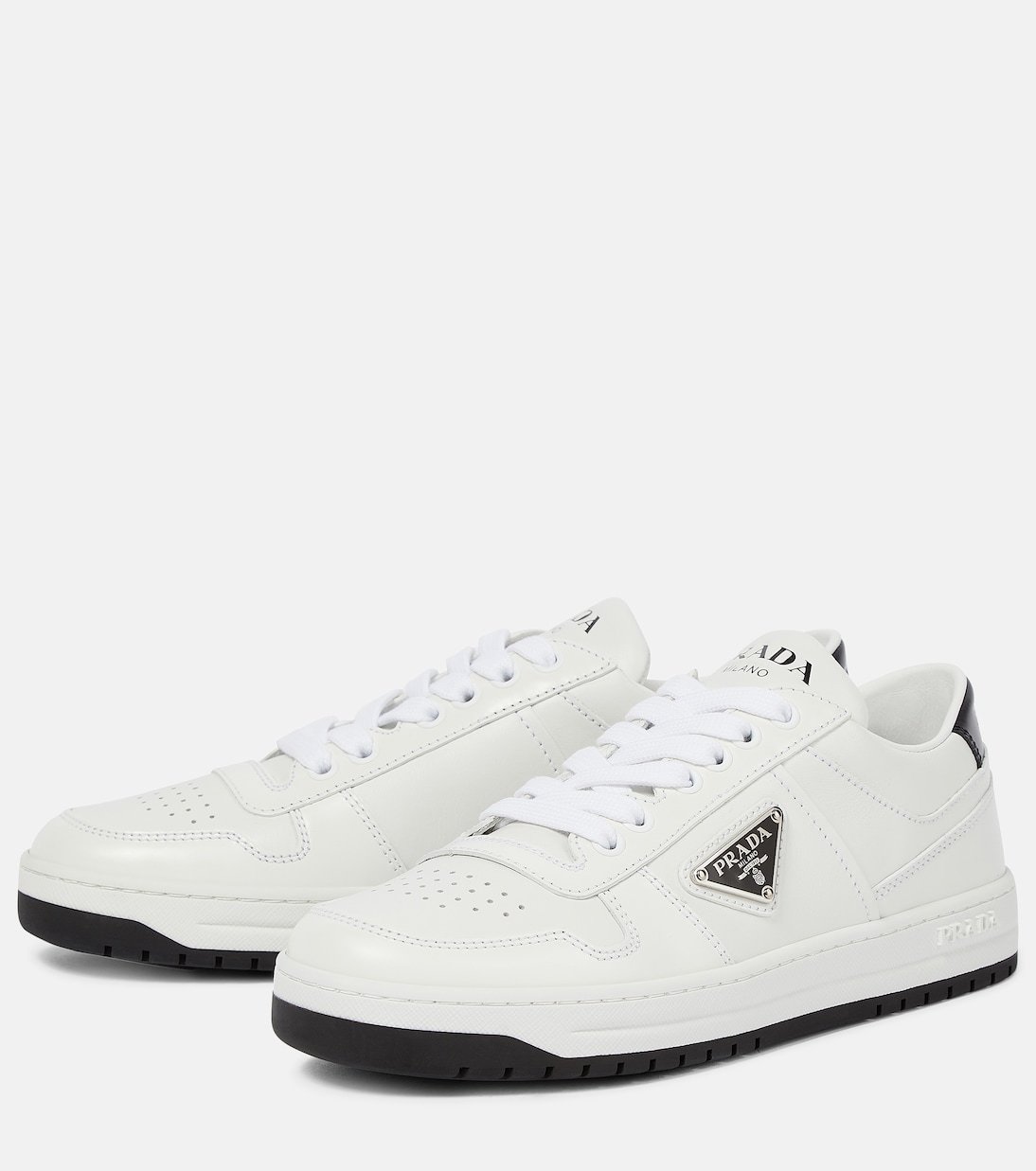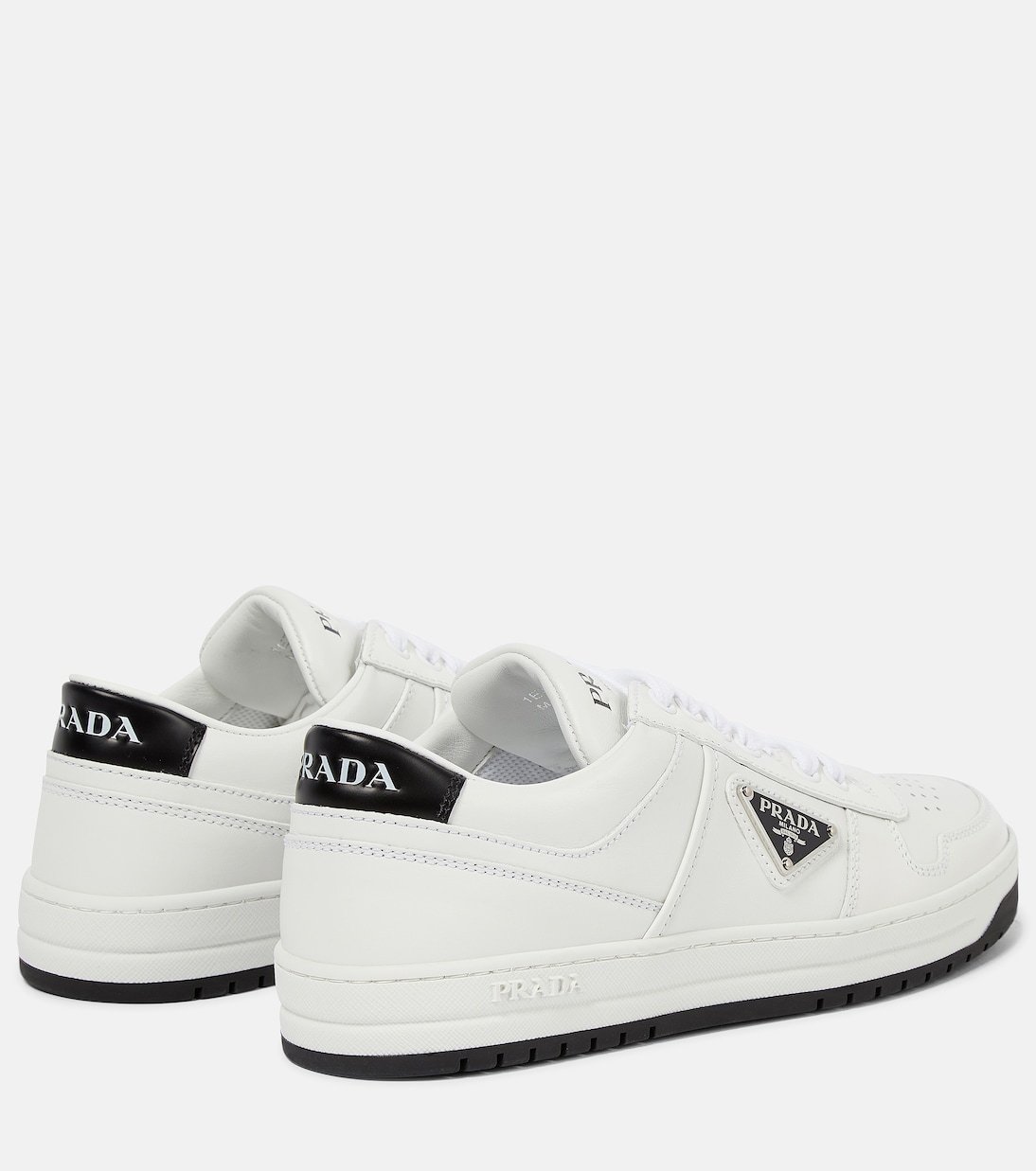 Ces baskets basses signées Prada sont conçues en cuir perforé. Elles arborent l’écusson triangulaire signature sur les côtés, ainsi qu’un imprimé manuscrit sur la languette et les talons.
