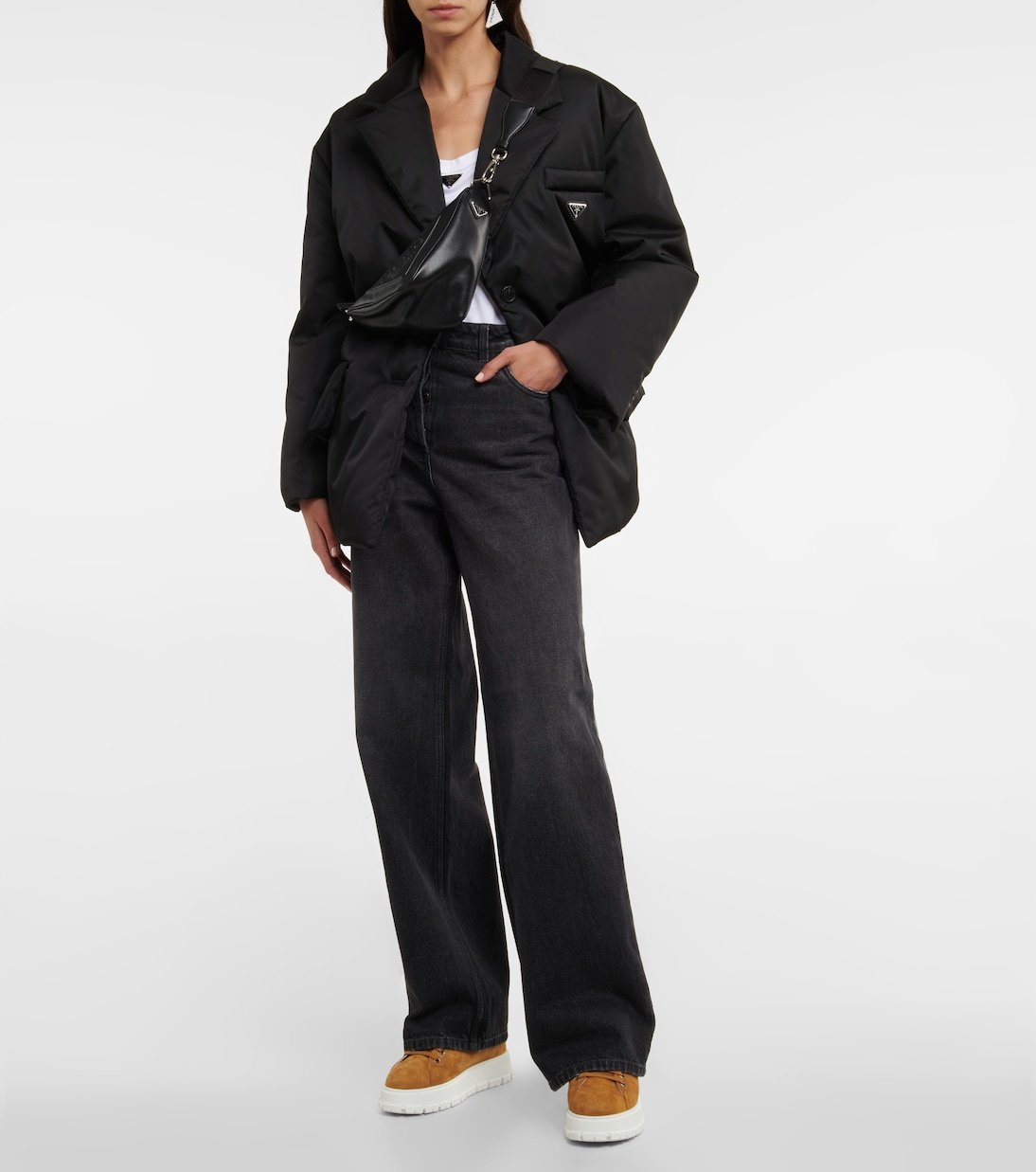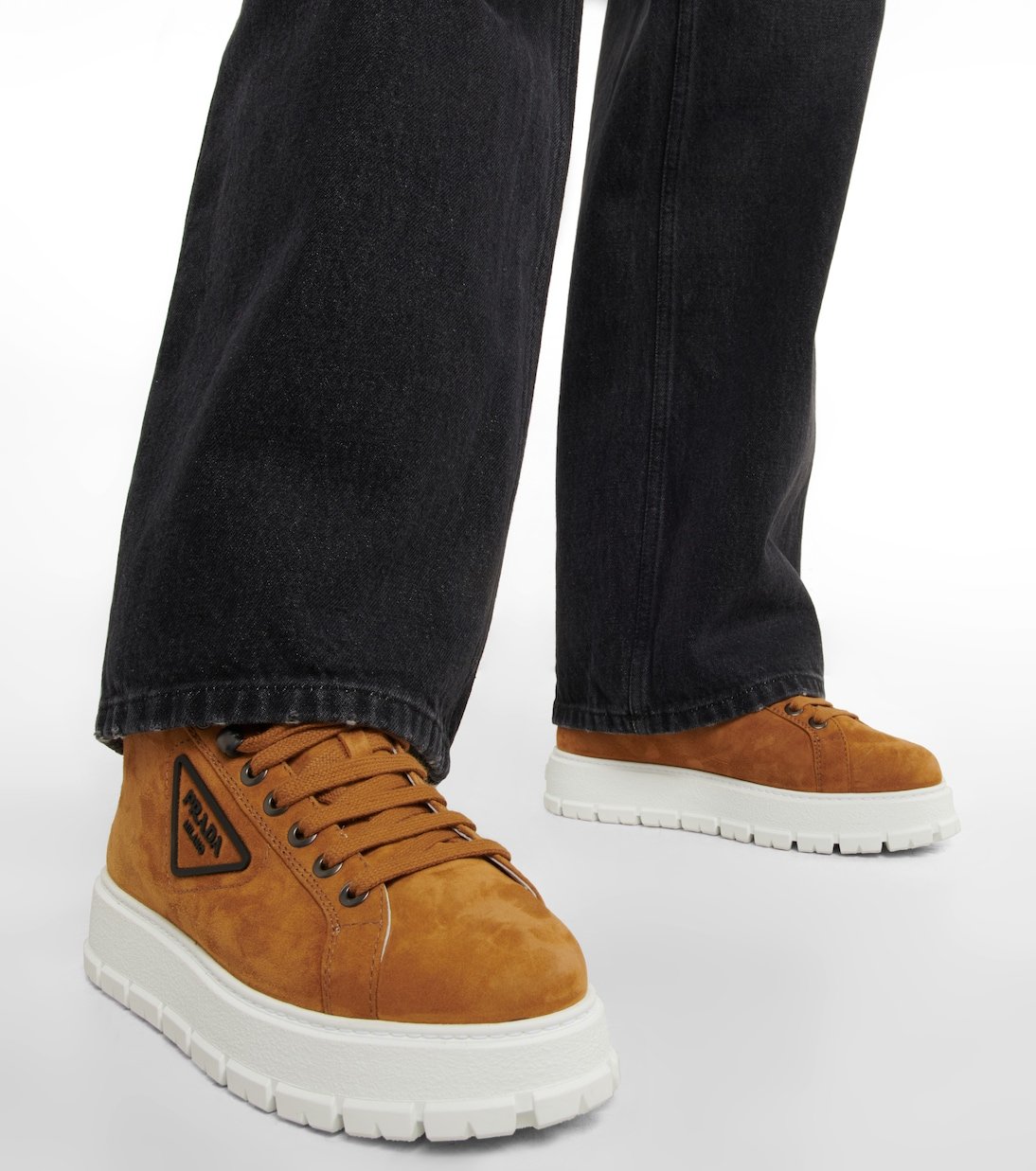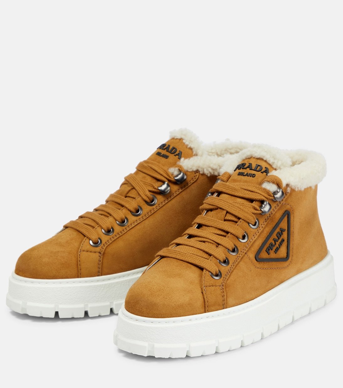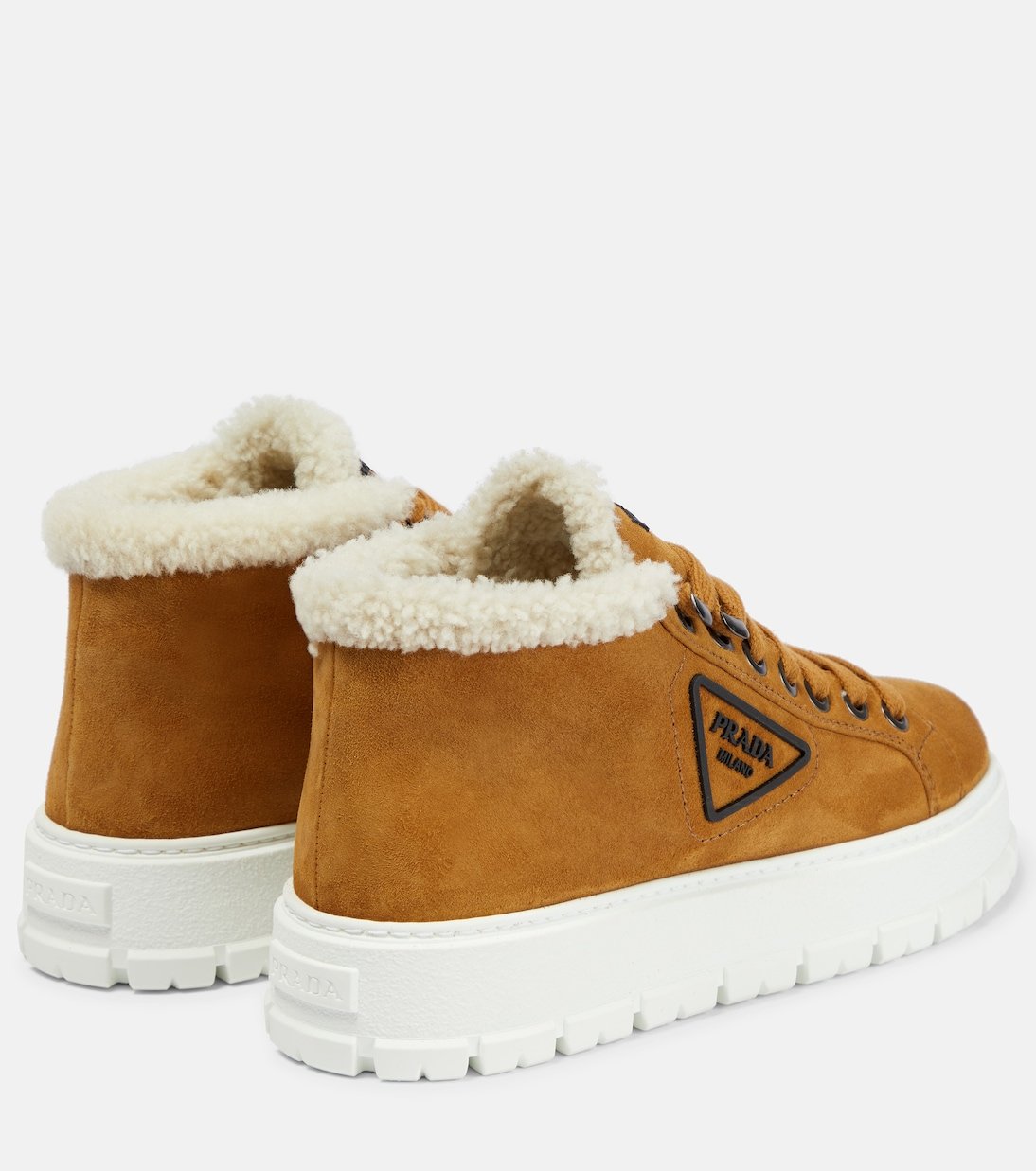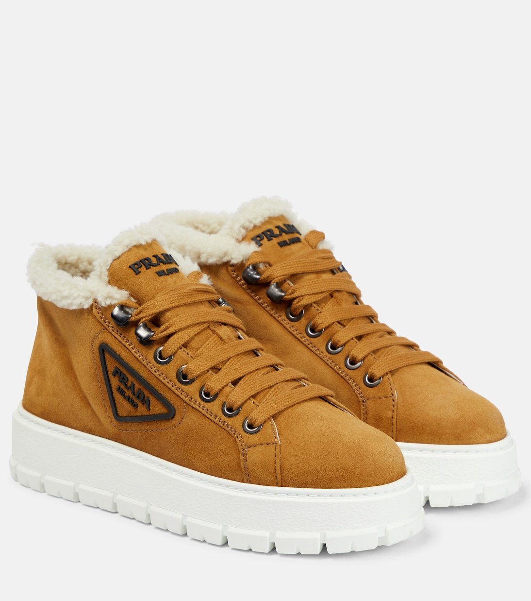 Réalisées en daim, ces baskets basses de Prada se définissent par une semelle striée en caoutchouc et des bords et un intérieur en shearling.