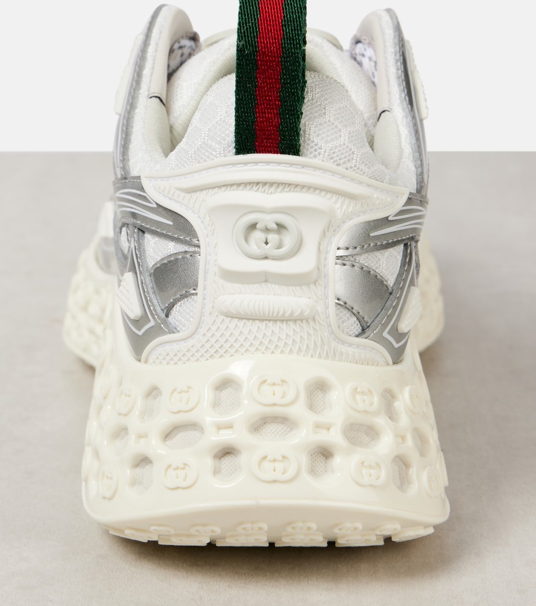 Les baskets Gucci Cub3d mêlent une silhouette avant-gardiste et un design pile dans l’air du temps. Composées à partir d’empiècements en résille et du matériau Demetra du label, elles reposent sur des semelles rembourrées d’EVA ponctuées d’un motif Interlocking G en 3D.