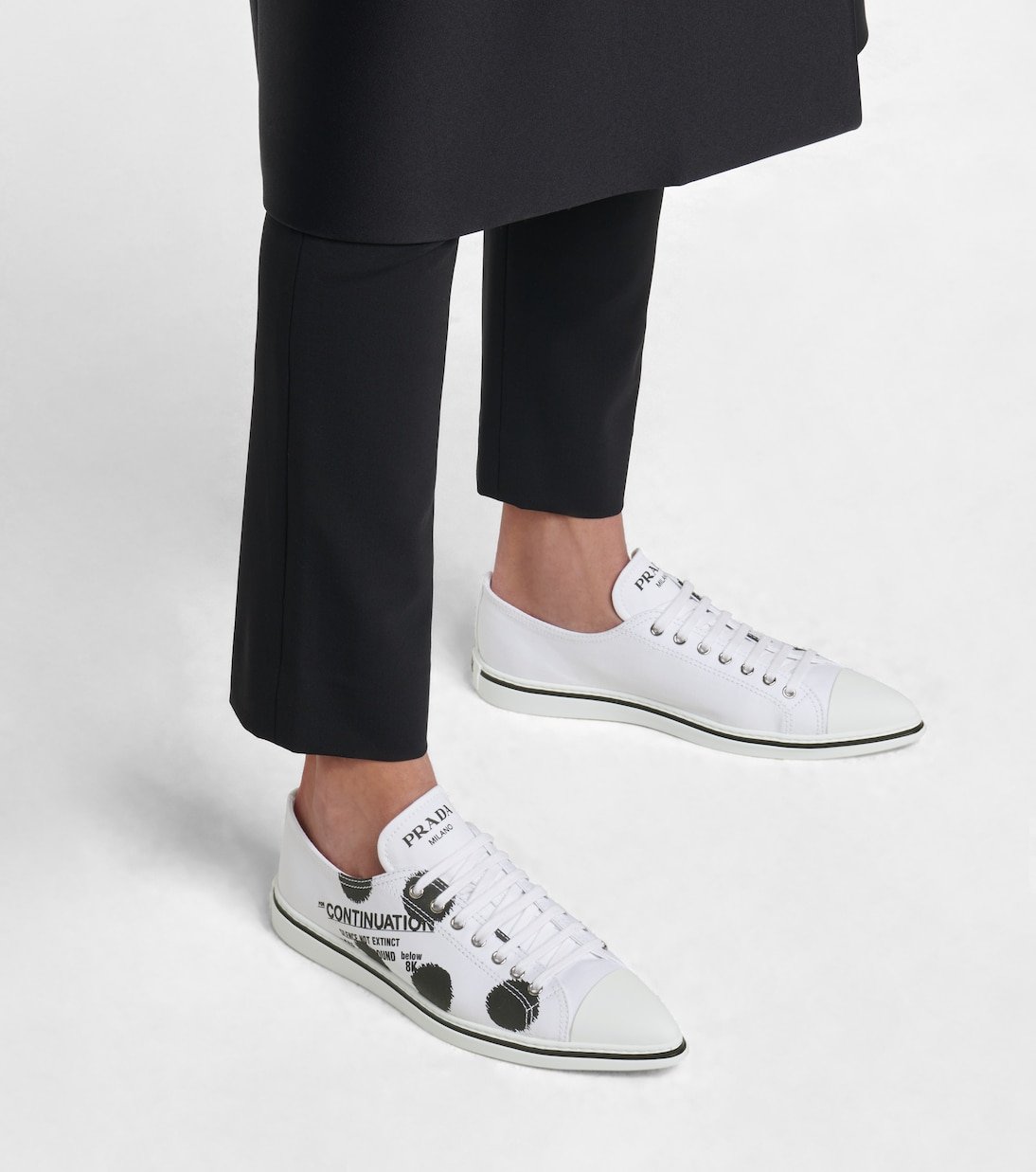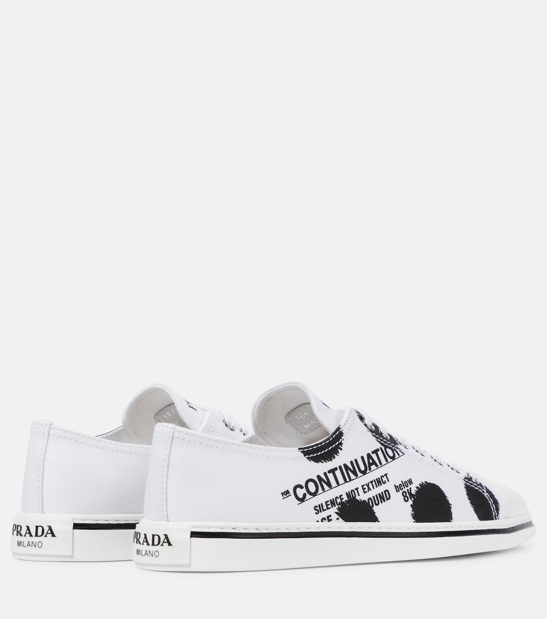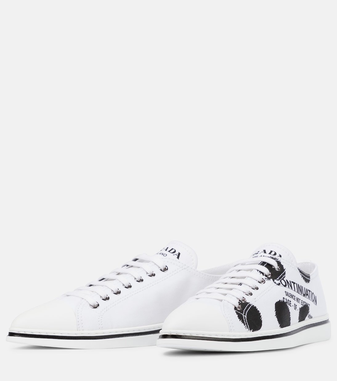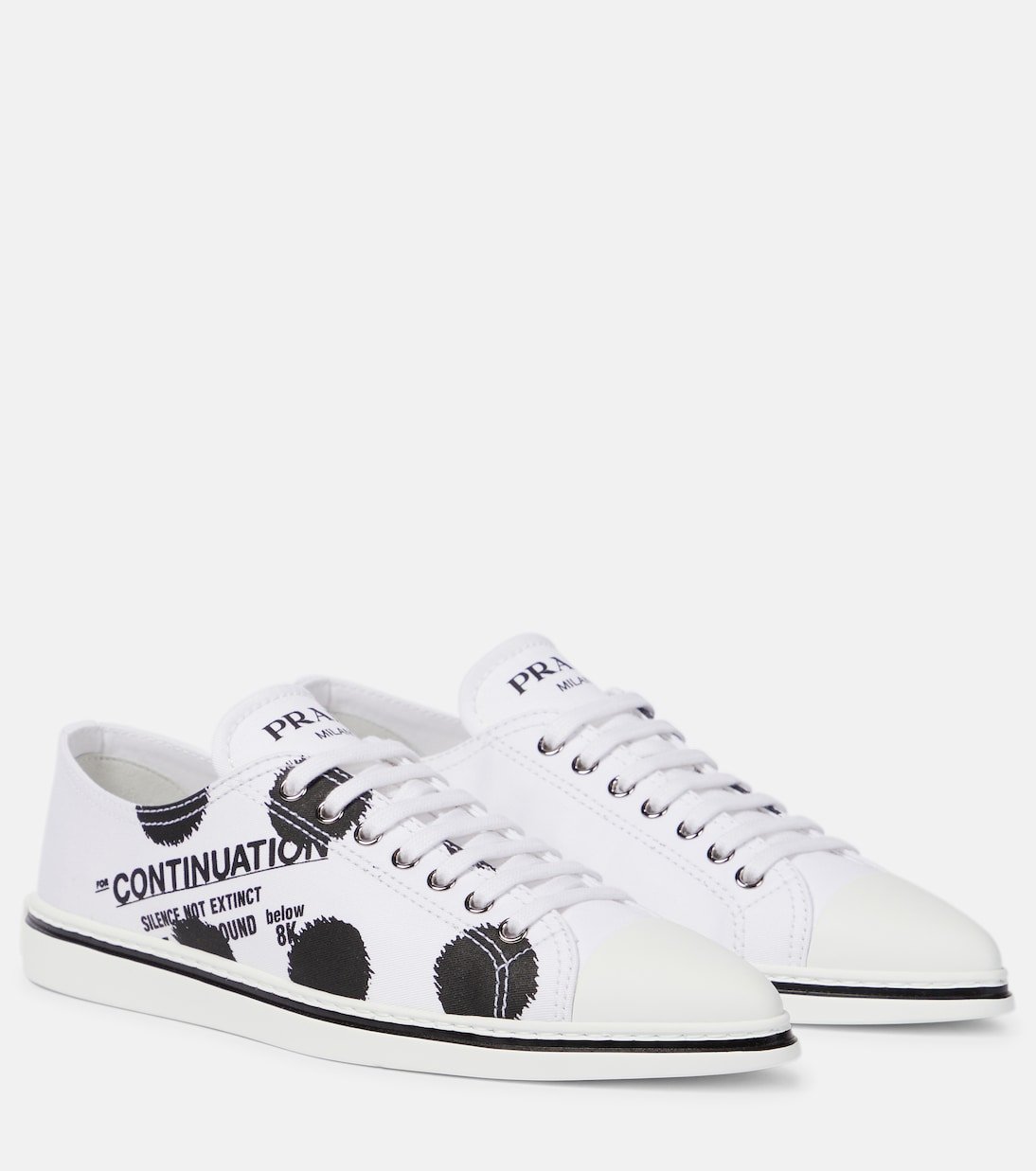 Fabriquées en Italie en toile de coton et imprimées d’inscriptions et pois noirs stylisés, ces confortables baskets blanches sont signées Prada. Cette paire lacée, caractérisée par une silhouette de tennis traditionnelle et subtilement rétro, complétera toutes sortes de tenues décontractées.