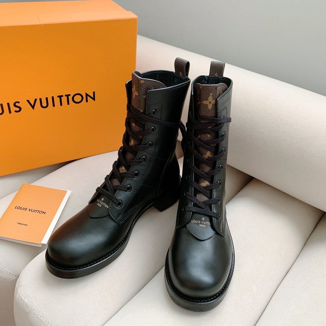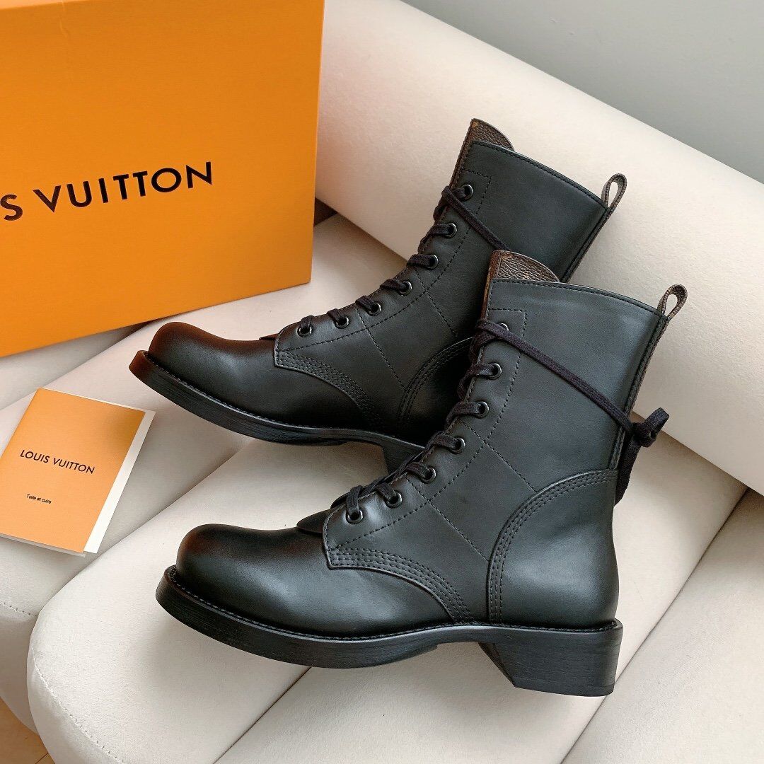 Interprétation raffinée de la botte de combat, les rangers Metropolis de Louis Vuitton allient caractère urbain et savoir-faire traditionnel. Ce modèle se distingue par son cuir noir lisse contrasté par des touches de toile Monogram sur la languette et le haut de la tige. Rehaussées d’une signature dorée, ces bottines intemporelles offrent une silhouette à la fois robuste et élégante pour un style quotidien affirmé