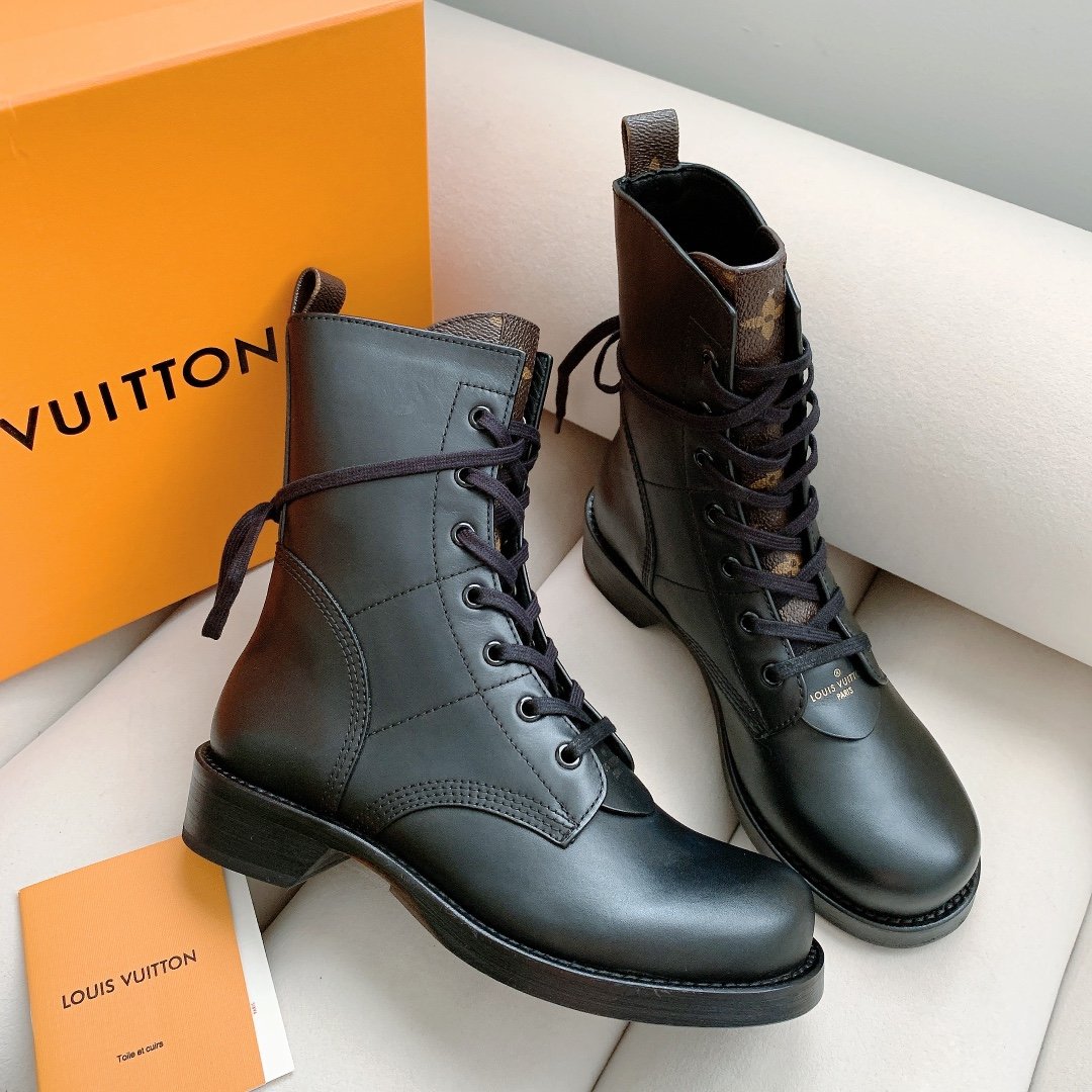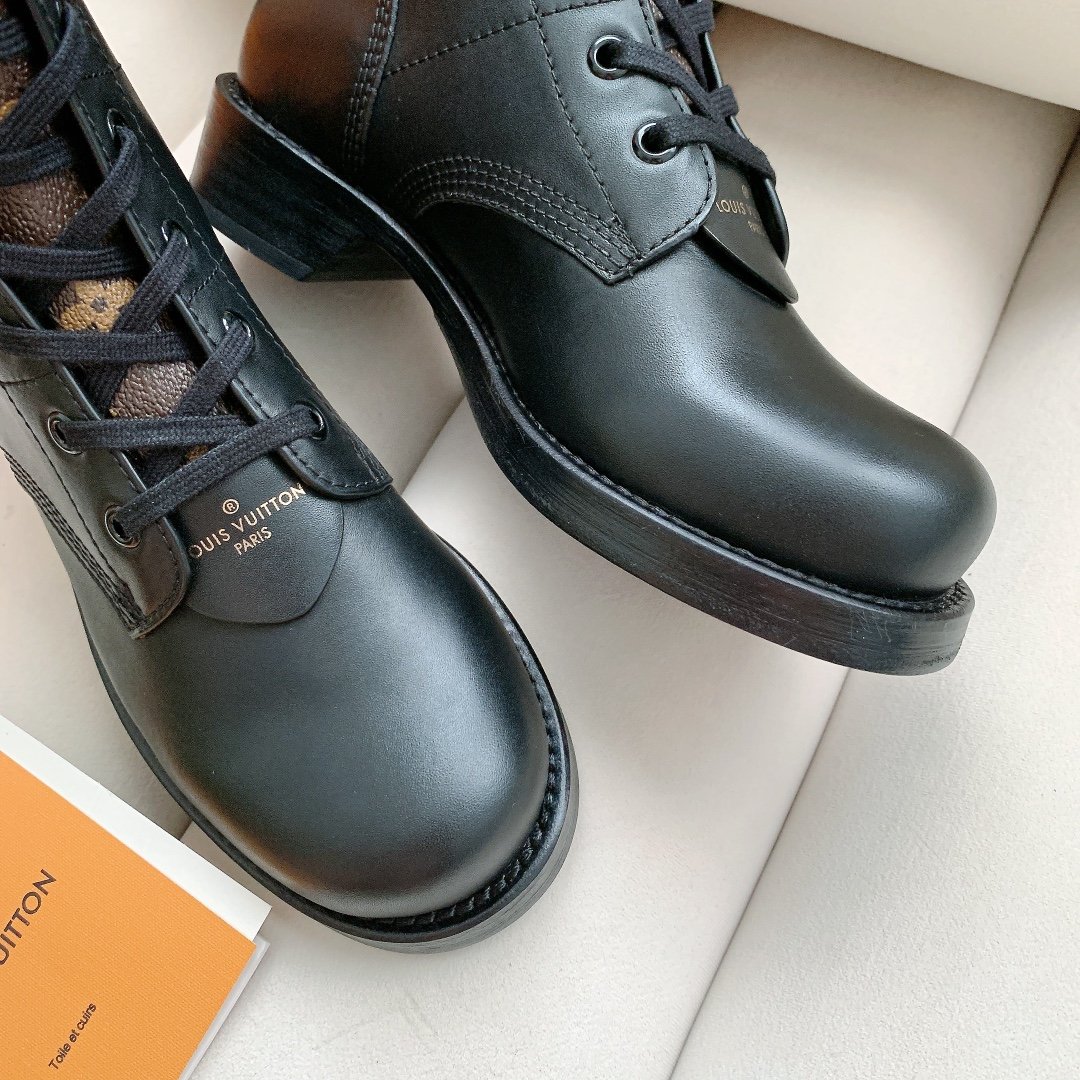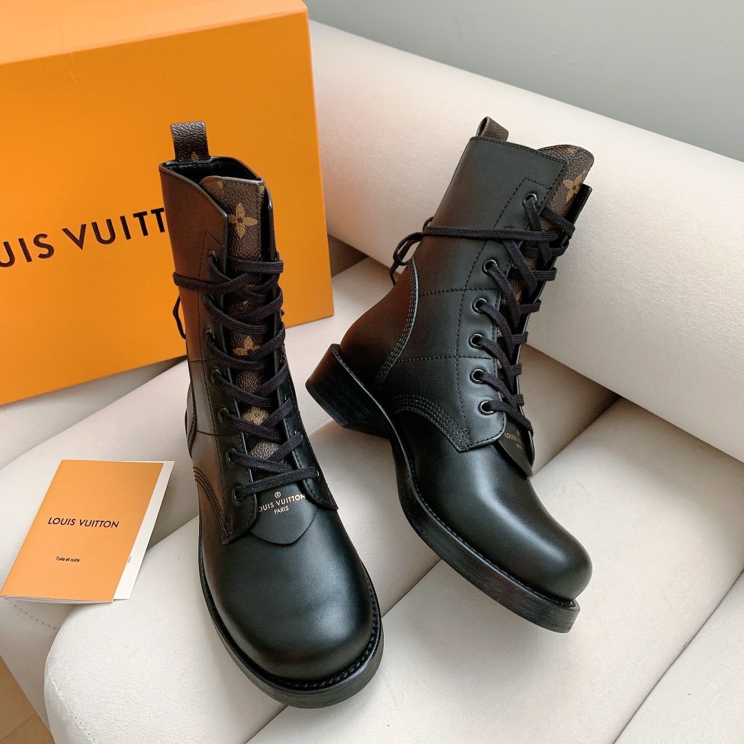Interprétation raffinée de la botte de combat, les rangers Metropolis de Louis Vuitton allient caractère urbain et savoir-faire traditionnel. Ce modèle se distingue par son cuir noir lisse contrasté par des touches de toile Monogram sur la languette et le haut de la tige. Rehaussées d’une signature dorée, ces bottines intemporelles offrent une silhouette à la fois robuste et élégante pour un style quotidien affirmé