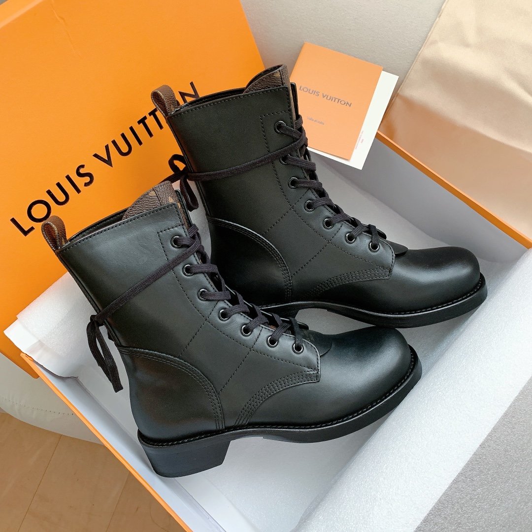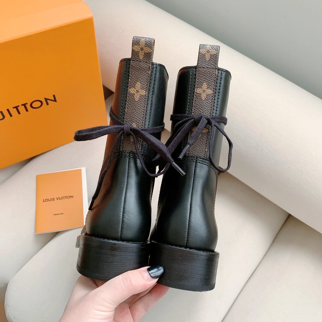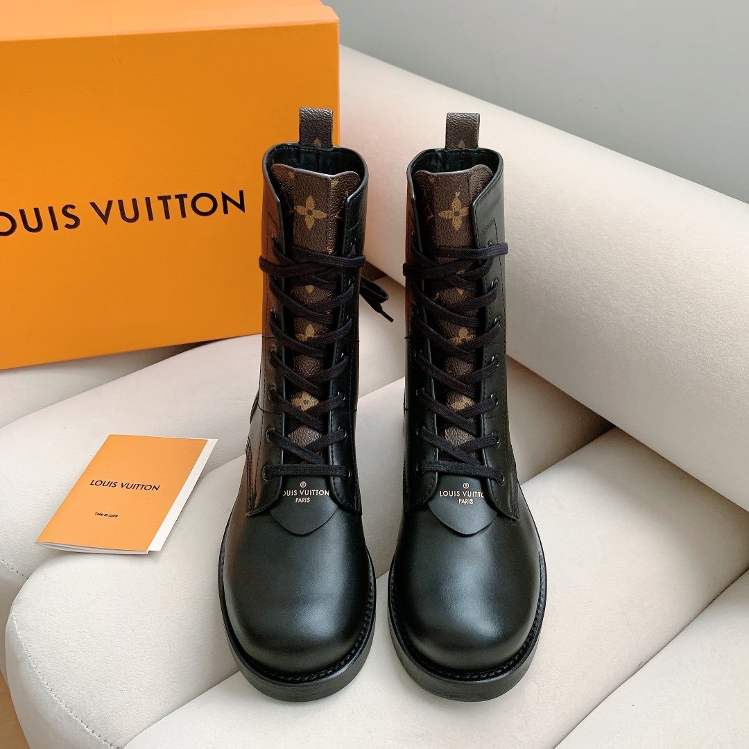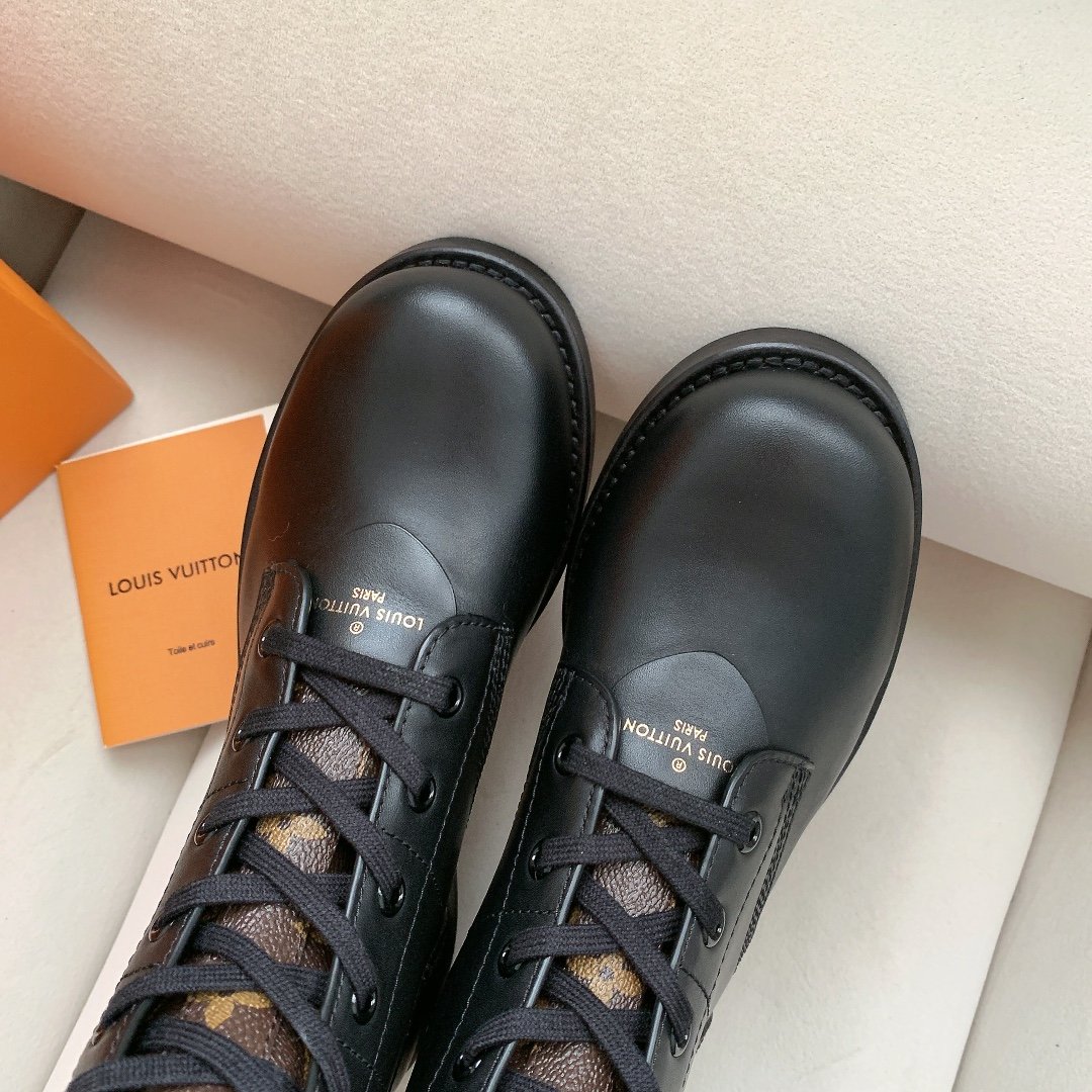 Interprétation raffinée de la botte de combat, les rangers Metropolis de Louis Vuitton allient caractère urbain et savoir-faire traditionnel. Ce modèle se distingue par son cuir noir lisse contrasté par des touches de toile Monogram sur la languette et le haut de la tige. Rehaussées d’une signature dorée, ces bottines intemporelles offrent une silhouette à la fois robuste et élégante pour un style quotidien affirmé