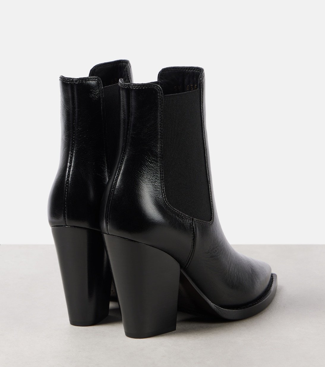 Hybrides entre la santiag et la Chelsea, les bottines Theo sont une création de Saint Laurent. Confectionnées en Italie en cuir lustré noir, elles élancent la silhouette de leur talon bloc vertigineux de 9,5. Portez-les aussi bien avec une robe courte qu’avec un tailleur de la griffe.