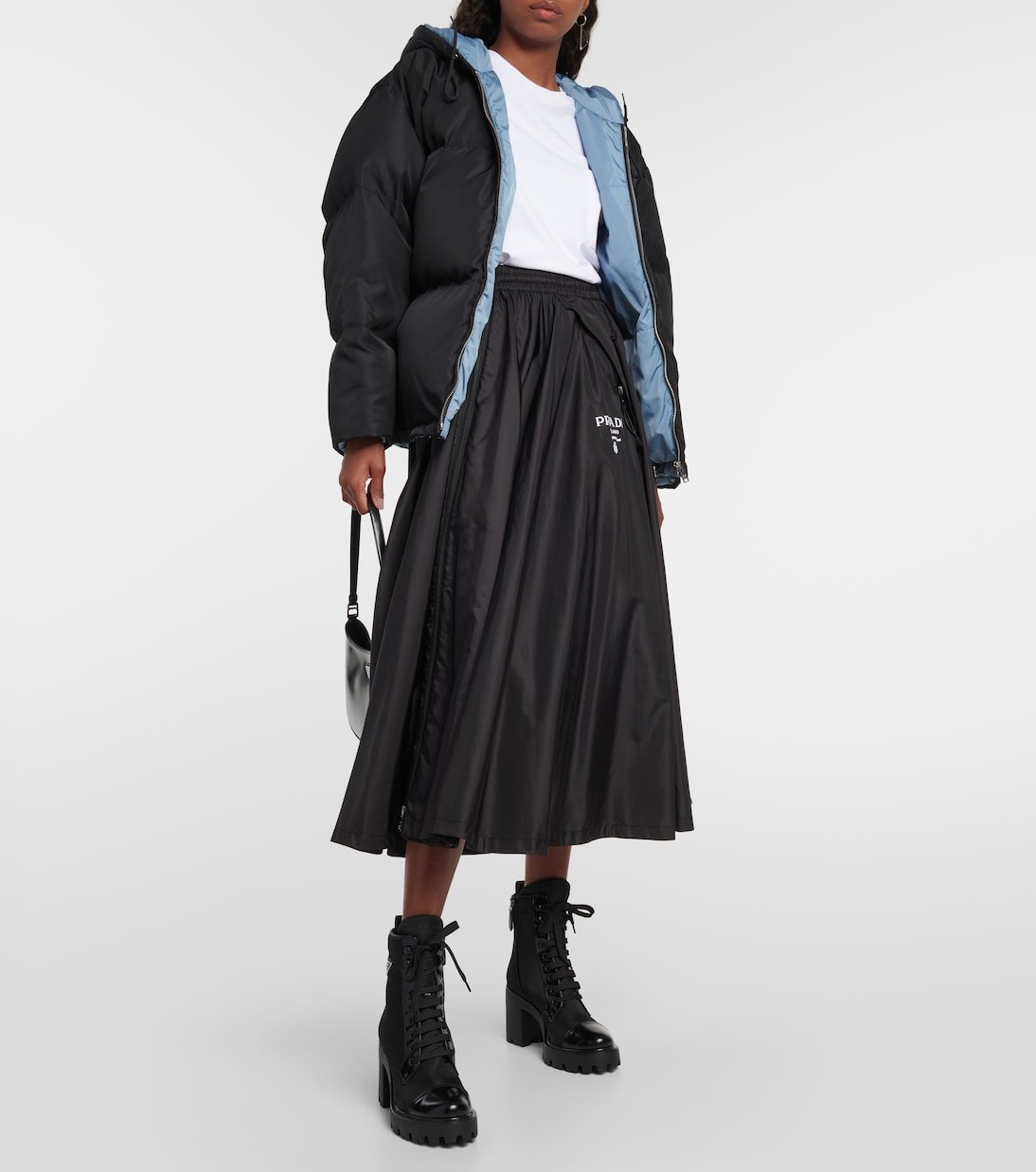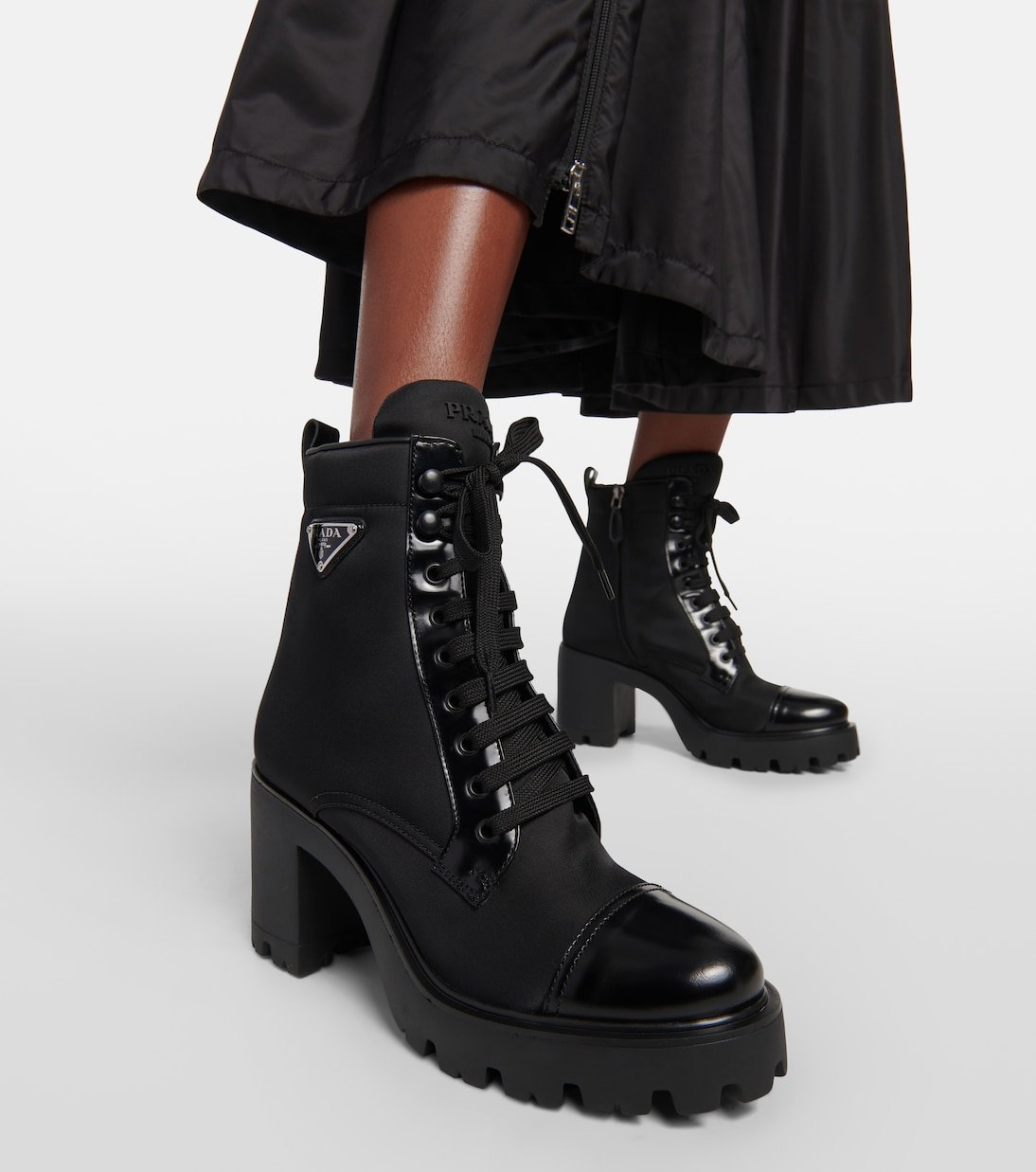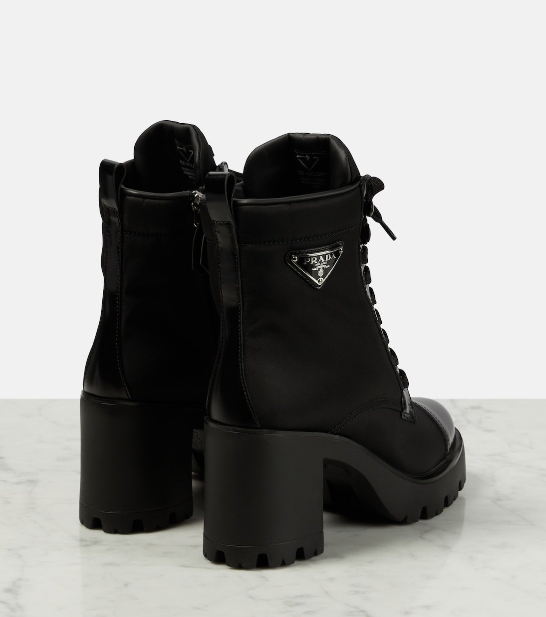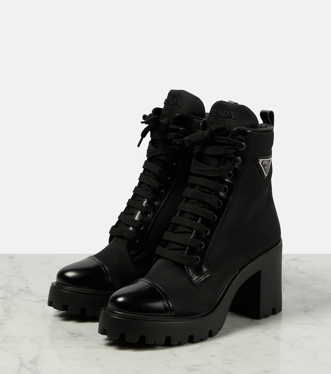 Ces bottines à lacets de Prada associent du cuir brossé et une étoffe en nylon résistant pour un effet sophistiqué. Montées sur des semelles crantées en caoutchouc, elles sont ornées des logos émaillés emblématiques de la maison.