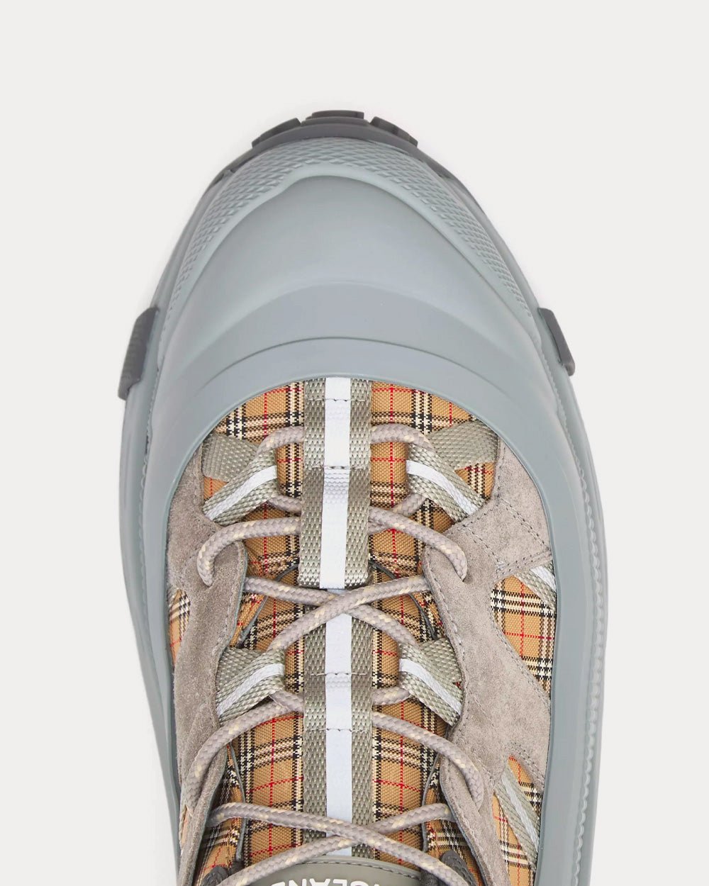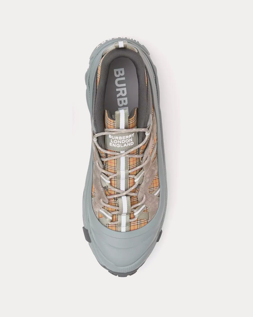 Baskets Burberry de défilé, confectionnées en coton technique à micro-carreaux avec finitions en daim. Elles sont ornées d’un sur-chaussure mat inspiré des bottes de pluie et d’une semelle à détails croisés faisant référence à notre emblématique motif à carreaux.